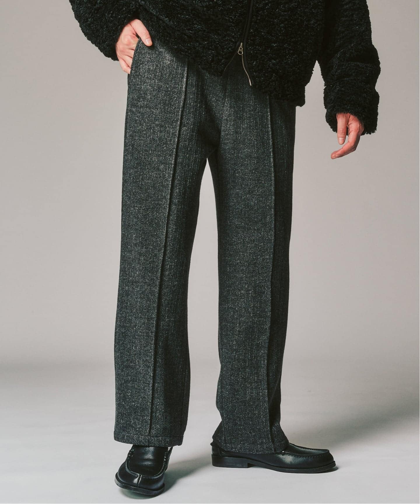 パンツはニットジャージー特有の、あの柔らかい落ち感。歩くたびにストンと揺れて、力が入りすぎていない大人の余裕を演出してくれます。センタープレスが入っているから、ラフになりすぎないのもポイント。