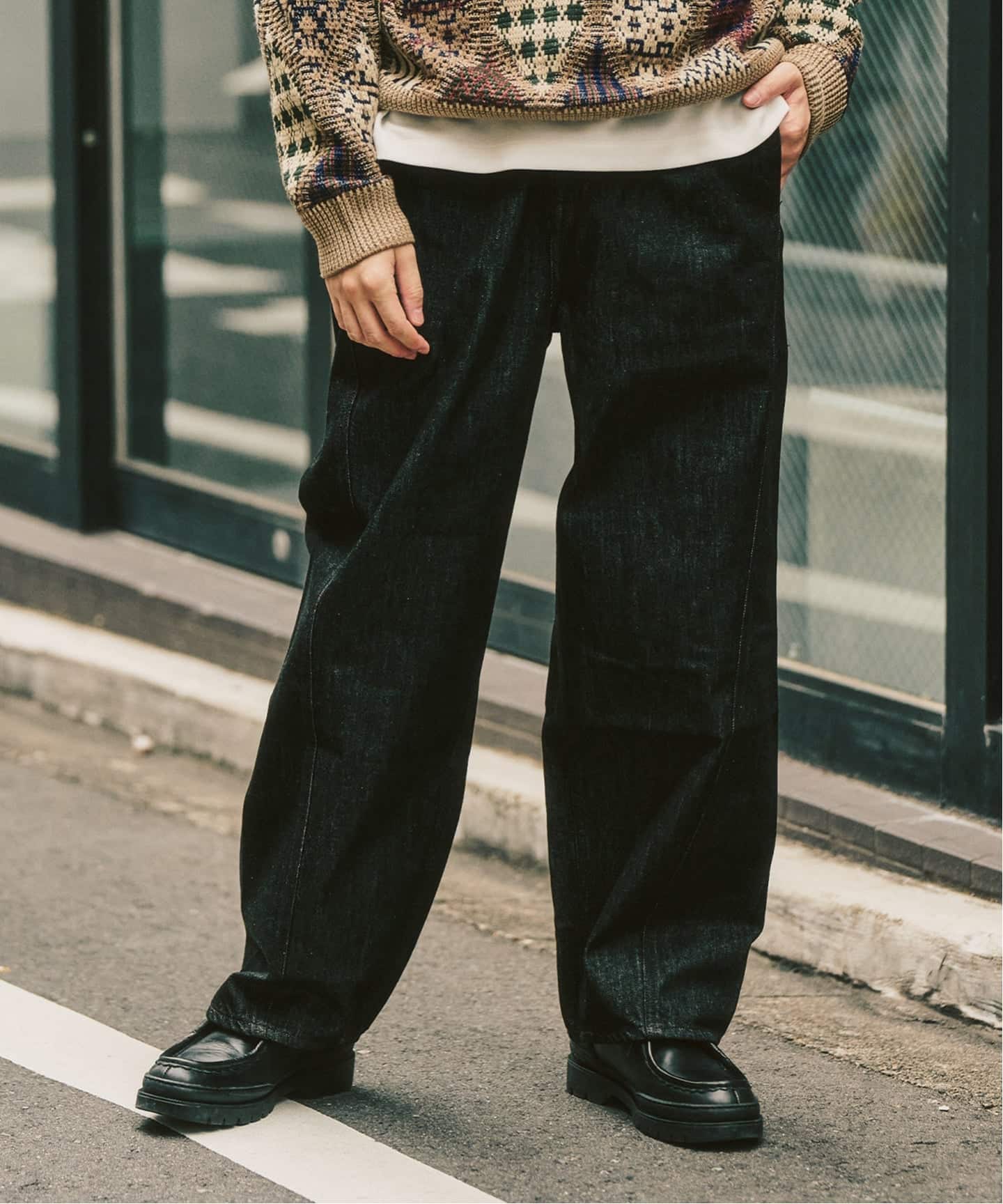デニムは立体的に見える“3Dパターン”だから、ワイドでもだらしなく見えない。履いたときのレッグラインがほんときれいで、ニットみたいな存在感のあるトップスと相性抜群。