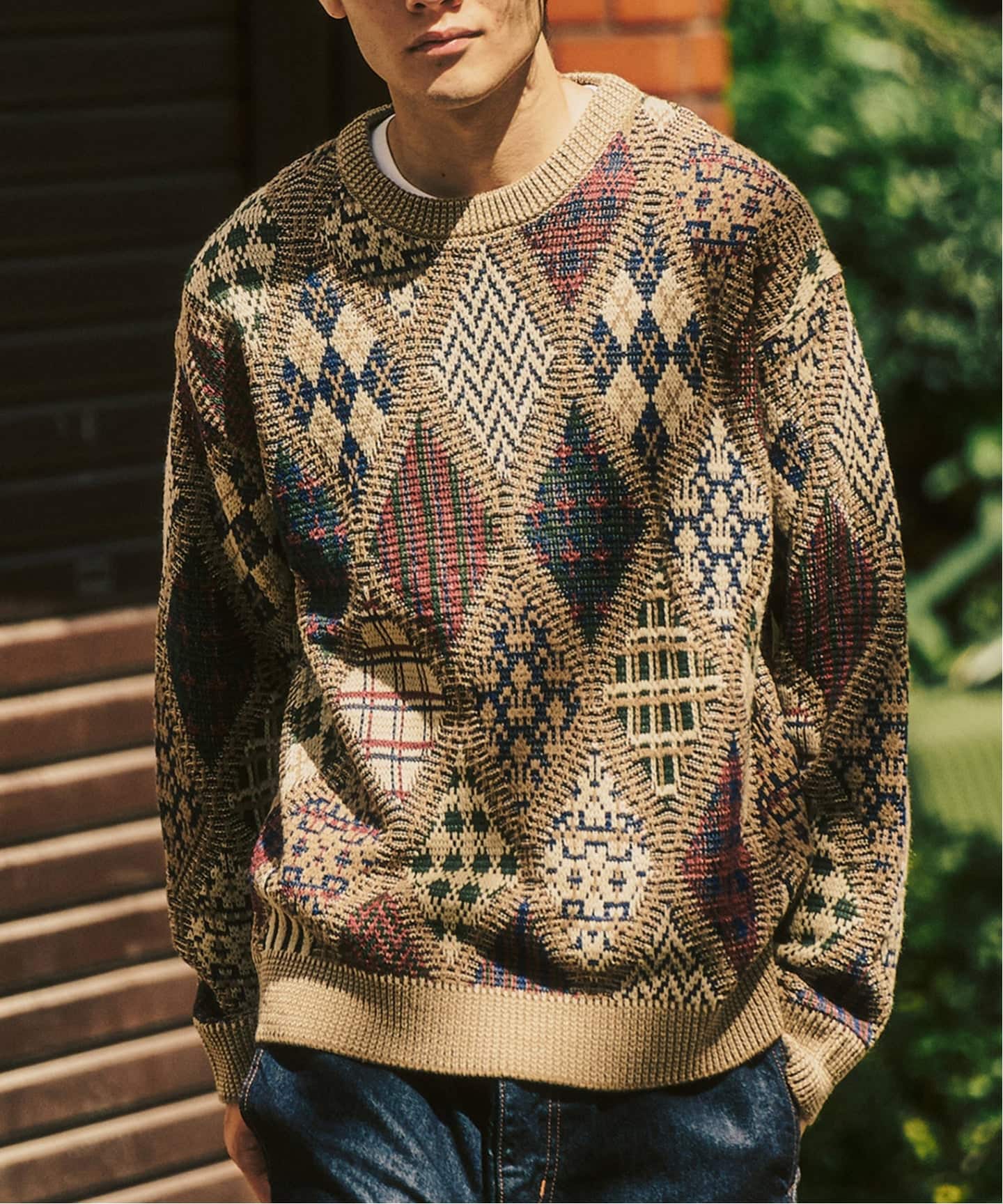 まずこのニット、柄はクラシックなのに雰囲気はすごく今っぽい。配色が落ち着いているから派手になりすぎず、冬の街にしっかり馴染むタイプ。インナーの蓄熱ロンTを少しだけ覗かせて、ほどよく抜け感を足してるのもポイント。
