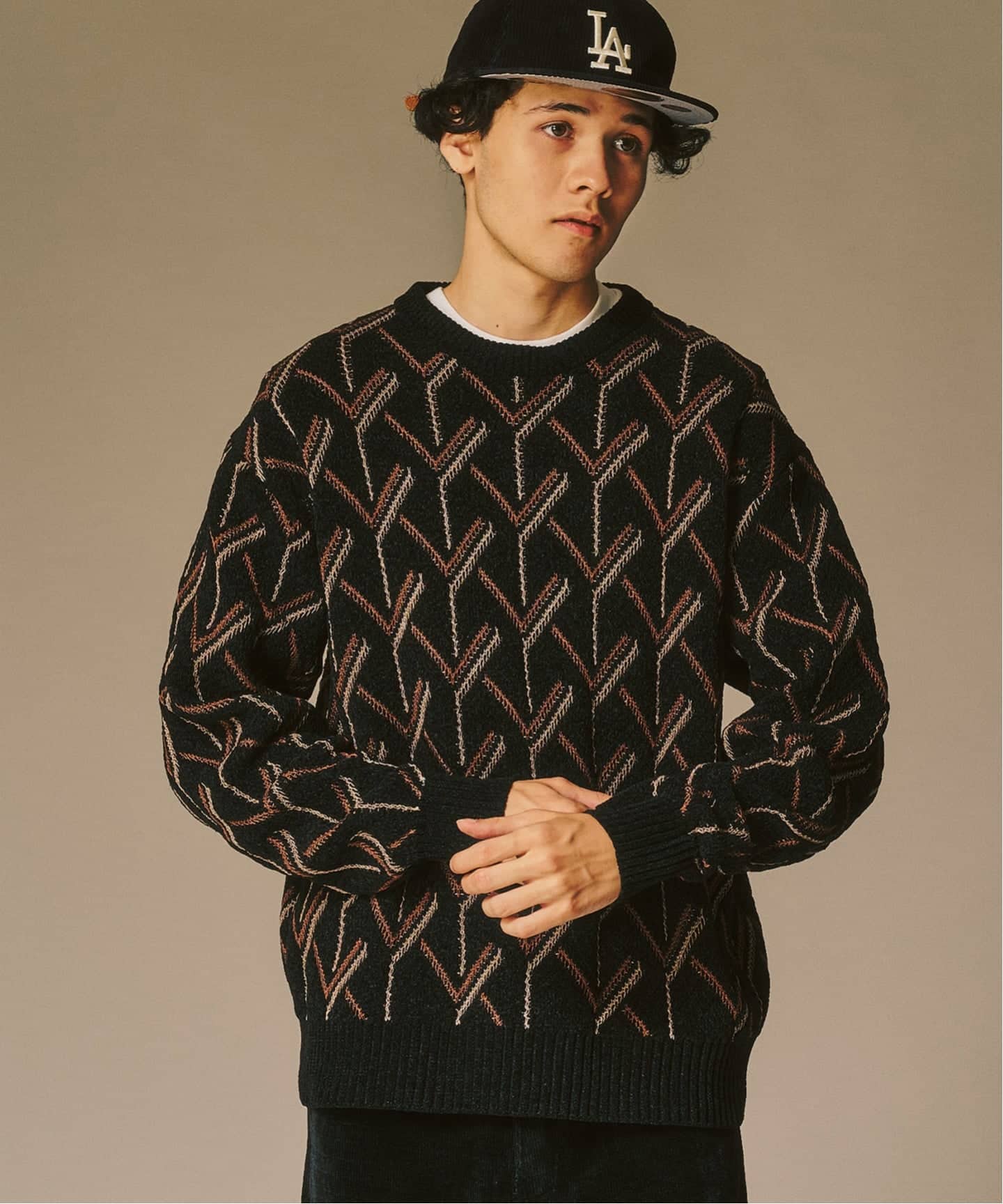 柄ニットを大人っぽく着たい時に、こういう“黒ベースのジオメトリック”は本当に便利。存在感はしっかりあるのに、派手になりすぎず、冬のスタイルに深みが出る。