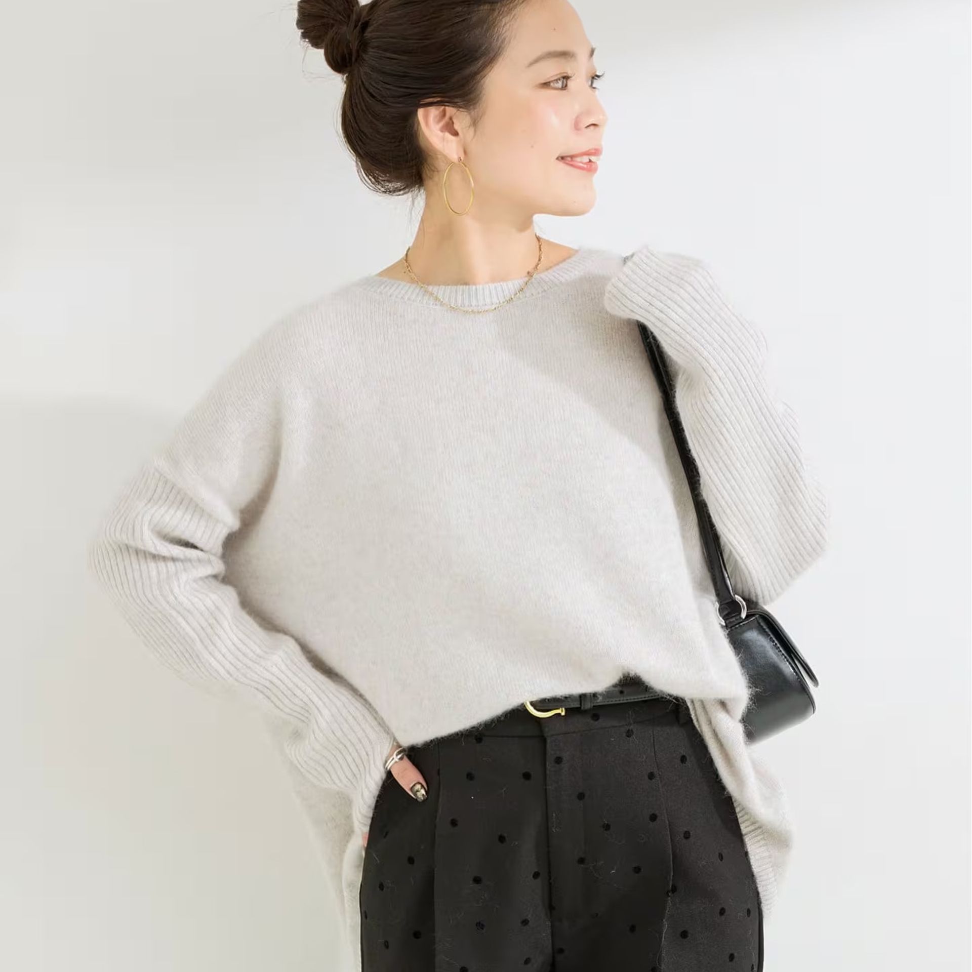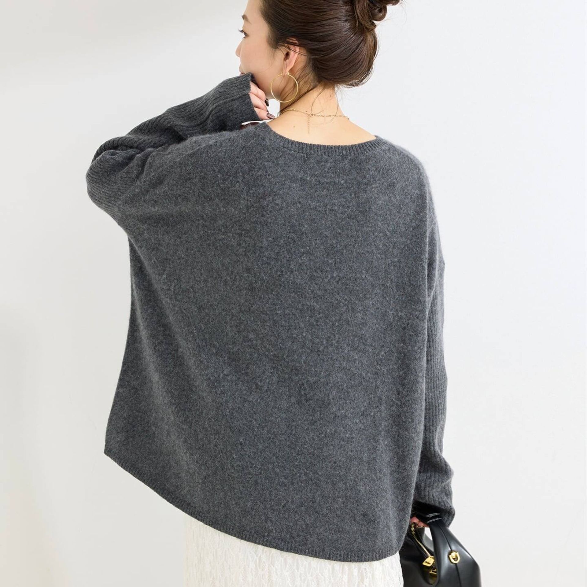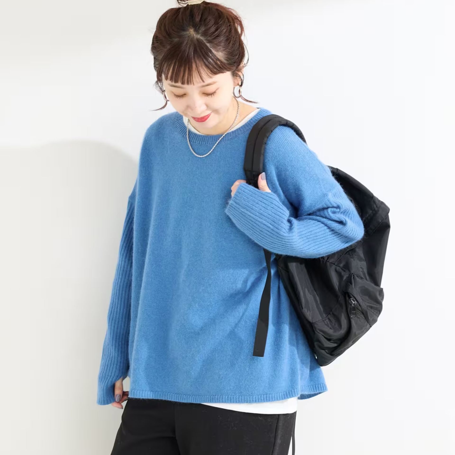 身幅にゆとりのあるワイドなシルエットなので、体のラインを拾いすぎず着やすいニットです。