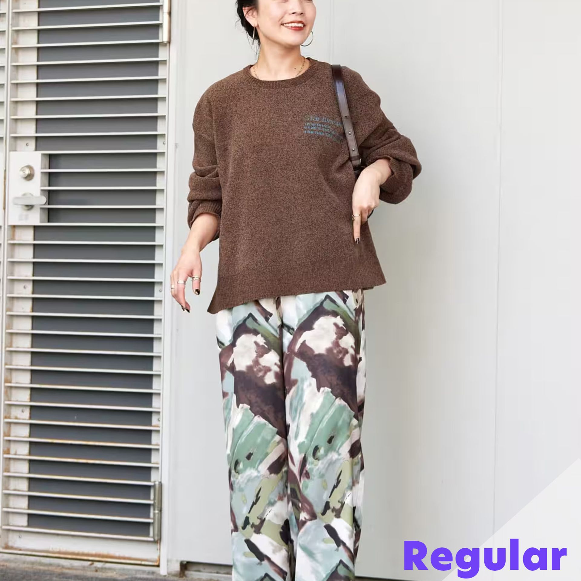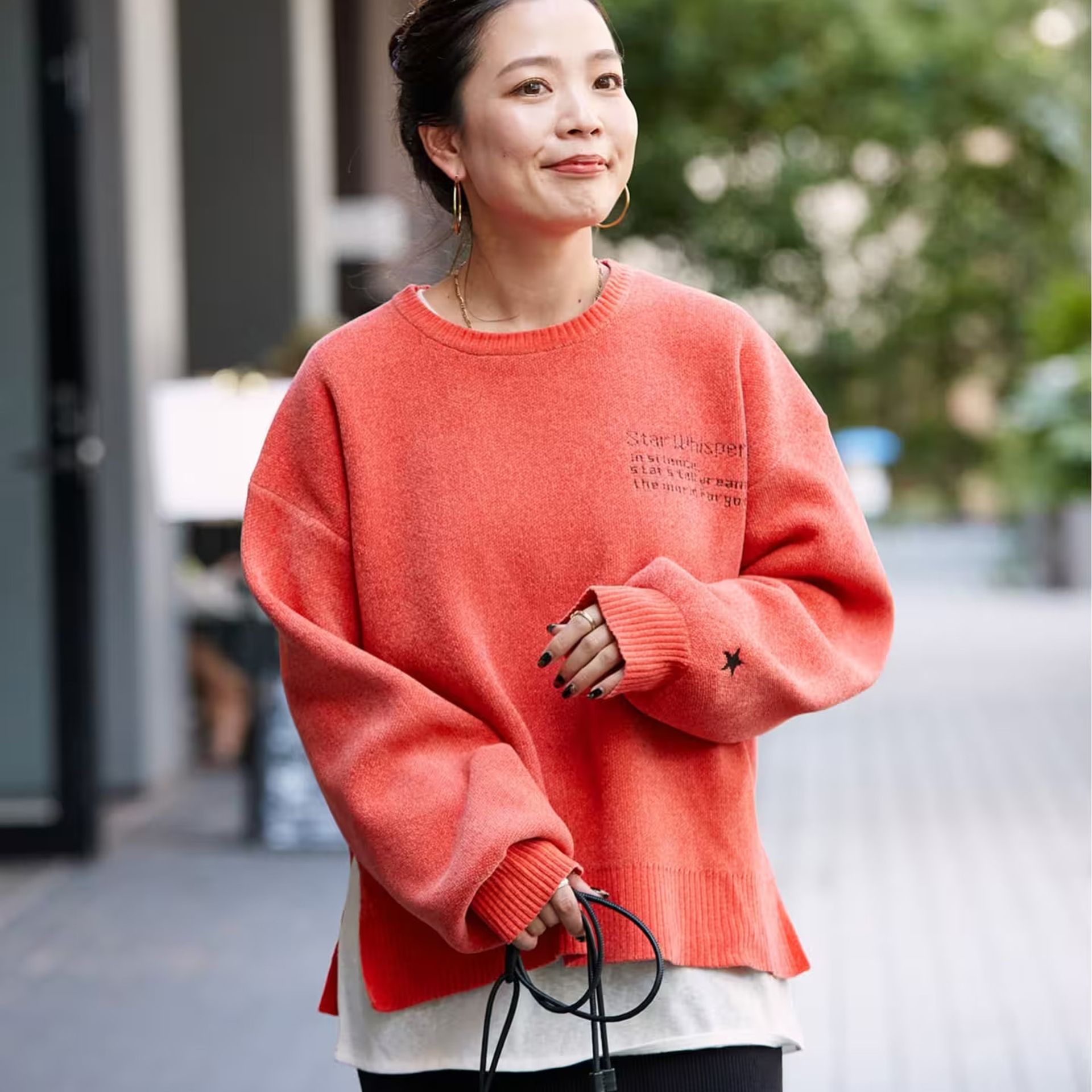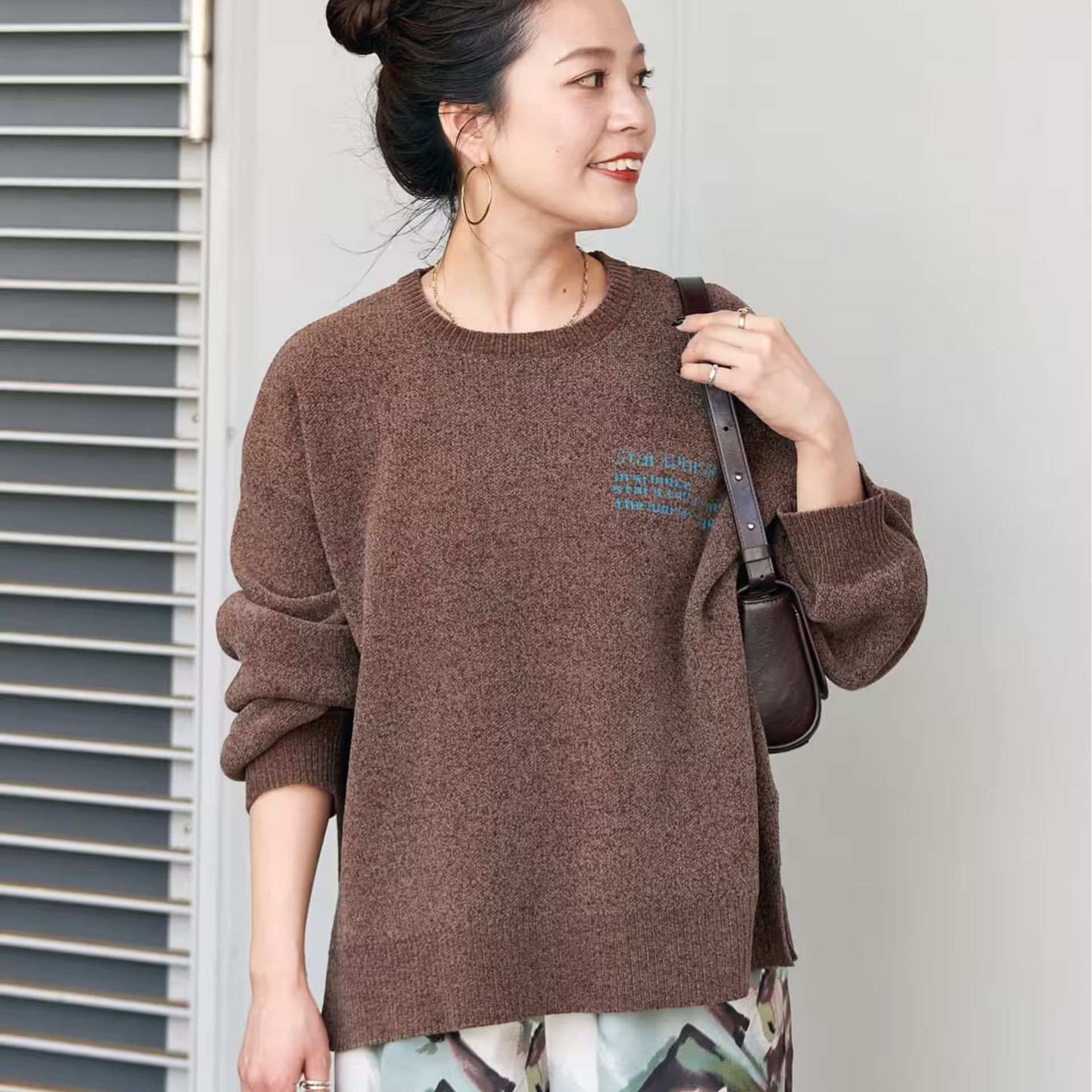 身幅にゆとりのあるワイドなシルエットなので、体のラインを拾いすぎず着やすいニットです。