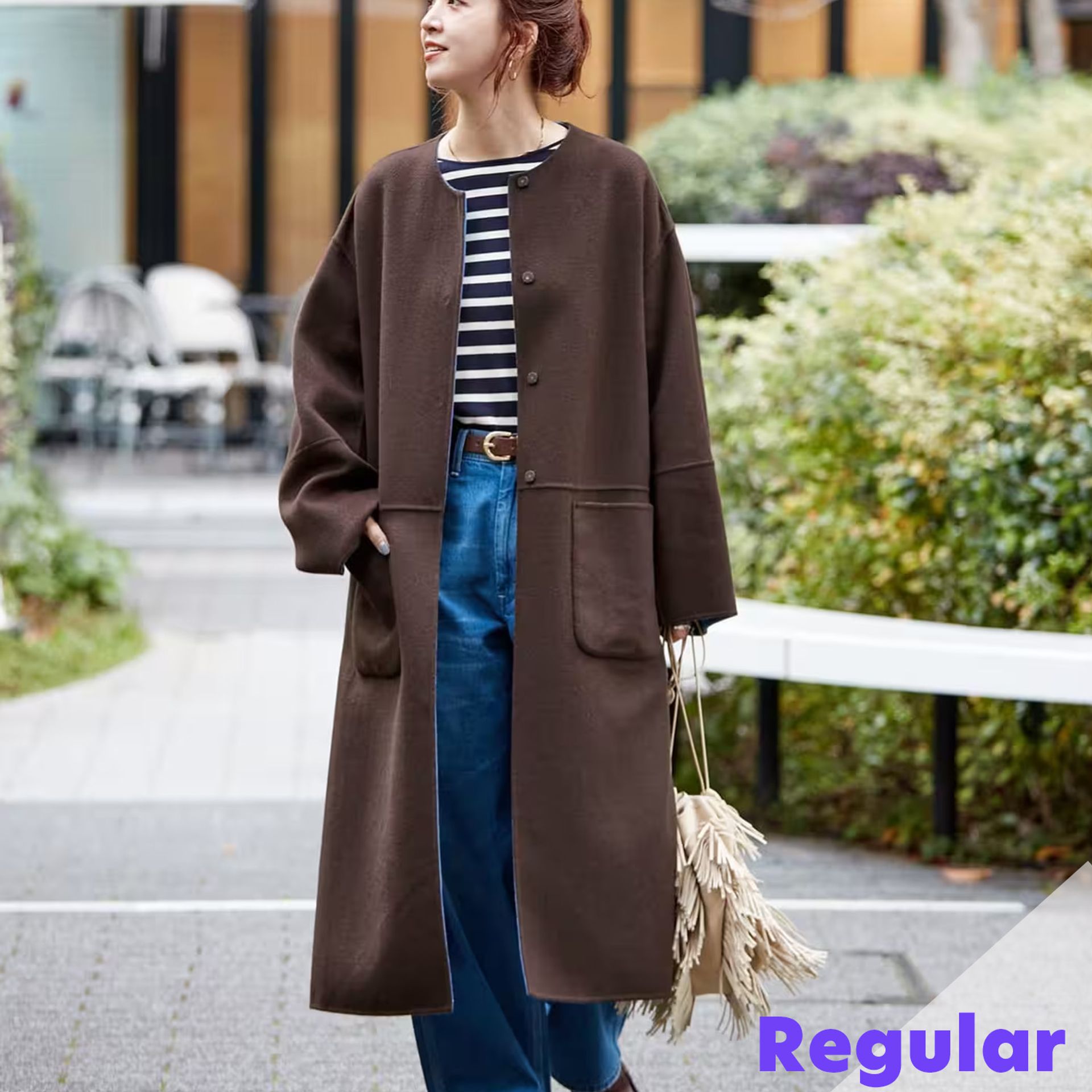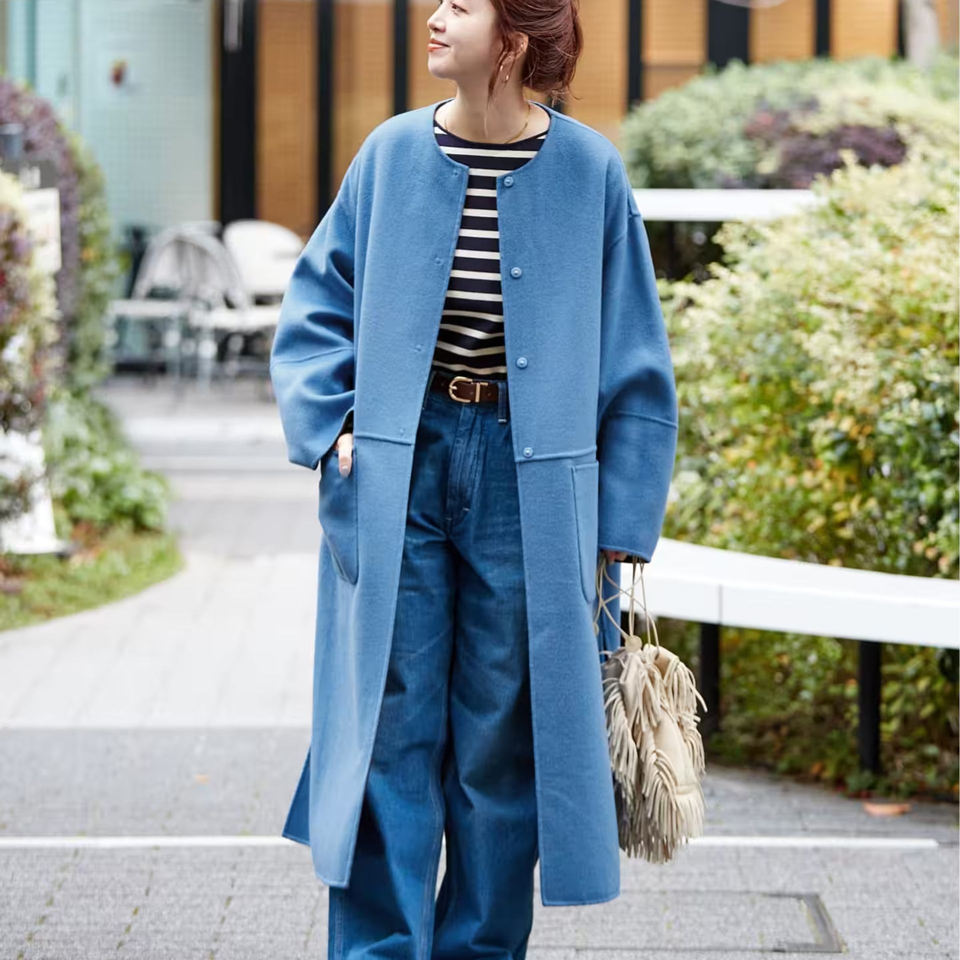 ノーカラーのシンプルなシルエットで、綺麗目にまとめてくれる大人コーデに合わせやすいデザイン。