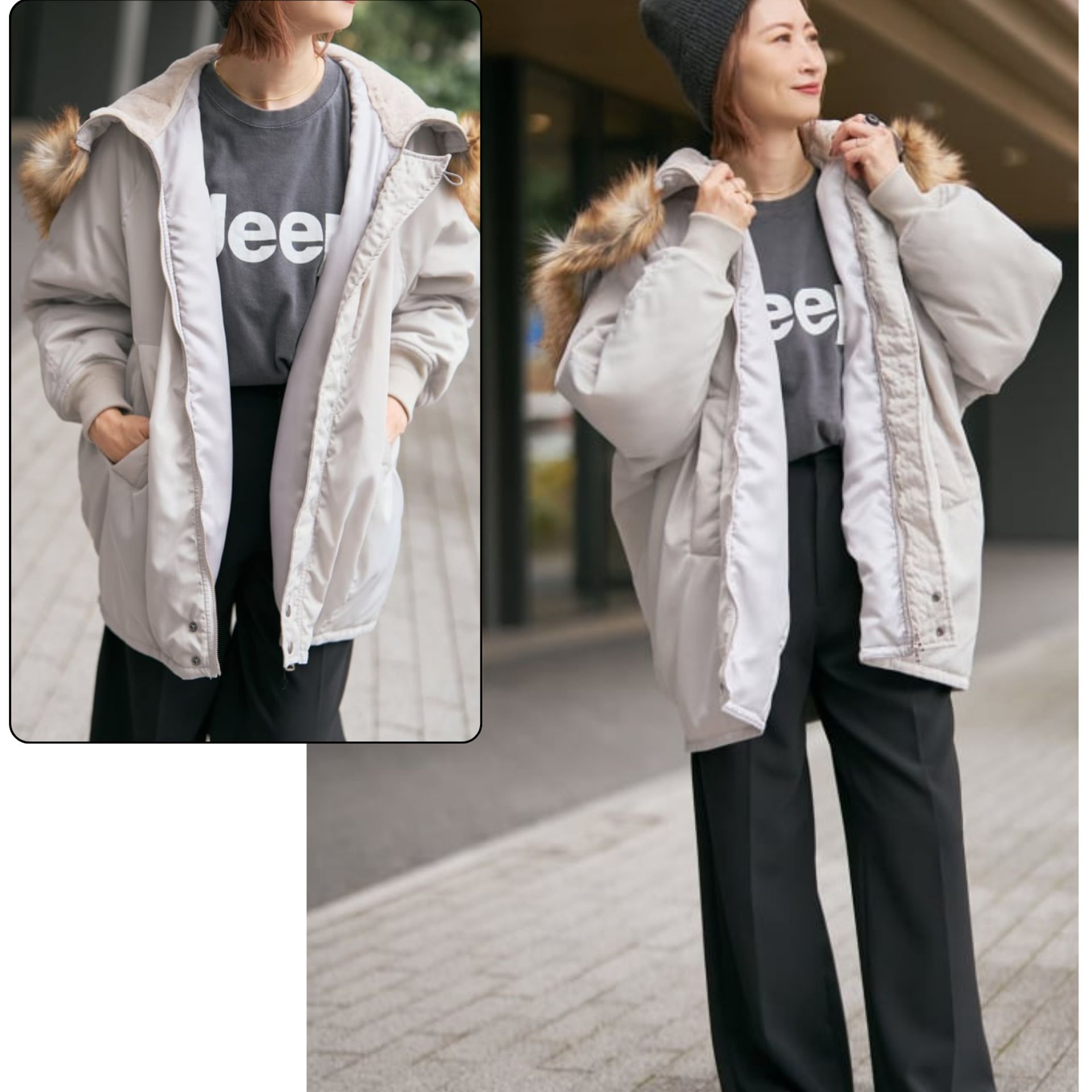 カジュアルにもきれいめにも着回せ、一枚で2つのスタイルを楽しめる冬の頼れるアウターです。