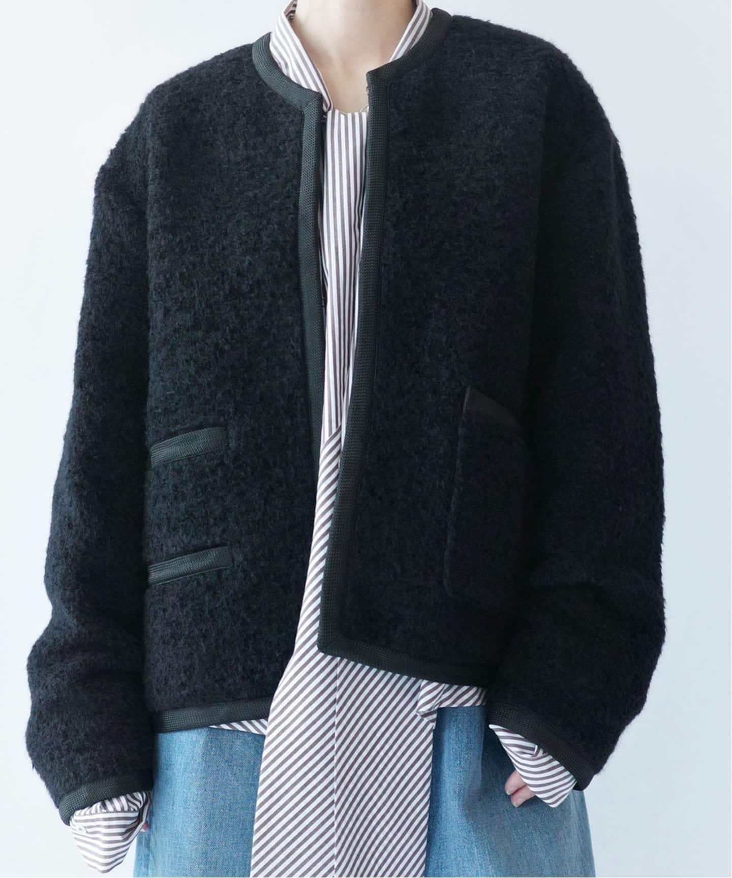 上質なモヘヤ素材を贅沢に使ったノーカラージャケット。羊の毛のようなクルクルとカールした表情のある素材です。太めのテープパイピングとフロントのホック開き、左右のポケットのデザイン違いもポイントです。