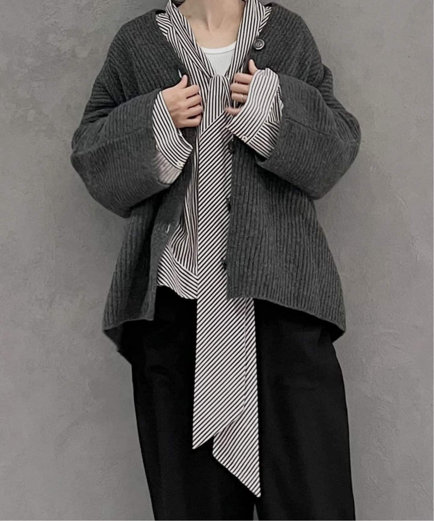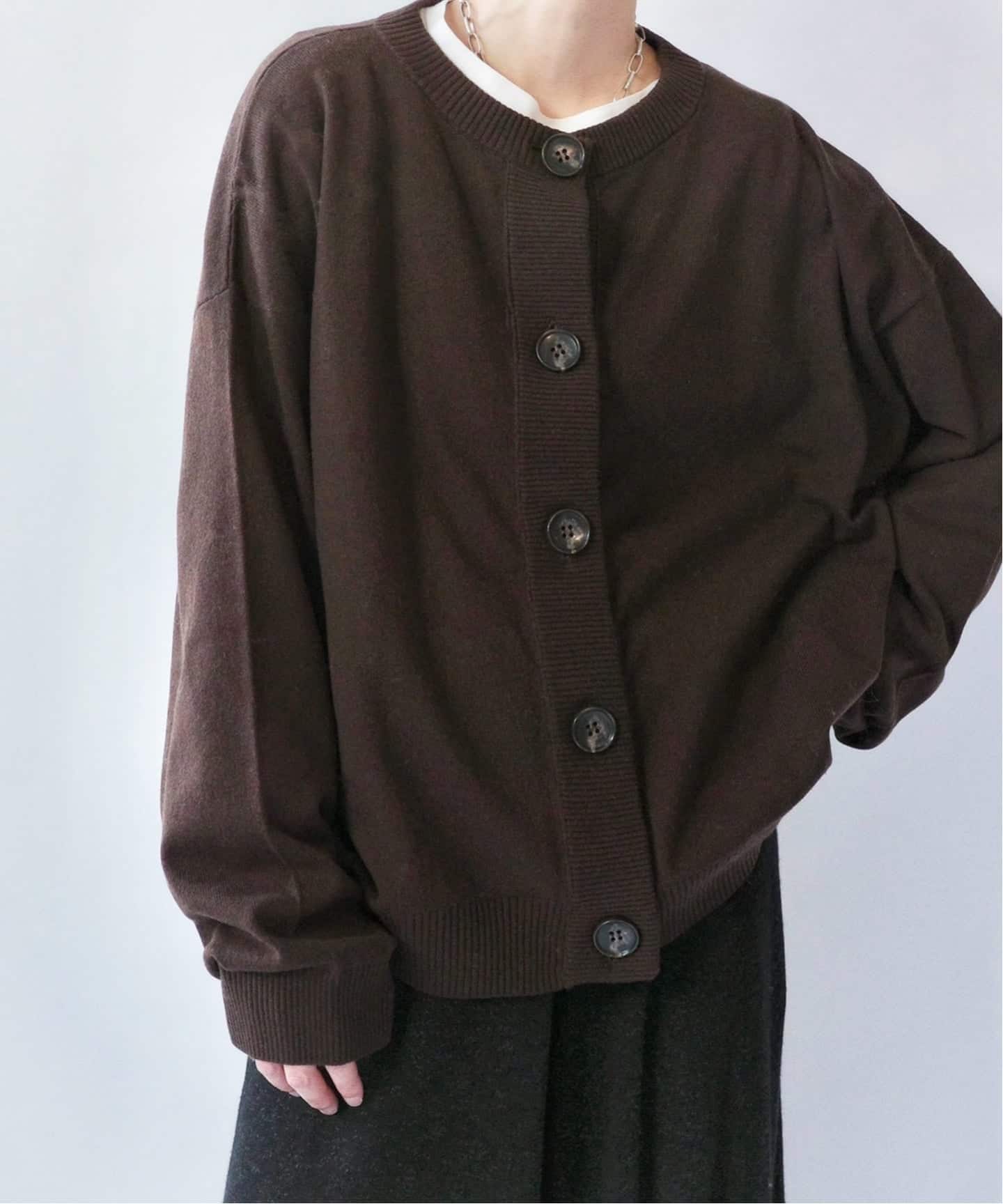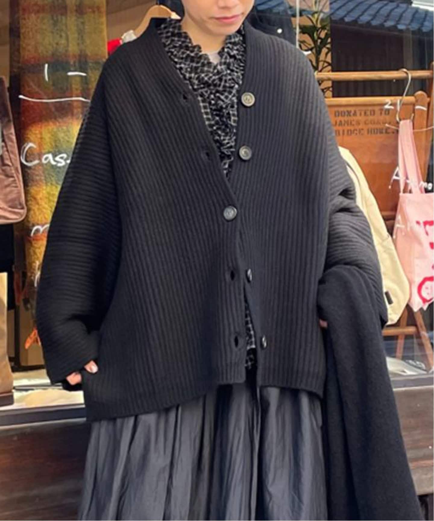 ウール・コットン・ナイロン混紡糸の、ウールの暖かさとコットンの軽さが特徴のカーディガン。動きやすく丸みのあるシルエットをベースに、大きめのボタンと縦横のリブ使いがポイントです。