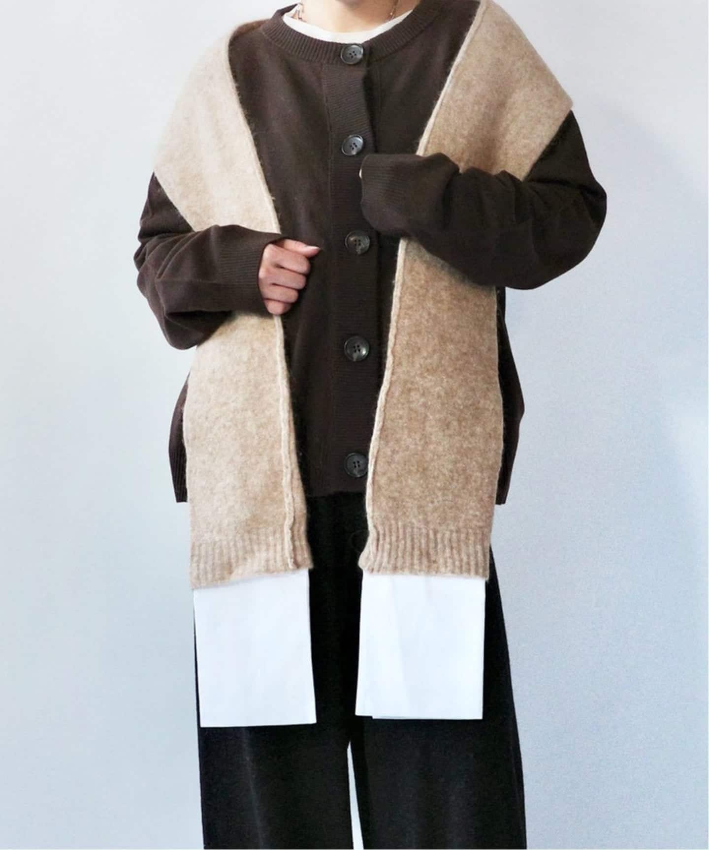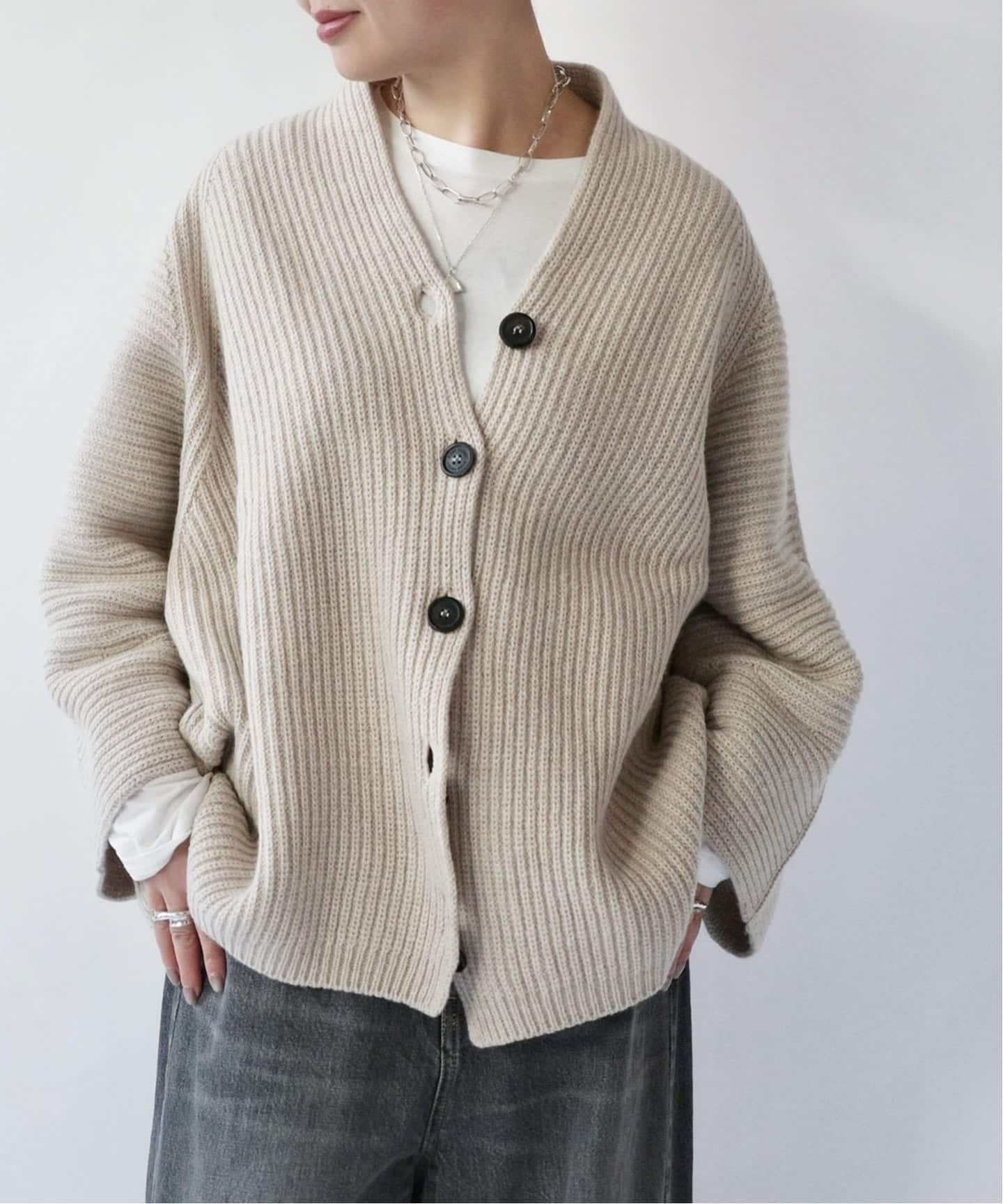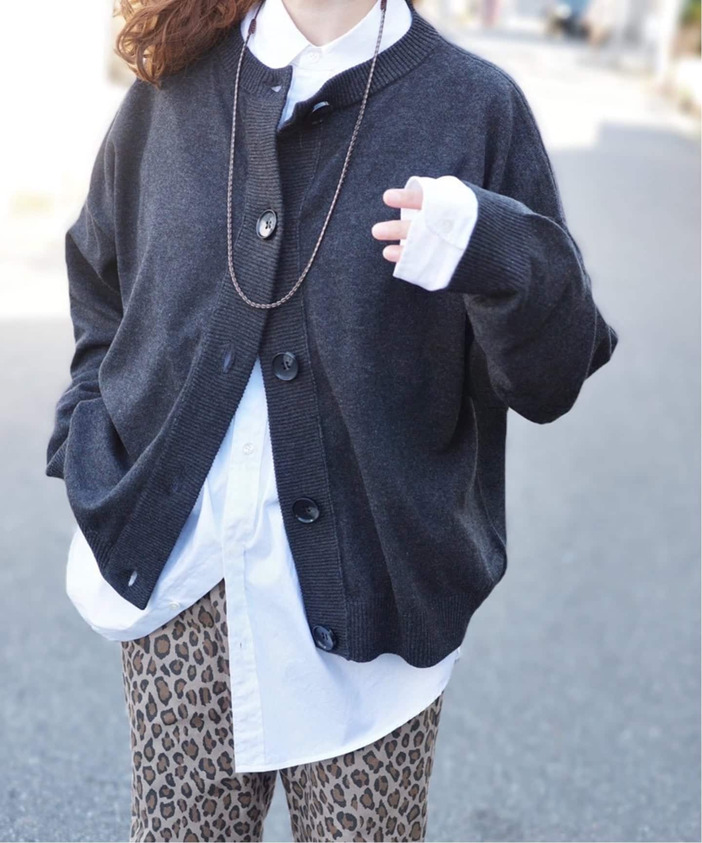 ウール・コットン・ナイロン混紡糸の、ウールの暖かさとコットンの軽さが特徴のカーディガン。動きやすく丸みのあるシルエットをベースに、大きめのボタンと縦横のリブ使いがポイントです。