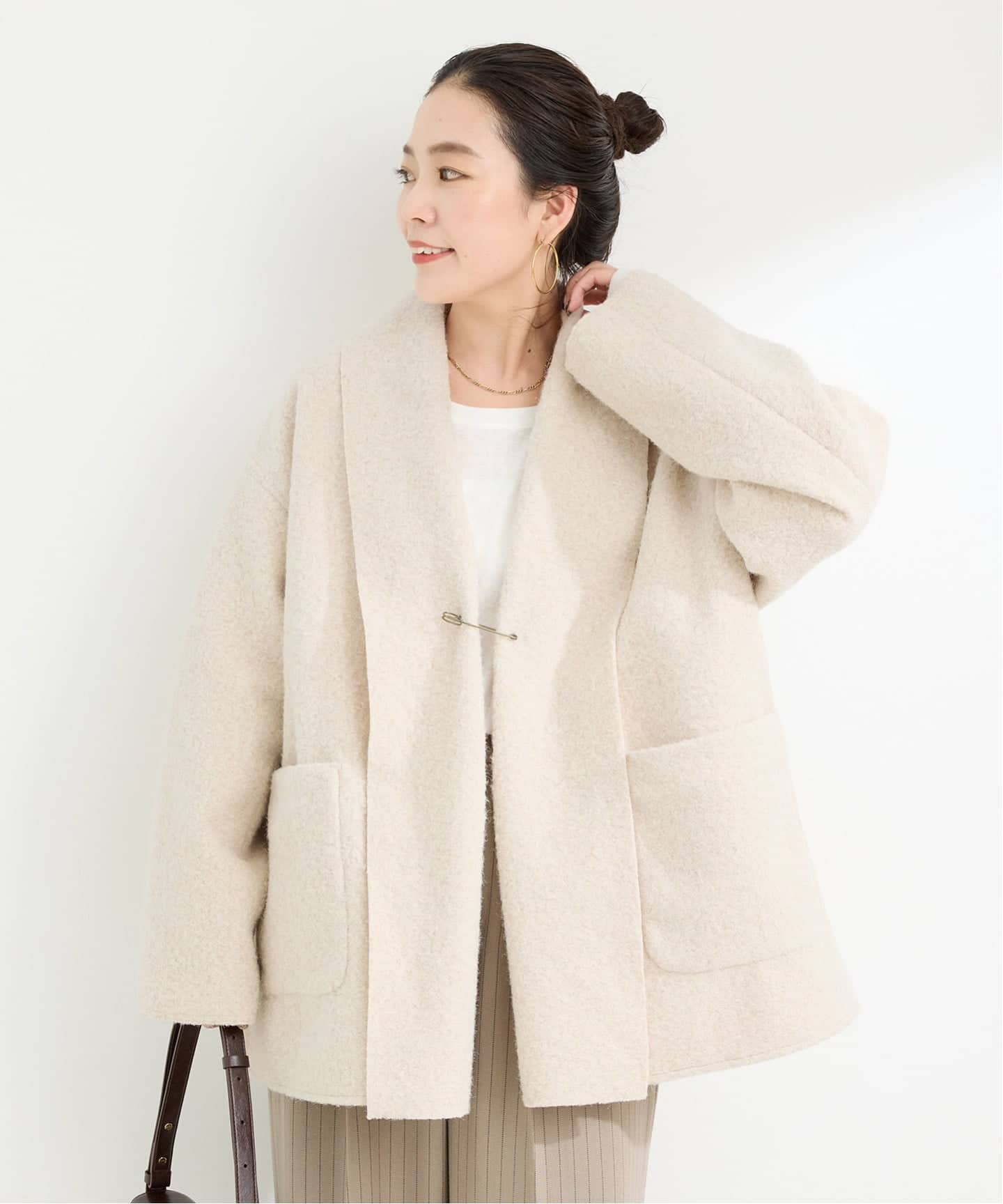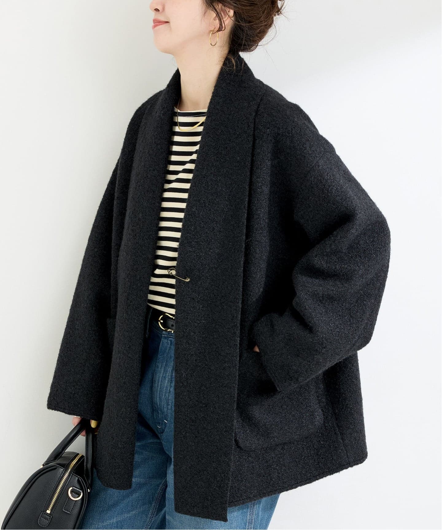 ジャージタイプのブークレー素材を使用した、さっと羽織りやすい着流しコートです。裏地のないシンプルな仕立て、ヒップが隠れるミドル丈でお作りし、季節の変わり目や軽めのアウターが欲しいときにぴったりの一枚となっています。付属のキルトピンで前を留めても着用いただけます。