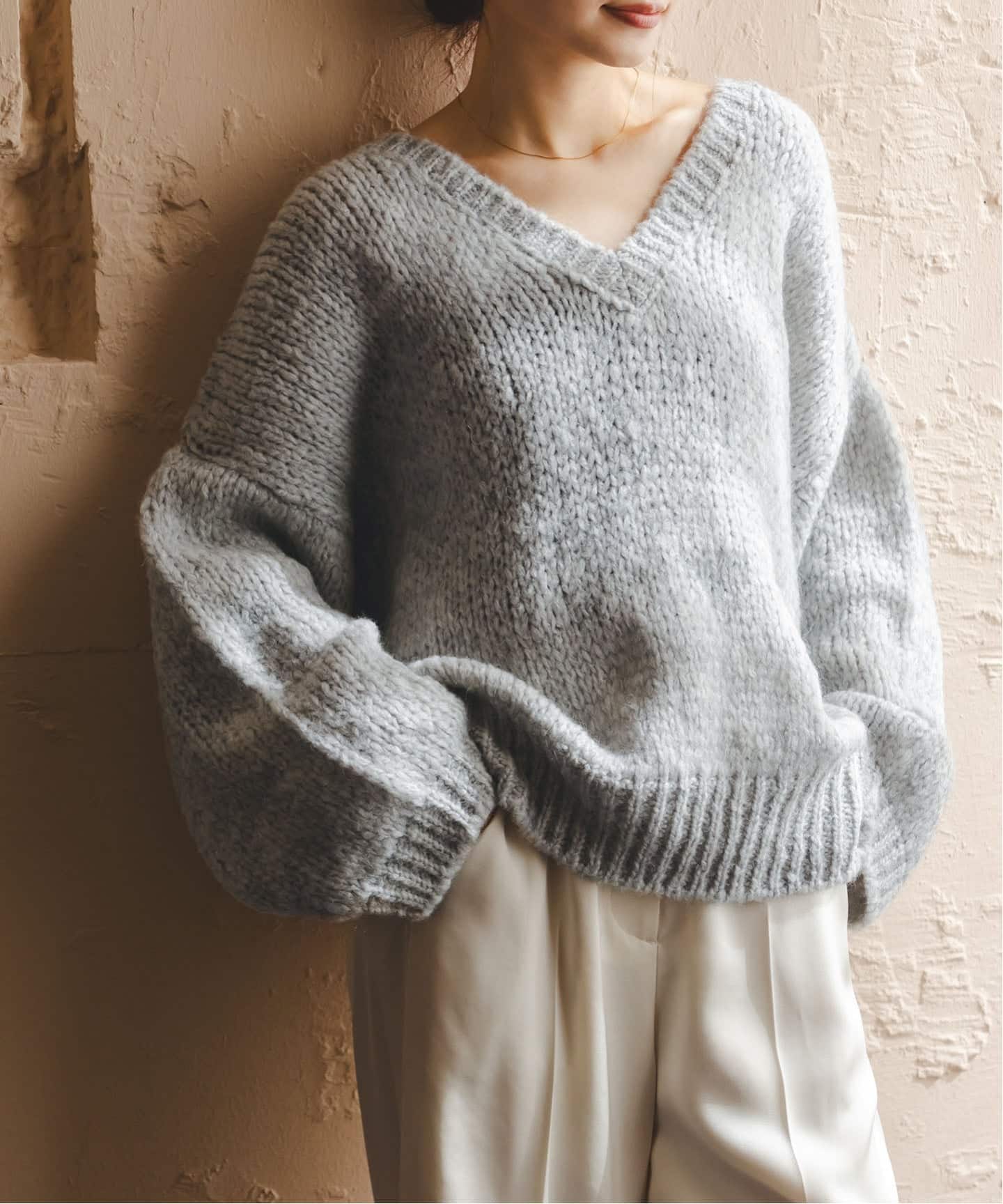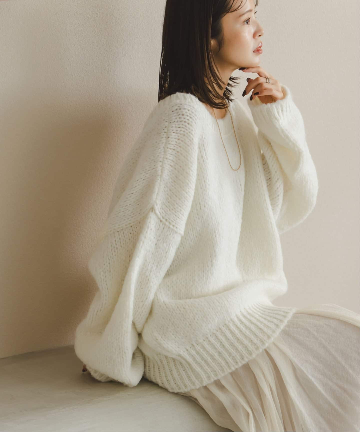 ざっくりと編まれたモヘア混のふんわりとした風合いで、シーズンムード満点の1枚。