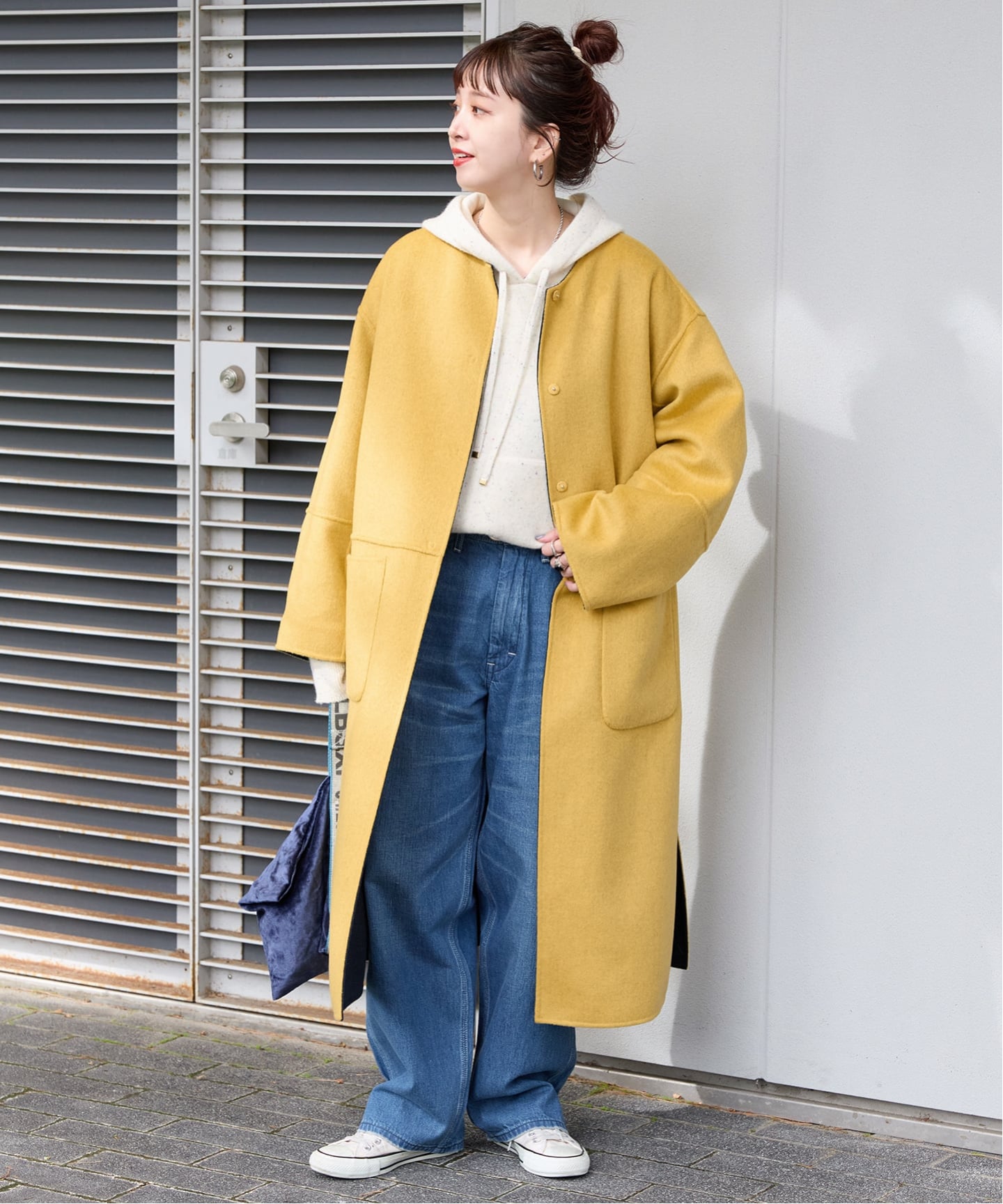 裏面のイエローとフードパーカーを合わせた首元のレイヤードで遊び心をプラス。