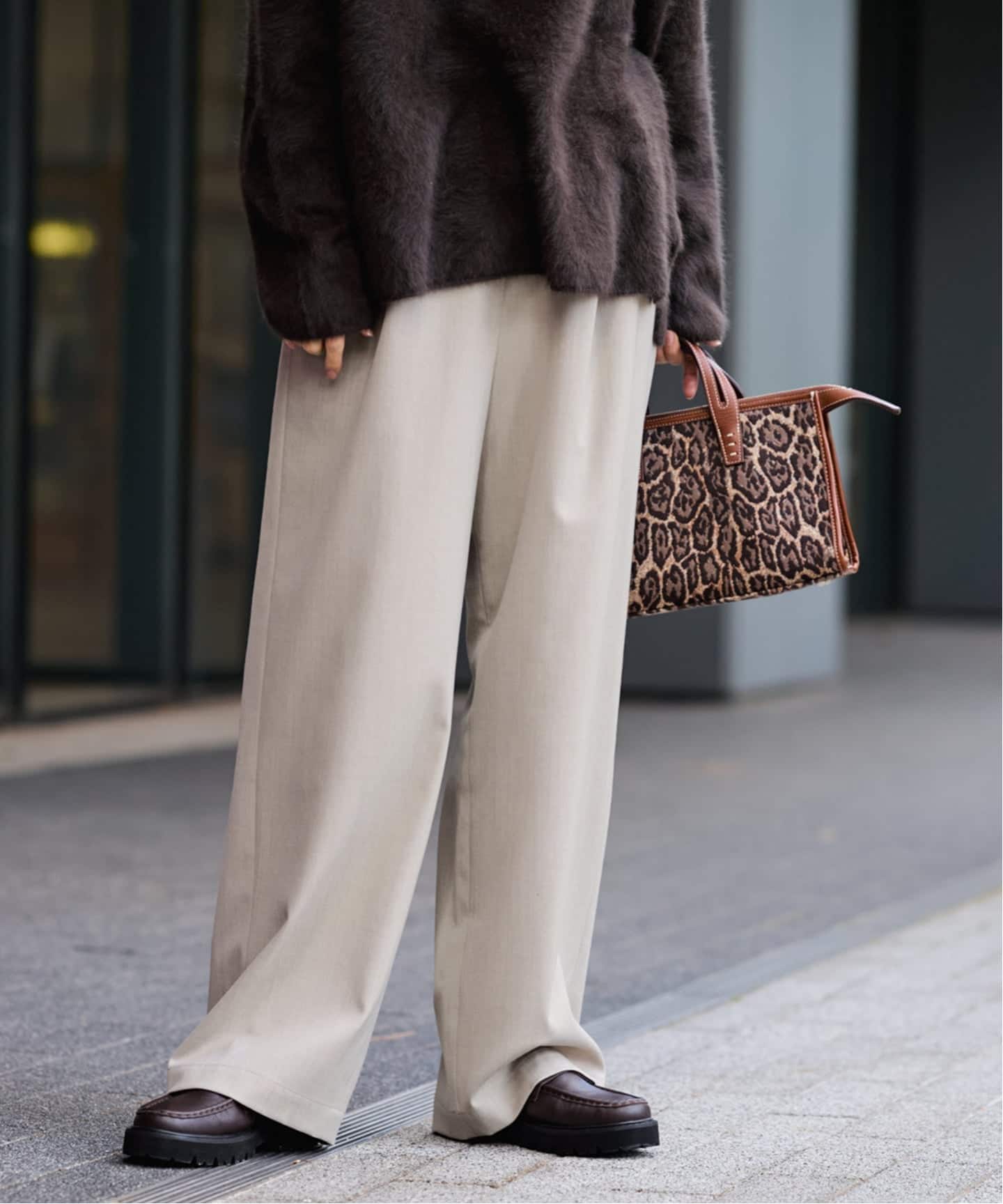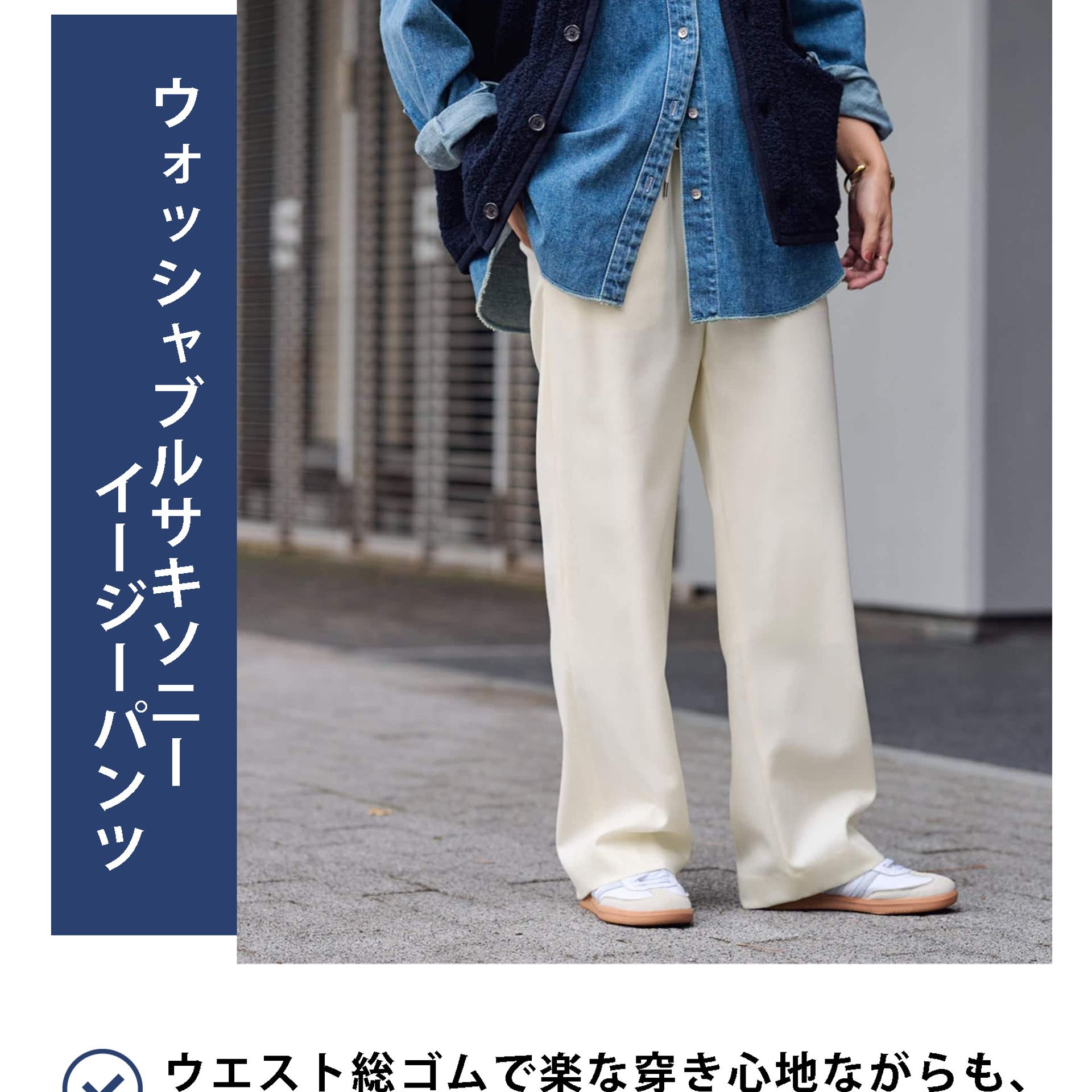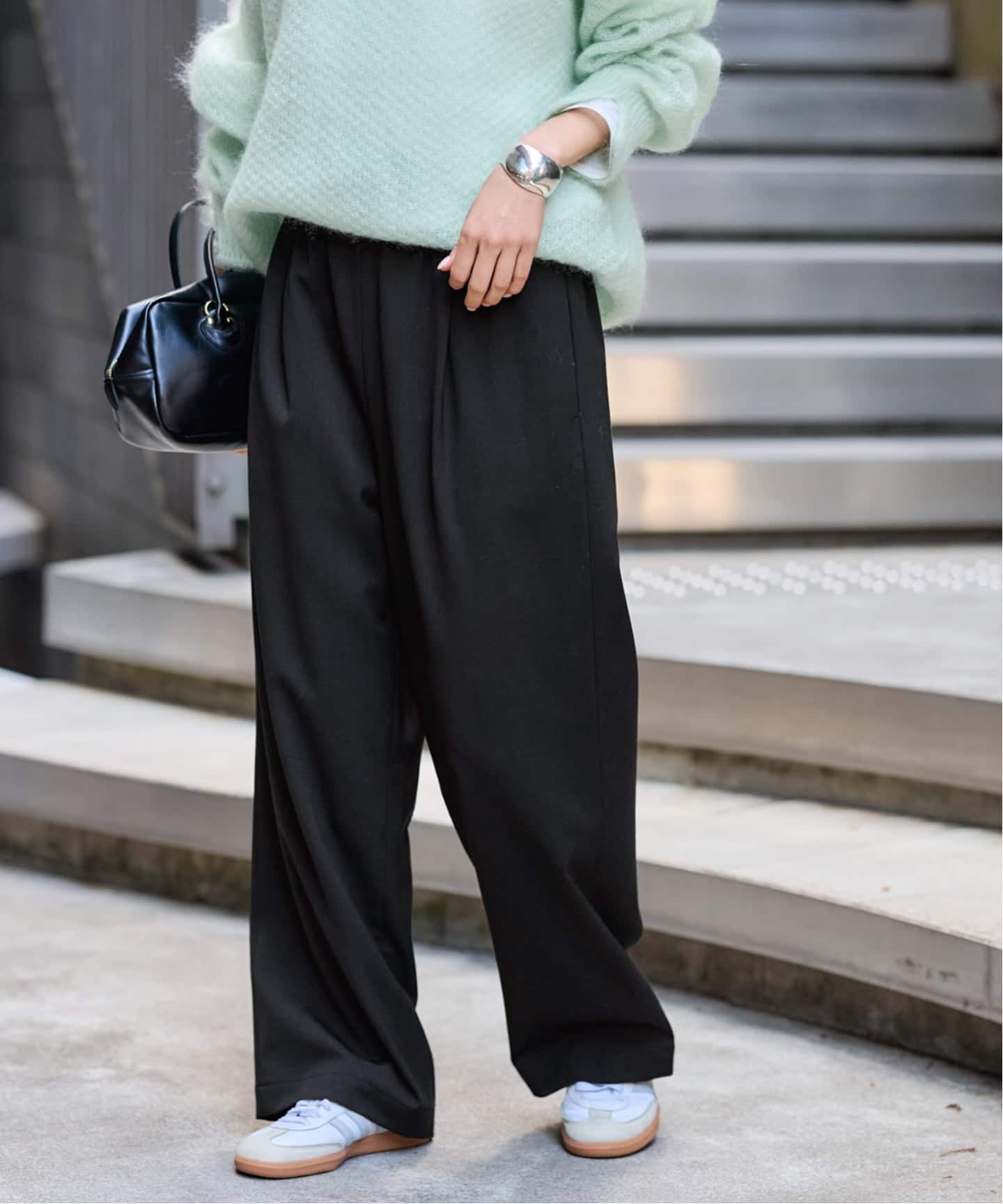 リラックス感漂うイージーパンツながら、タックをとることで腰まわりはすっきり見えるように。