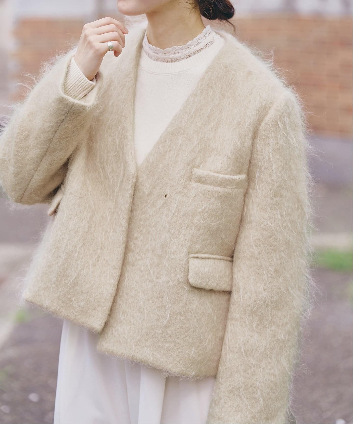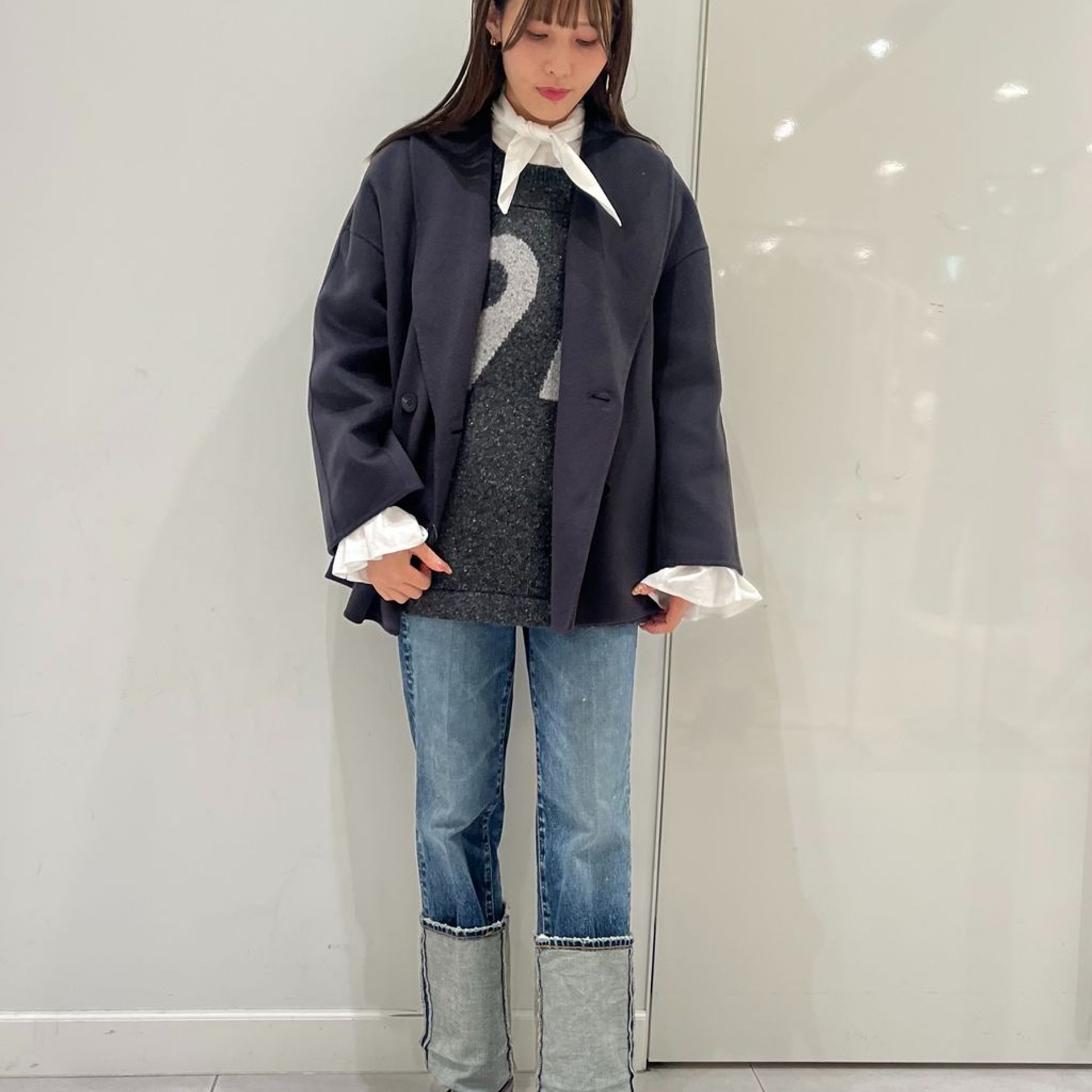 5℃前後は、厚手ニットとコートのレイヤードが主役。