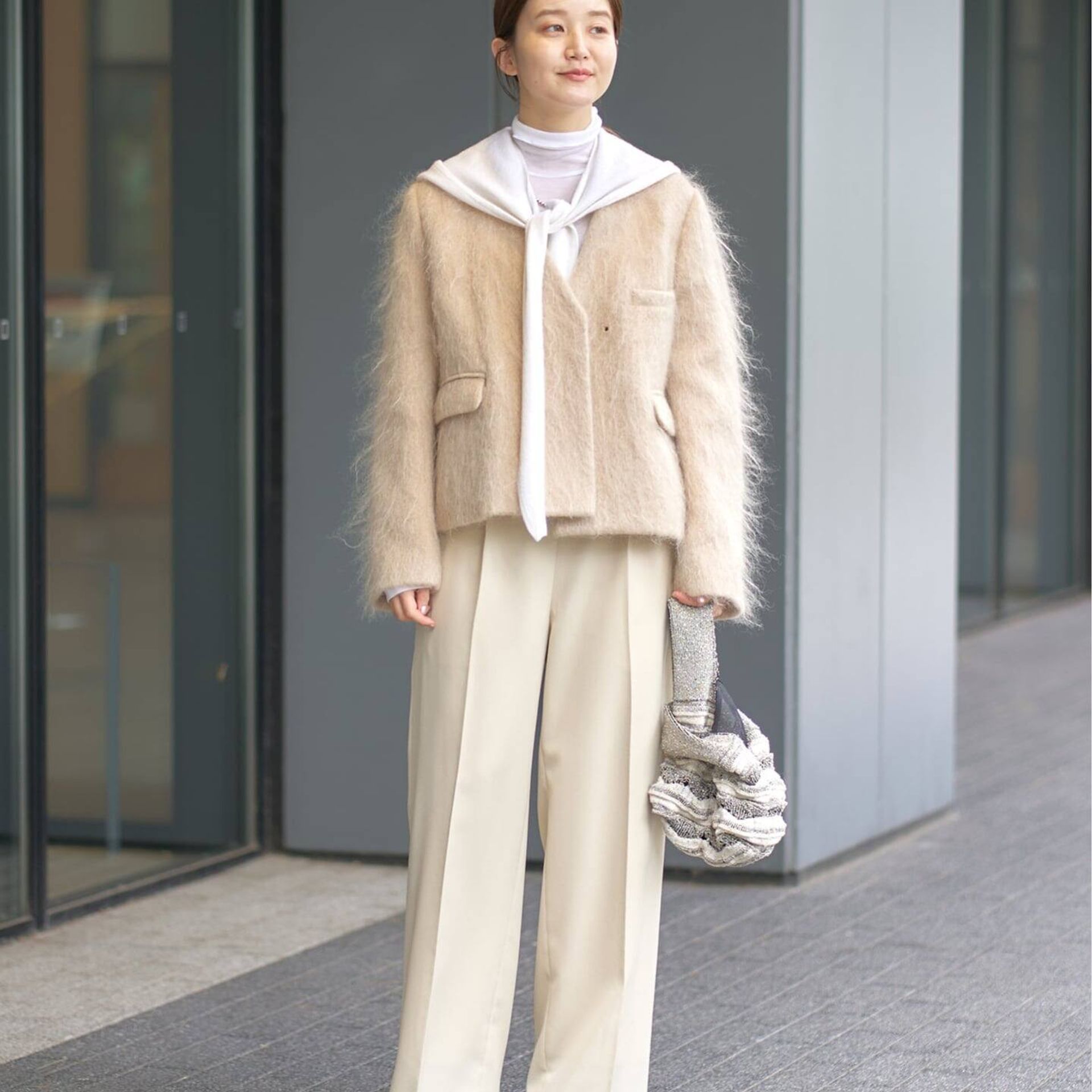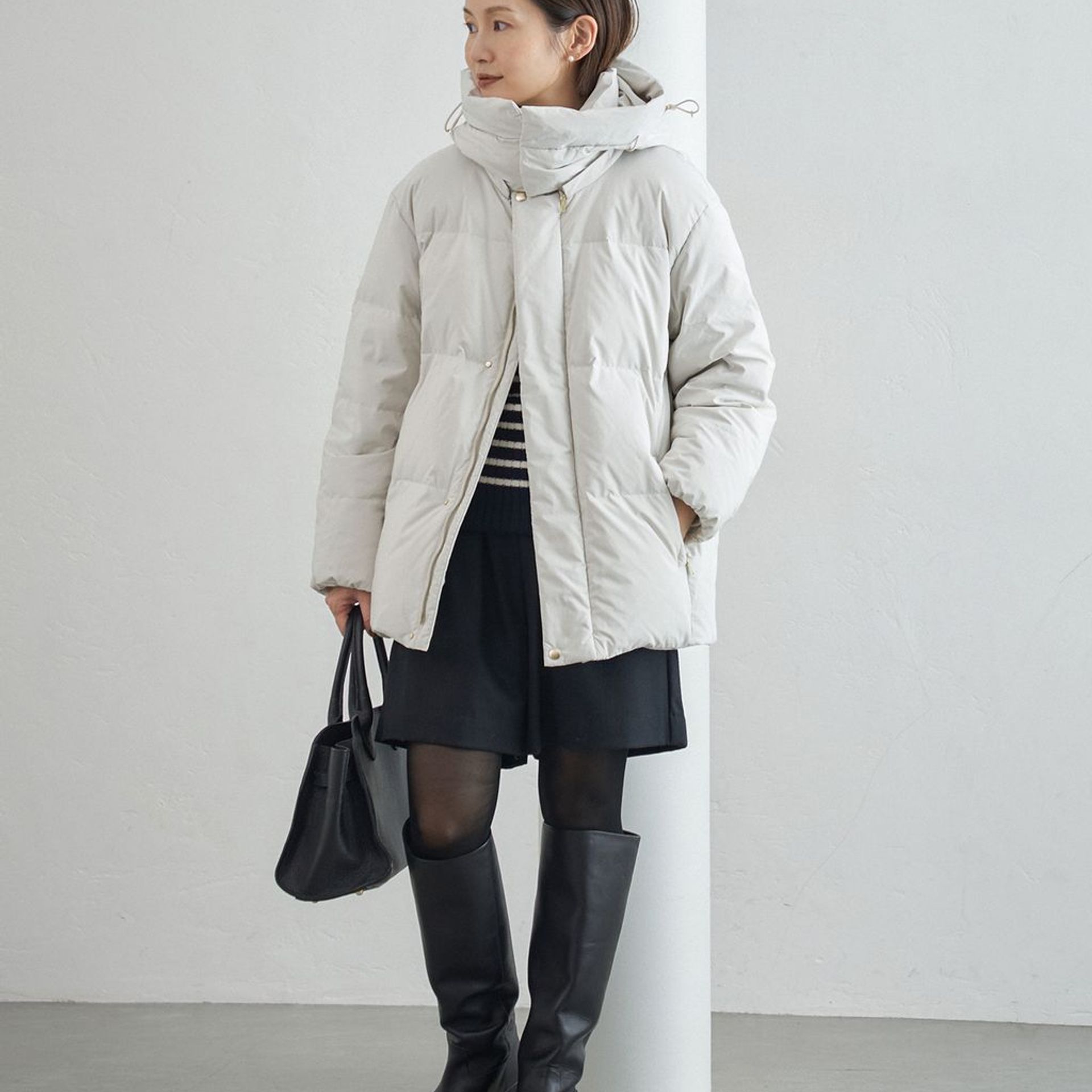 タートルネックやパーカーを合わせると、防寒とスタイルの両立が叶います。