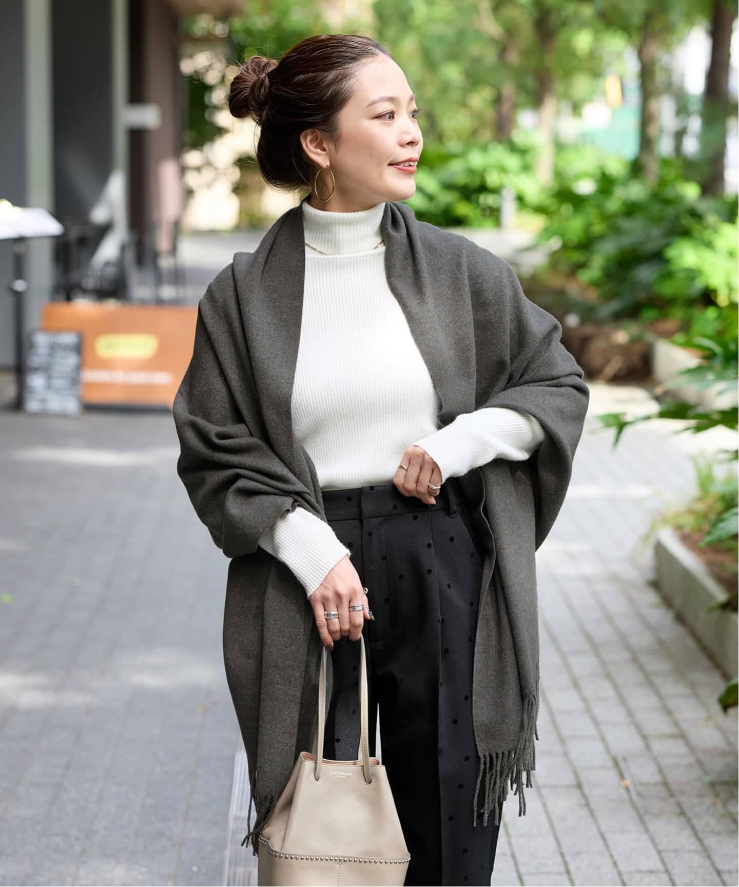 腰周りが隠れる着丈や背中の丸いシルエットがスタイリングを今年らしいバランスにしてくれます。