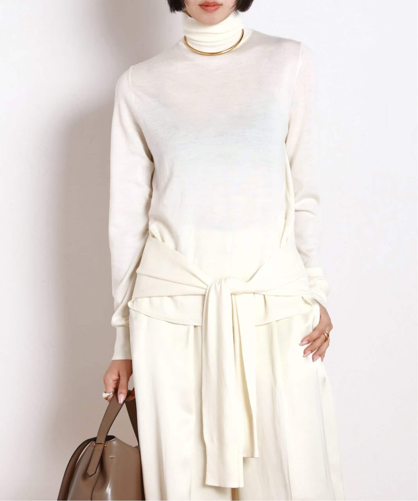 インナーには、ミニマルながらほんのりデザインの効いたところがTOTENEらしいタートルネックニットを。