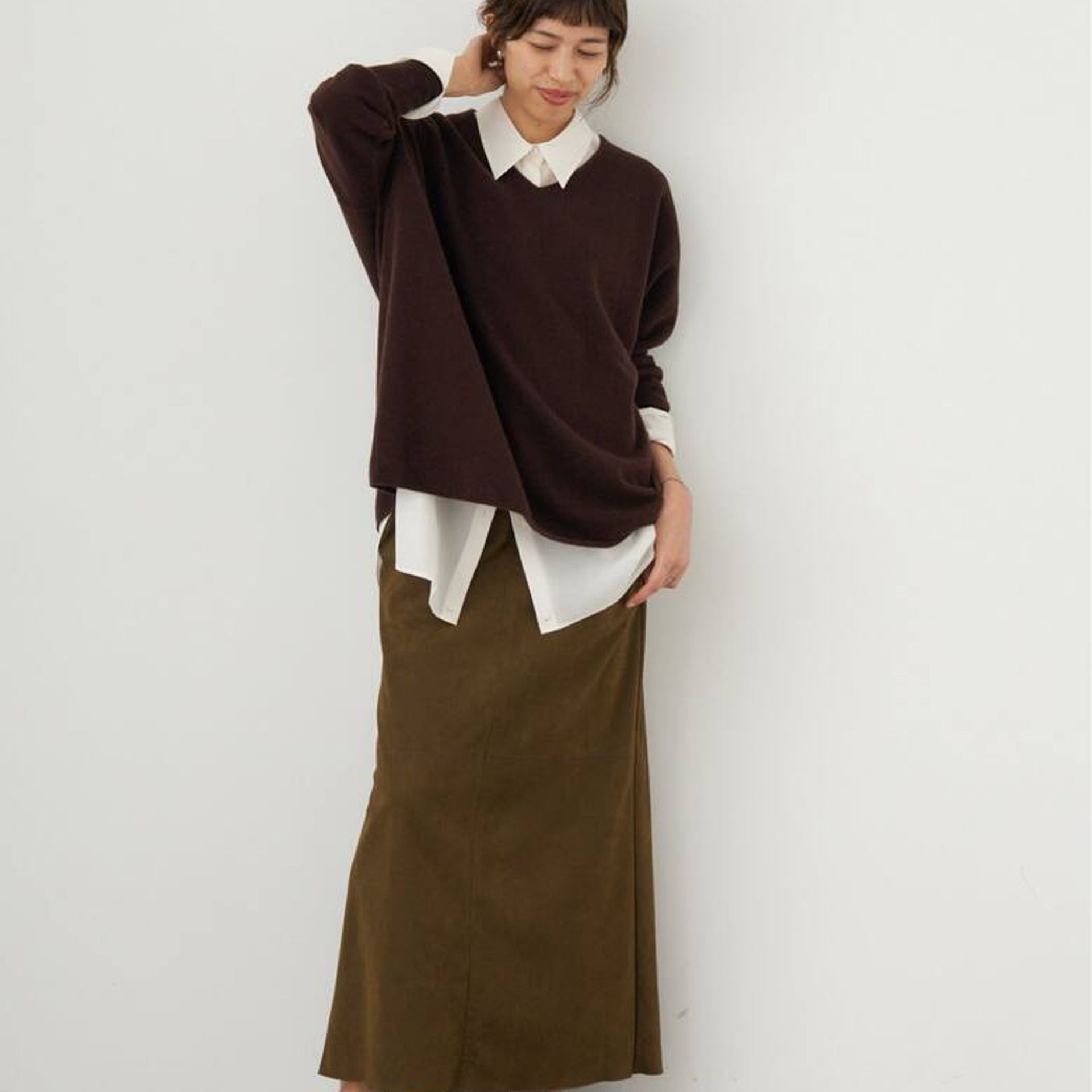 後ろ下がりの着丈とコクーンシルエットで、パンツにもスカートにも好相性◎