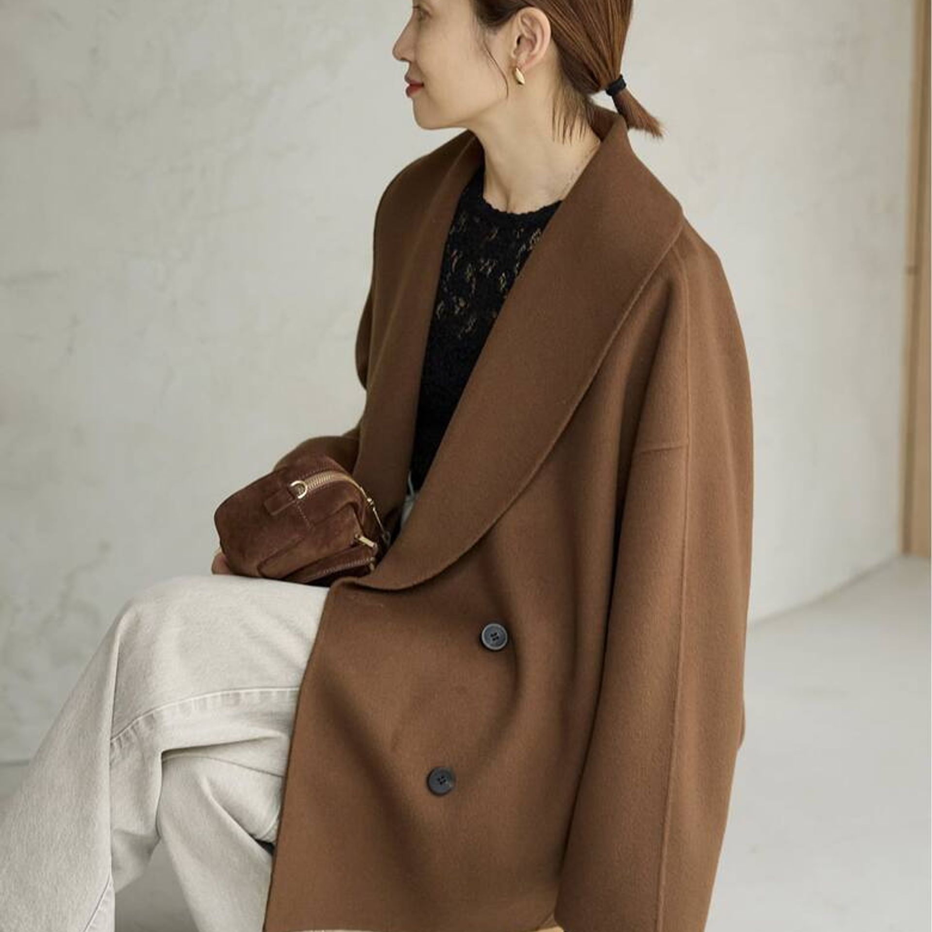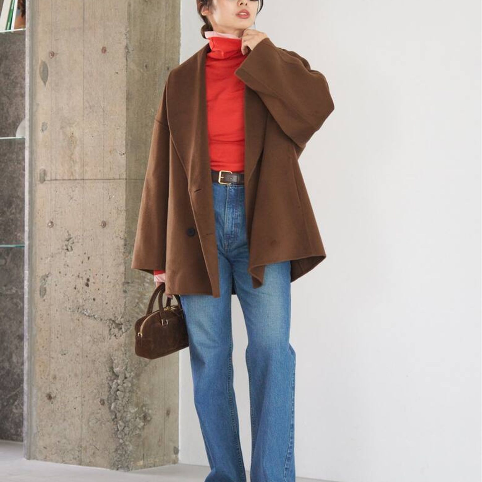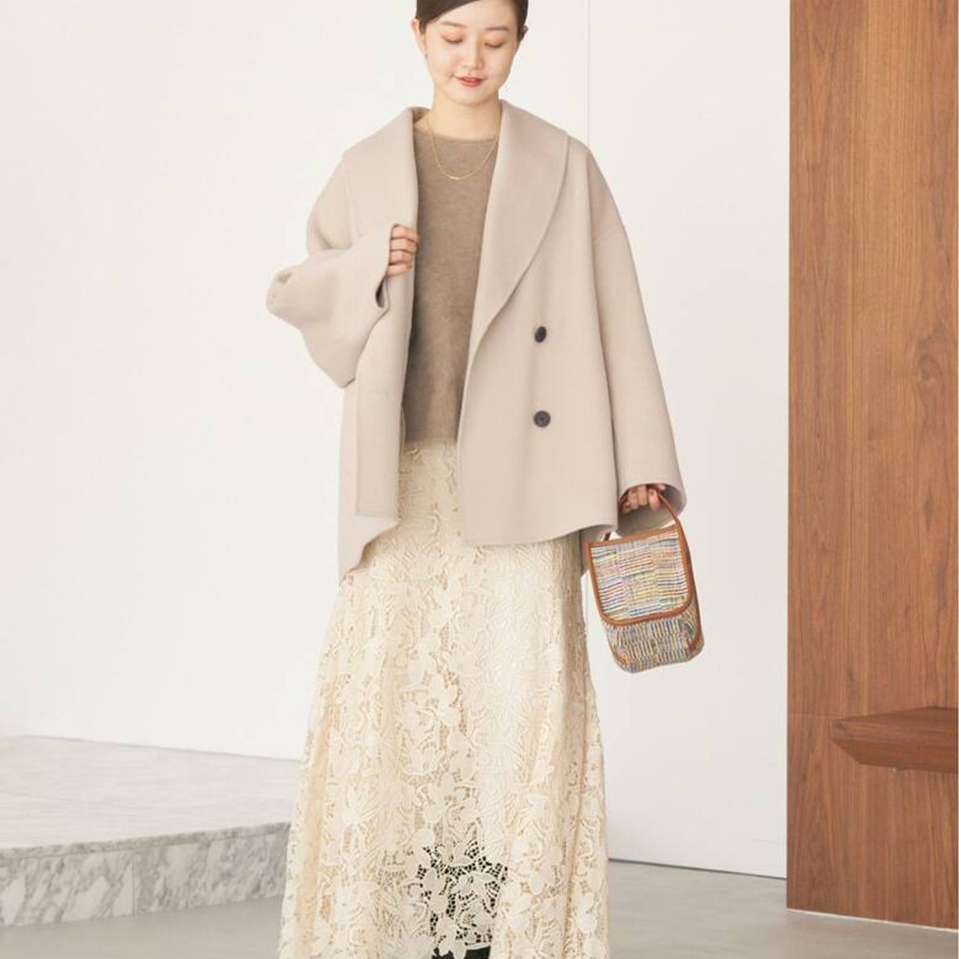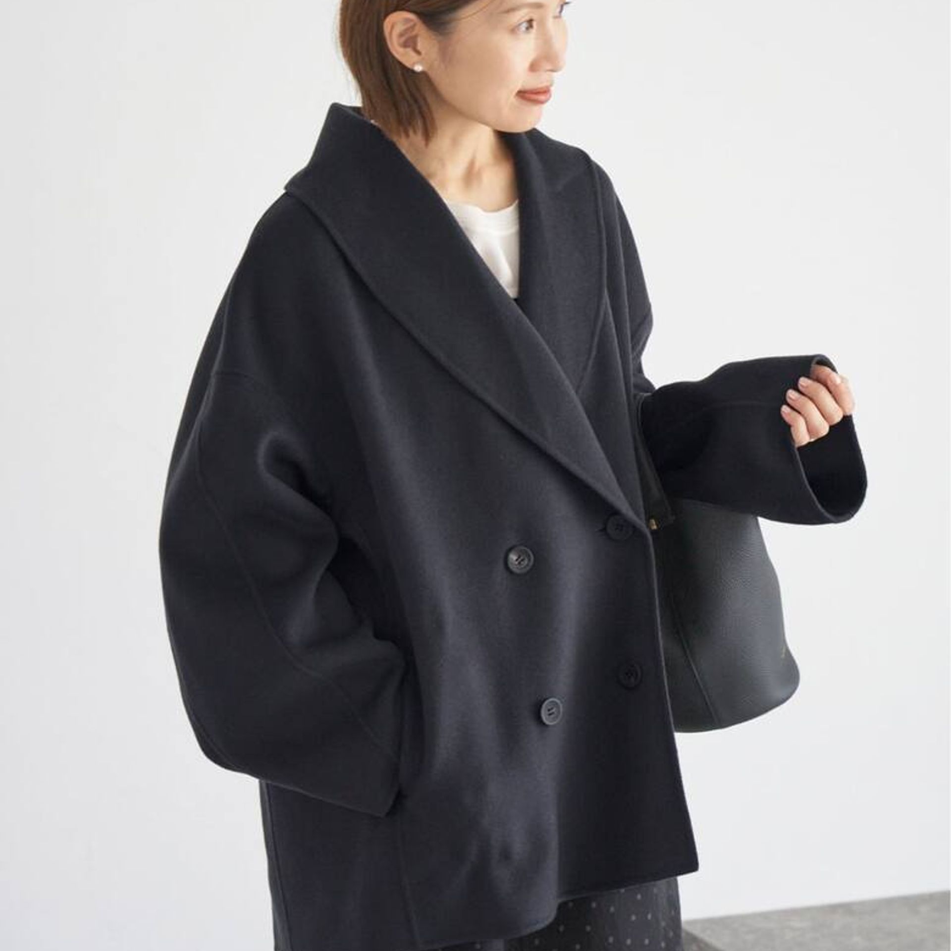 大きめショールカラーで旬の抜け感を演出するハーフコート。