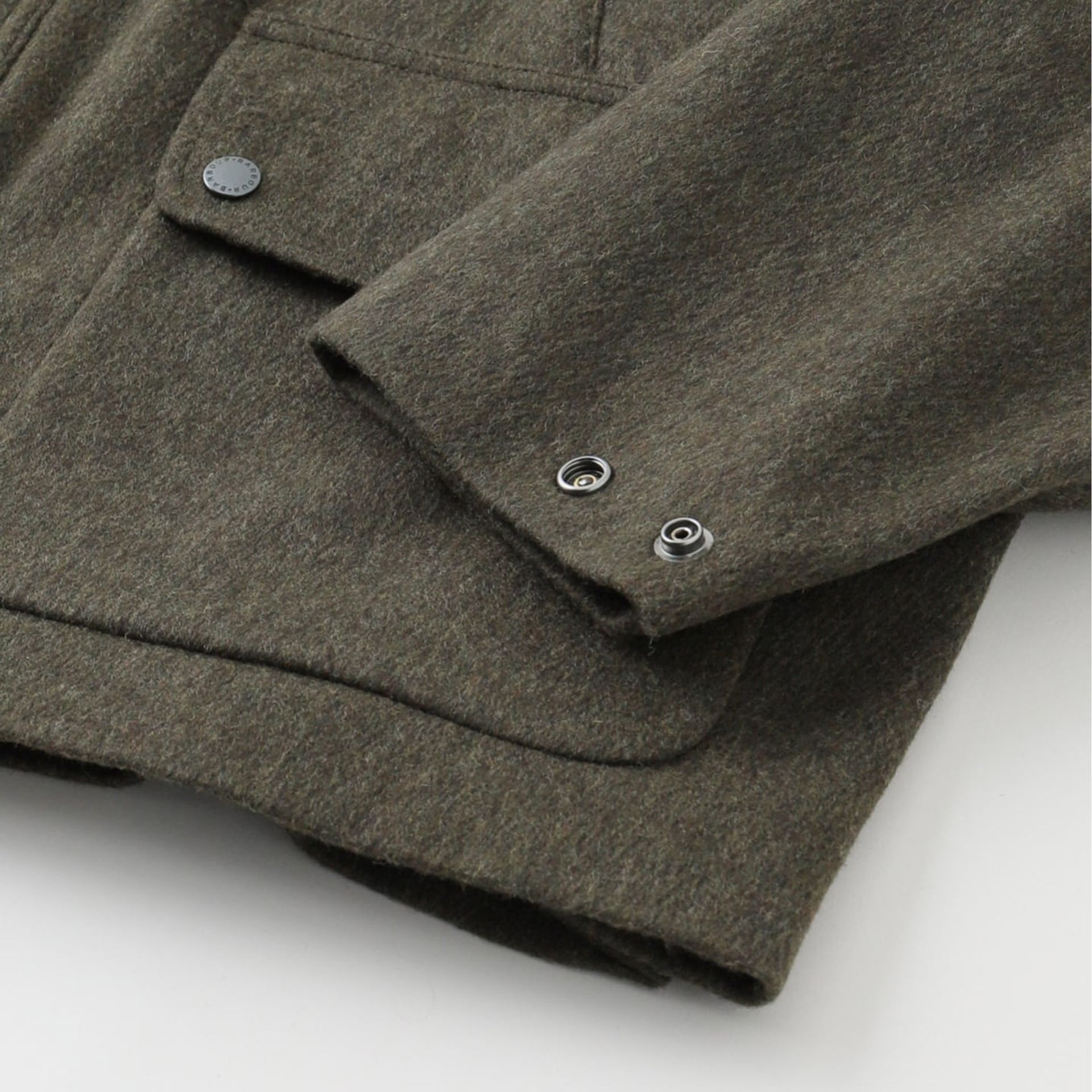 表地にウール混メルトンを使用したBEDALEの定番モデル。ラグランスリーブやスナップボタンの袖口、フロントのダブルジップなど、乗馬用ジャケットの実用的ディテールをそのままに、デザインとして活かした一着。暖かく、肩周りの可動性も確保されており、秋冬に最適です。