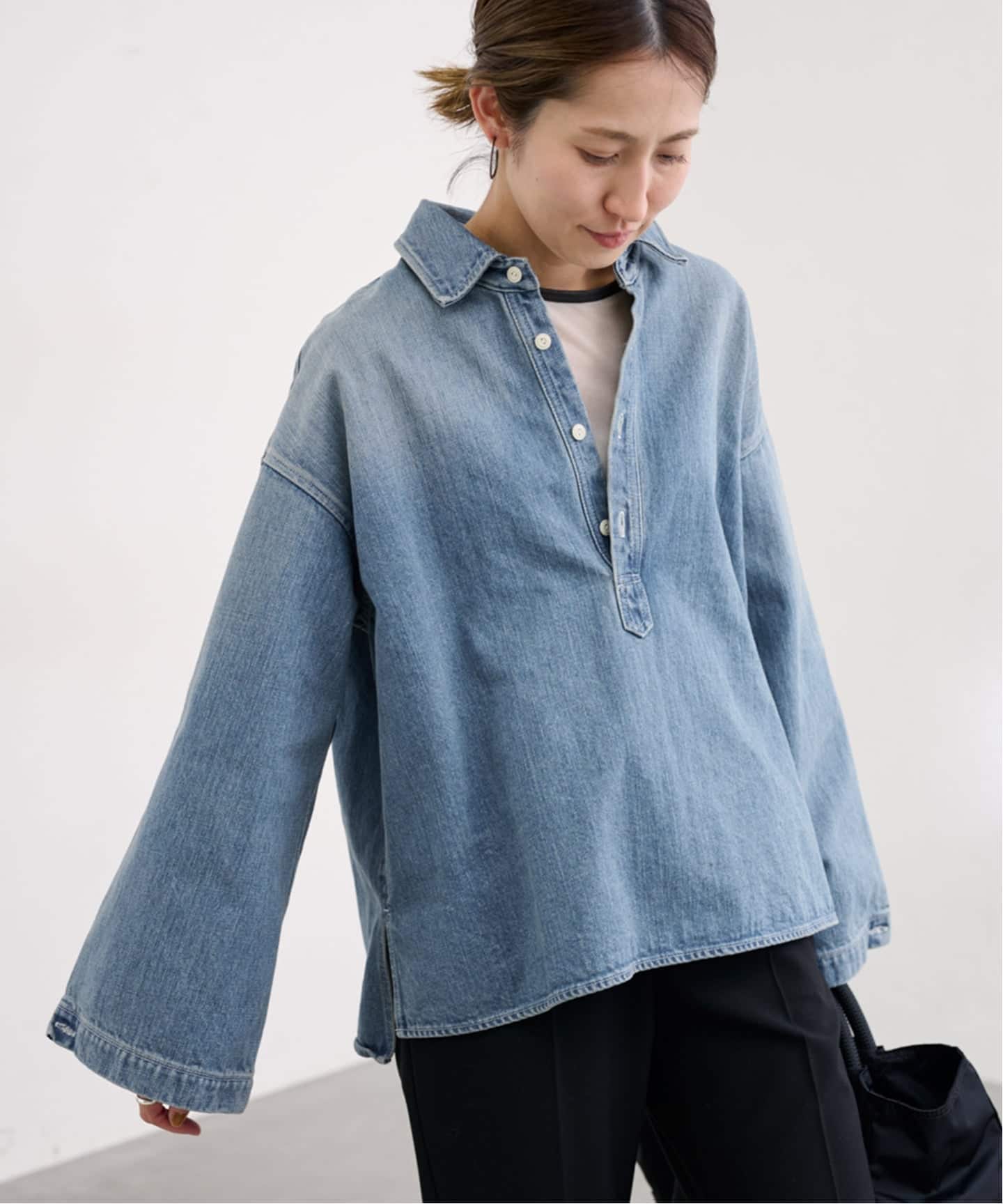 スキッパータイプのデニムシャツ。