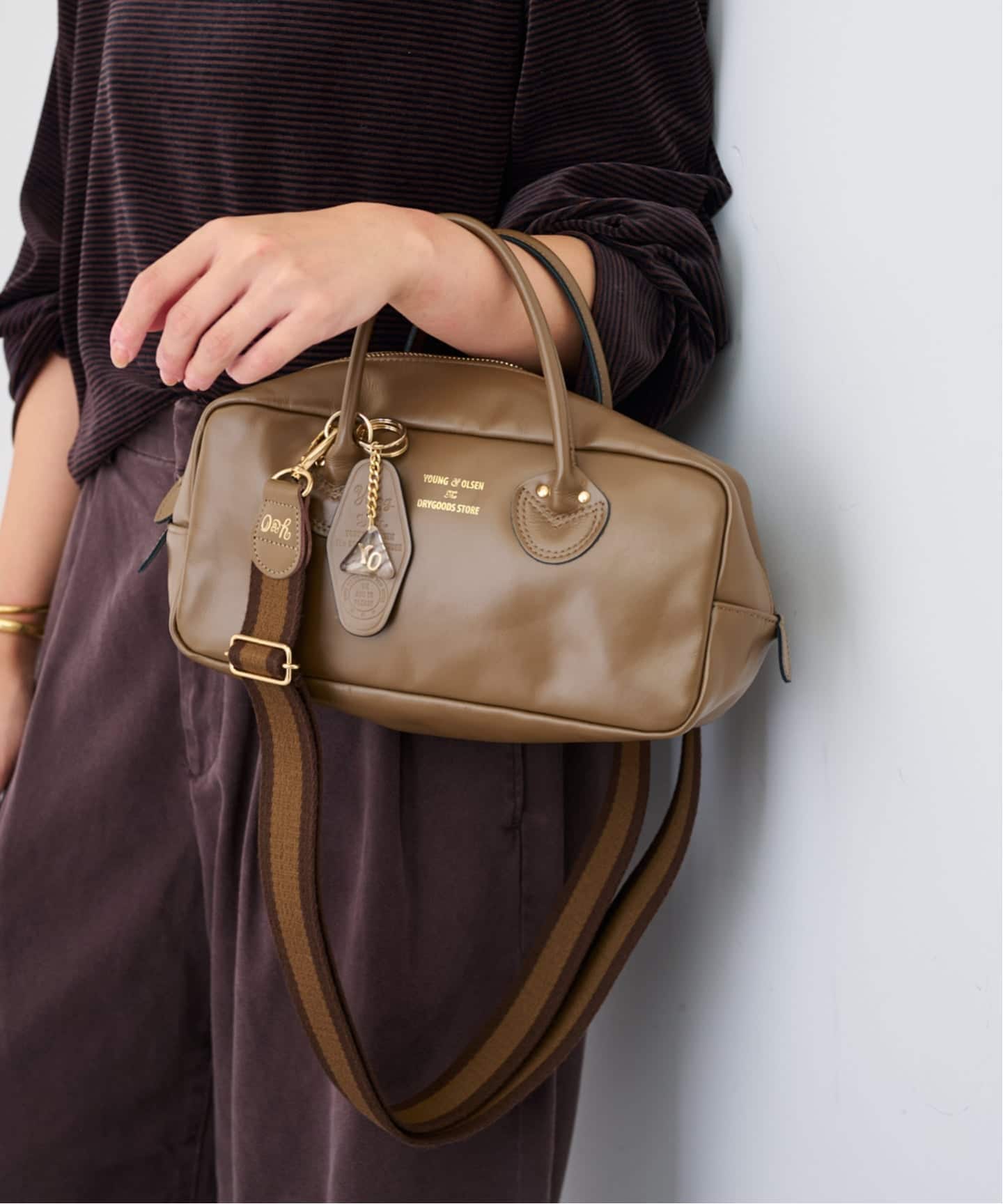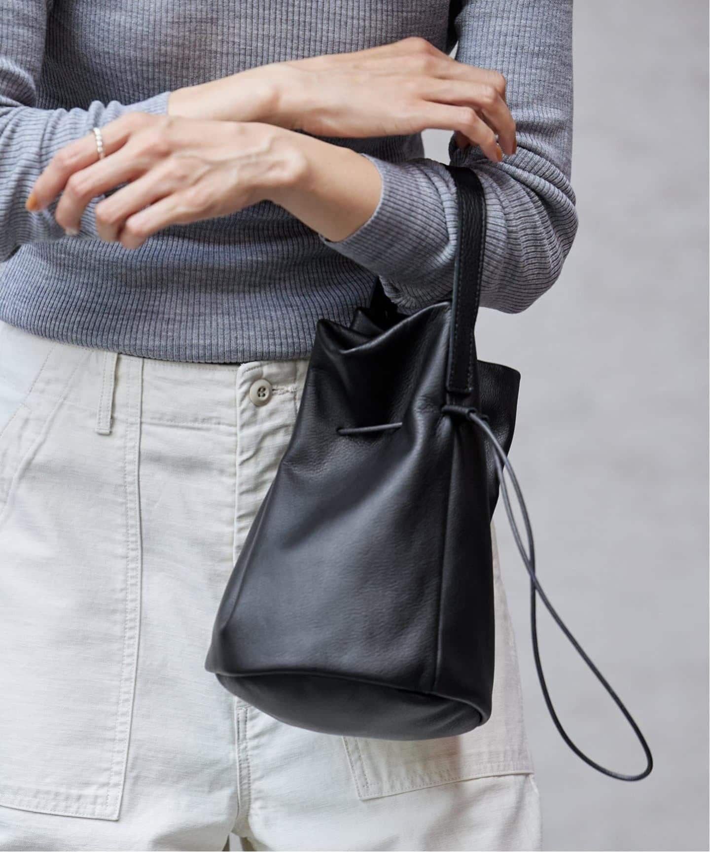 同素材で仕立てたミニトートのチャーム付きで、大小の対比が遊び心をプラス。