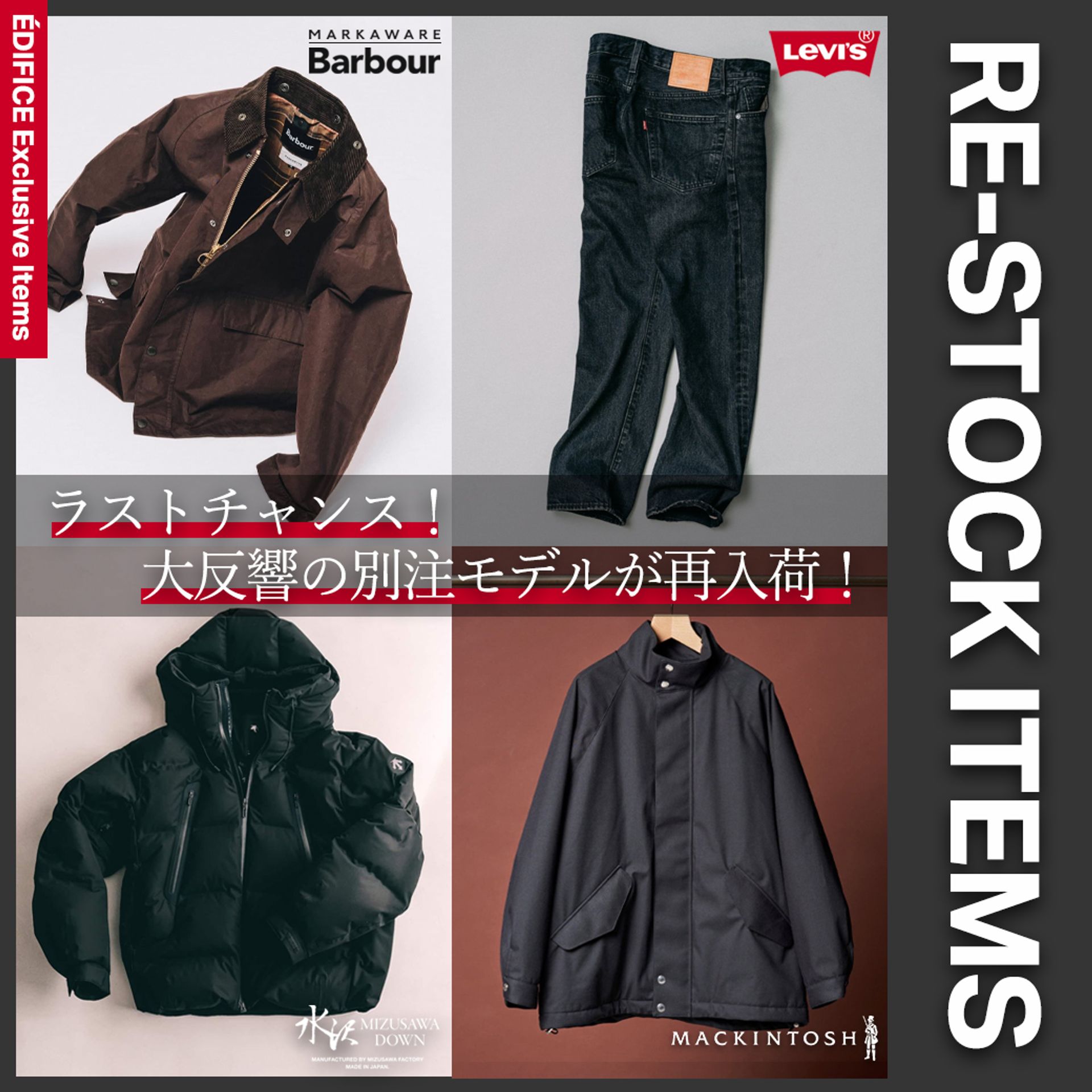 今季の別注アイテムの中でも特に反響の大きい「Barbour × MARKAWARE 別注2モデル」をはじめ、Levi’s(R)、水沢ダウン、MACKINTOSHなど今シーズンを代表する人気別注アイテムがラインナップ。