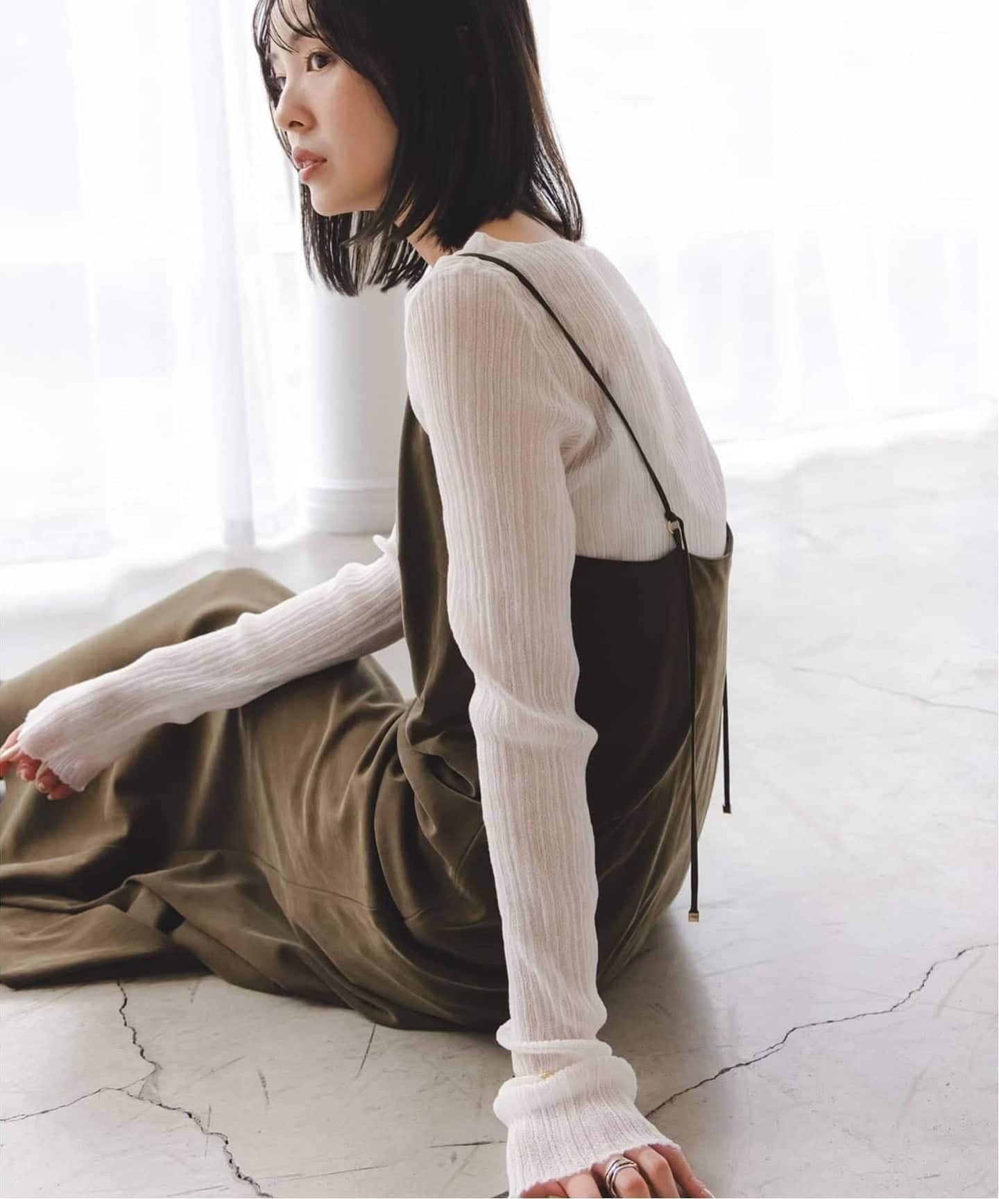 全体が重たくならないようにインナーはシアー素材で抜け感を。