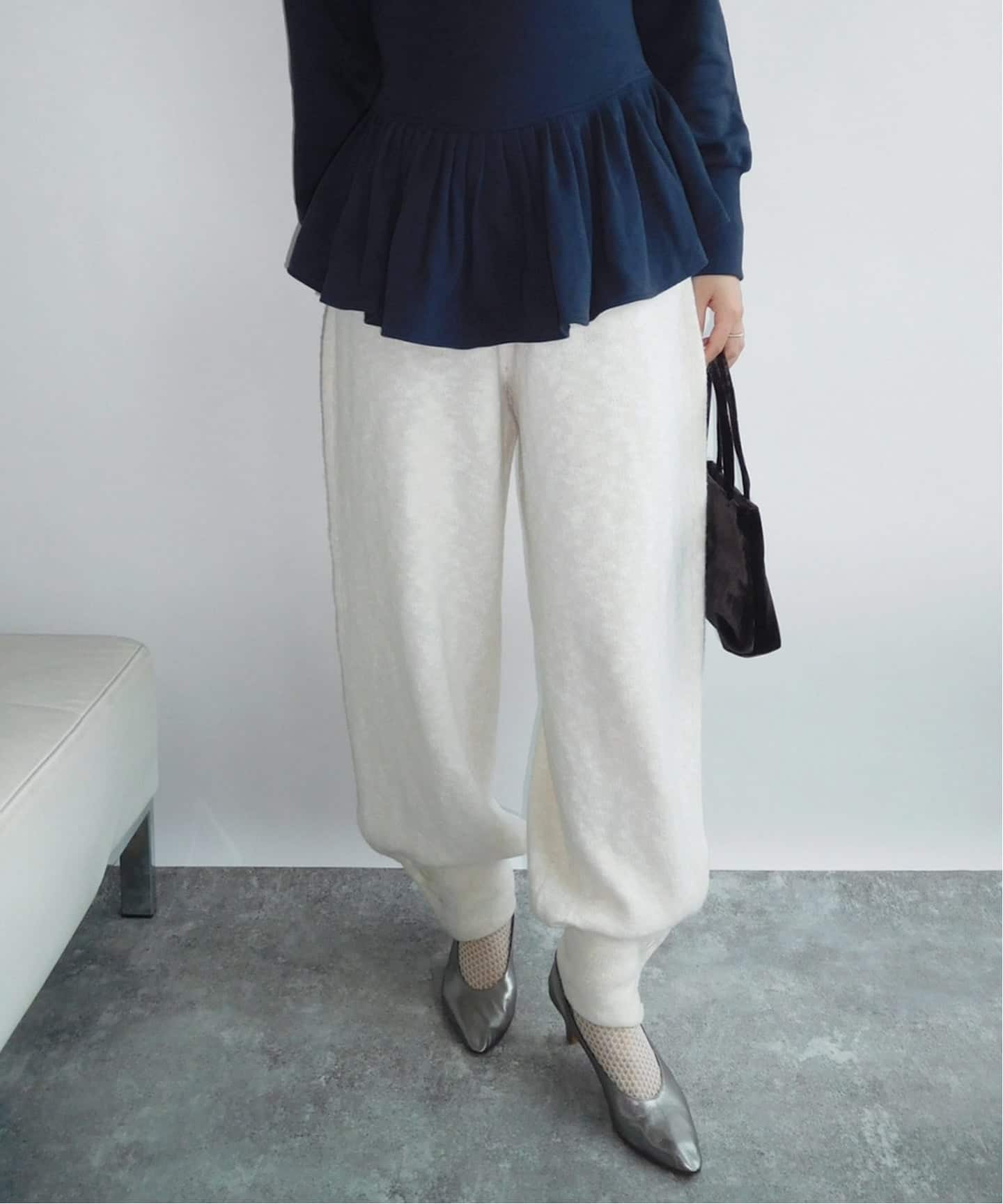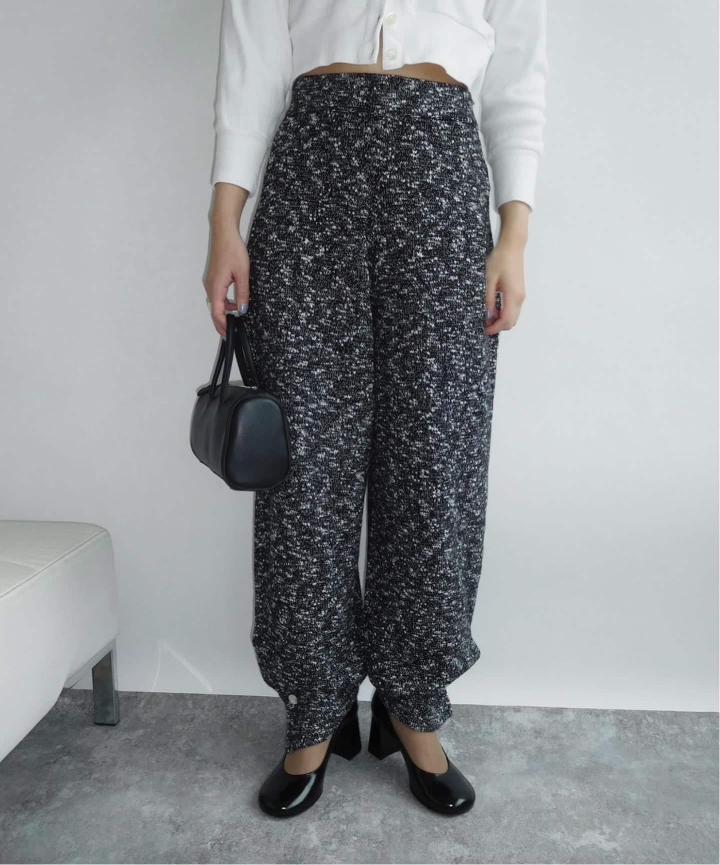 先シーズン即完売したニットパンツの生地替えでポコポコしたスラブニットを使用。ブラックはツイード風。
