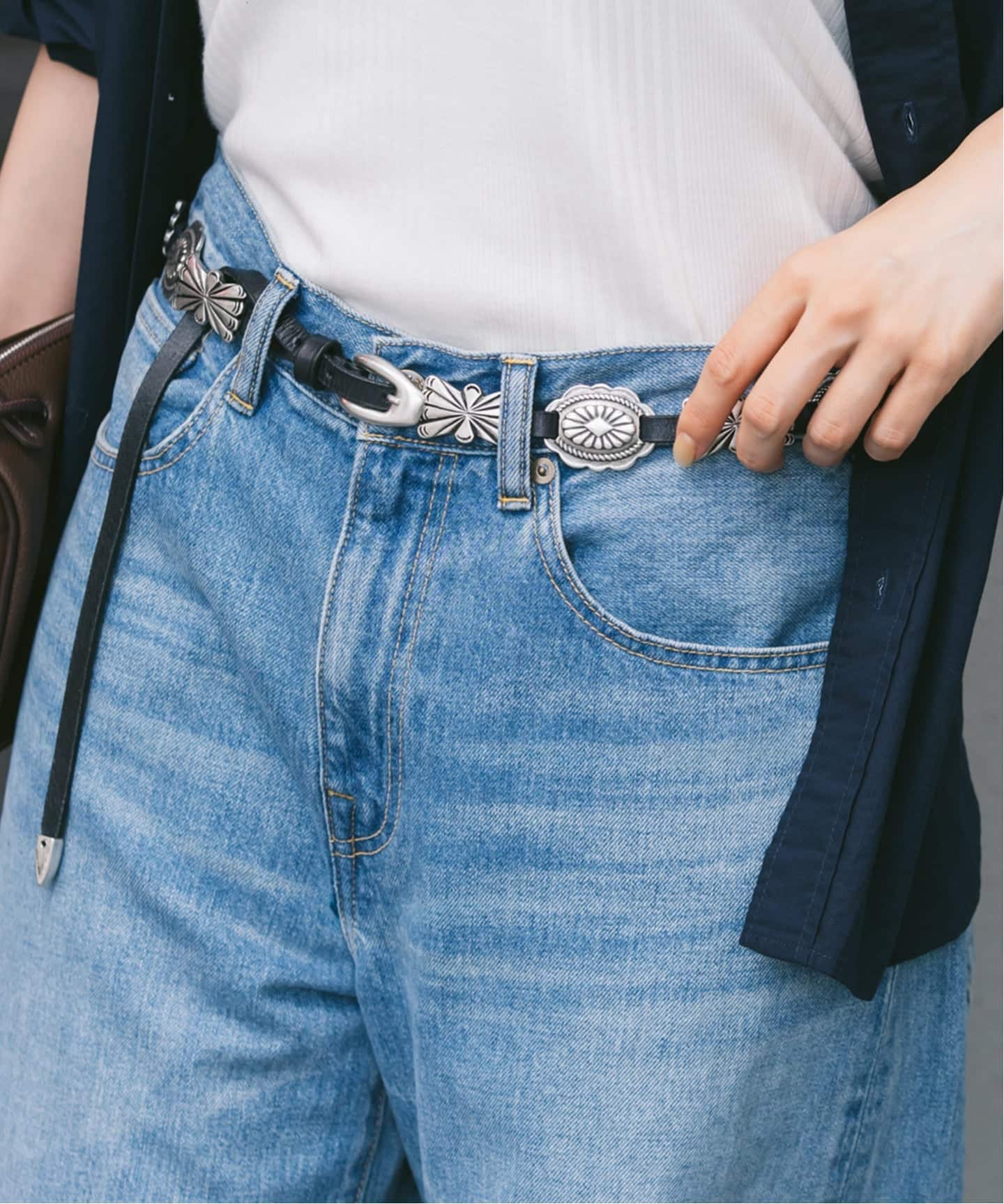 ヴィンテージのコンチョベルトをイメージしながらも、野暮ったくならないデザインに仕上げているので、スラックスなどに合わせても様になるデザイン。