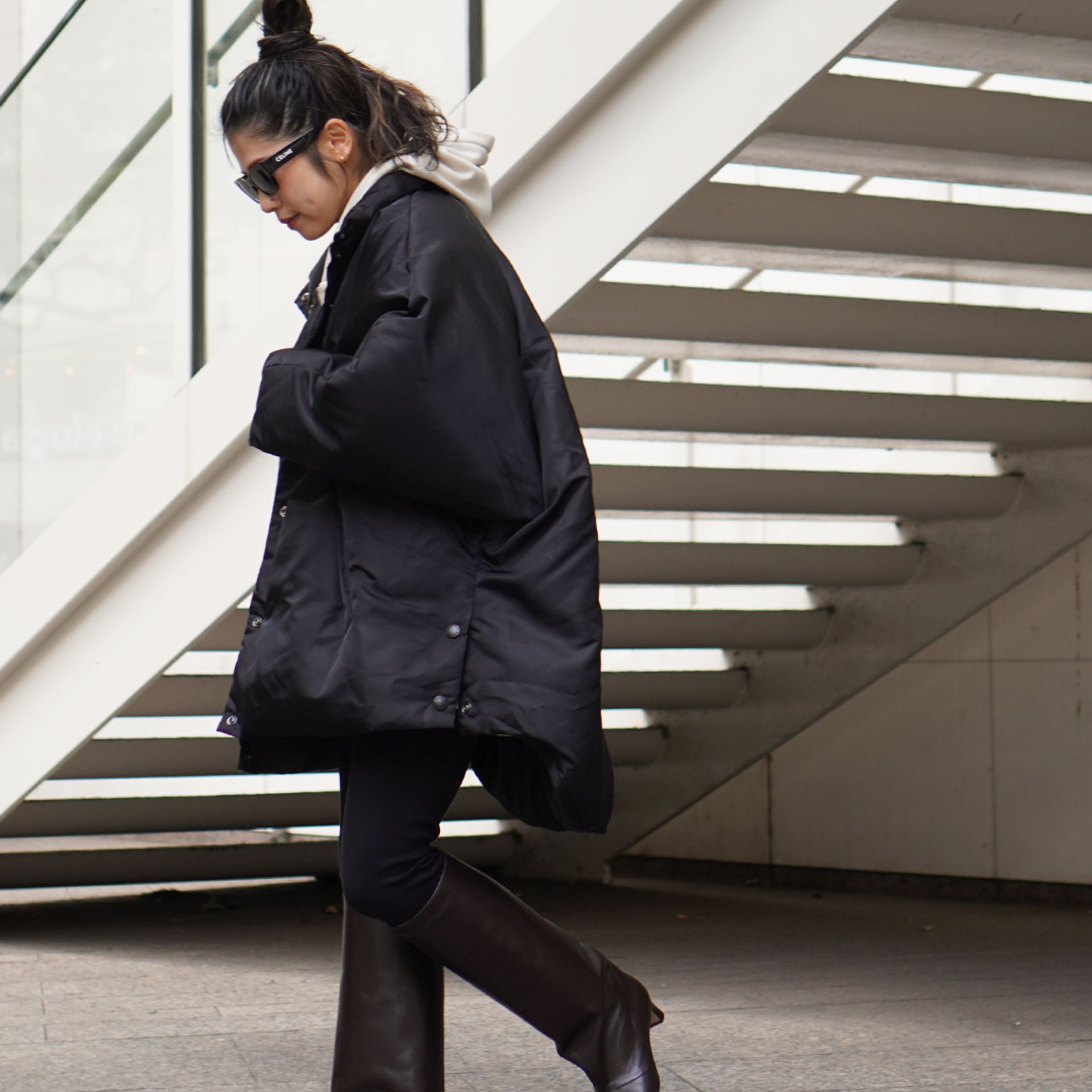 大胆なオーバーシルエットが、羽織るだけで絵になるBERENICEのブラックダウンジャケット。