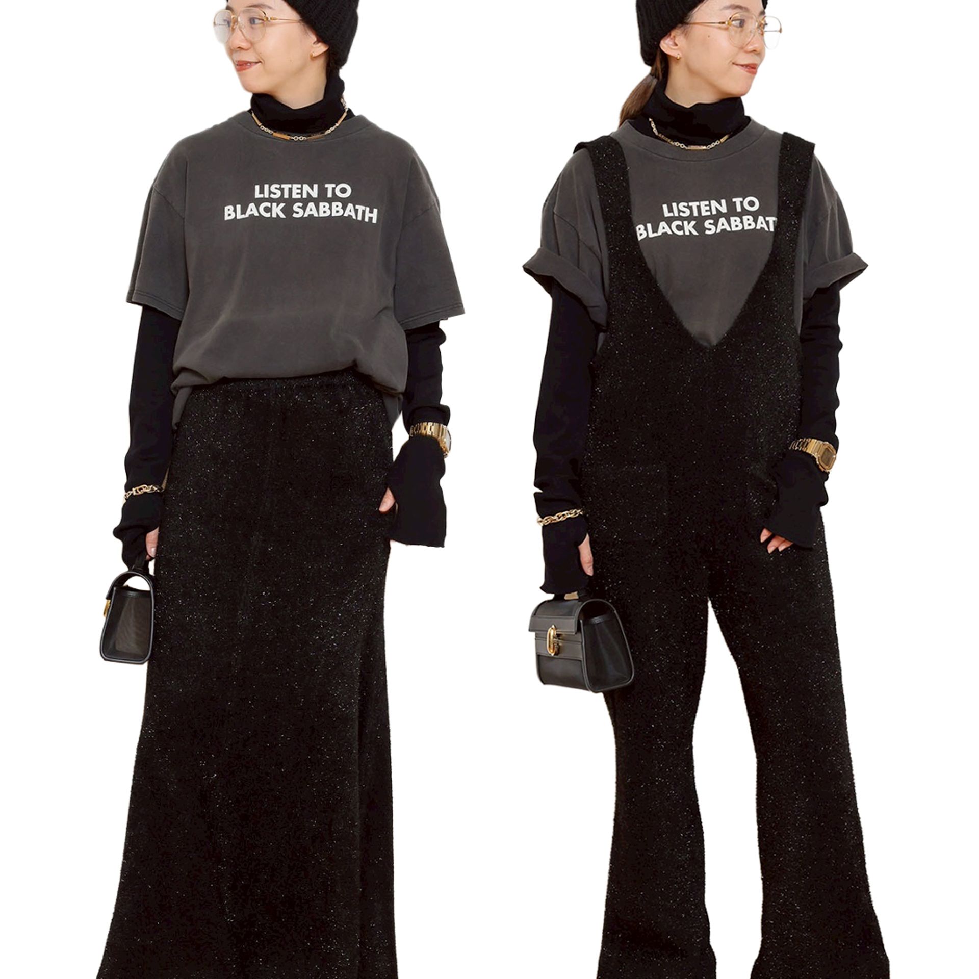 スカートは、贅沢に生地を使ったフレアシルエット。歩くたびに揺れるラインが美しく、存在感がありながらも軽やか。ヒップ周りはほどよくフィットしますが、肉厚な生地のおかげでラインが気にならず、安心して着られる一枚です。 オールインワンは、ポリエステルの接結編みによるほどよい張り感と伸縮性が魅力。肩紐の裏側には別の編み地を貼り付け、伸びにくいよう工夫された“伸び止め”仕様に。細部までこだわりが宿る、大人のための一着です。VintageのTシャツにタートルネックを重ねてカジュアルダウンして着こなすのもおすすめ。