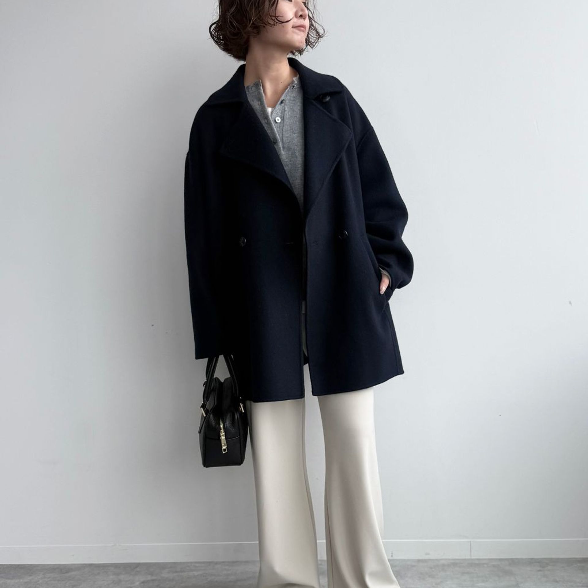ダブルボタンで大きな襟が特徴のPコートをベースにしたデザイン。