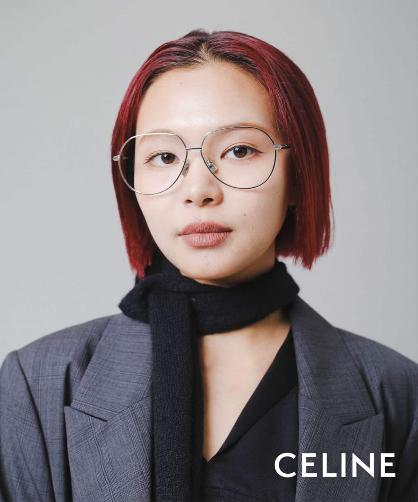 右:私の今のムードなスタイリングです。全体的に角のない柔らかい曲線のフレームなので、あえてスポーティーなアイテムと合わせて。