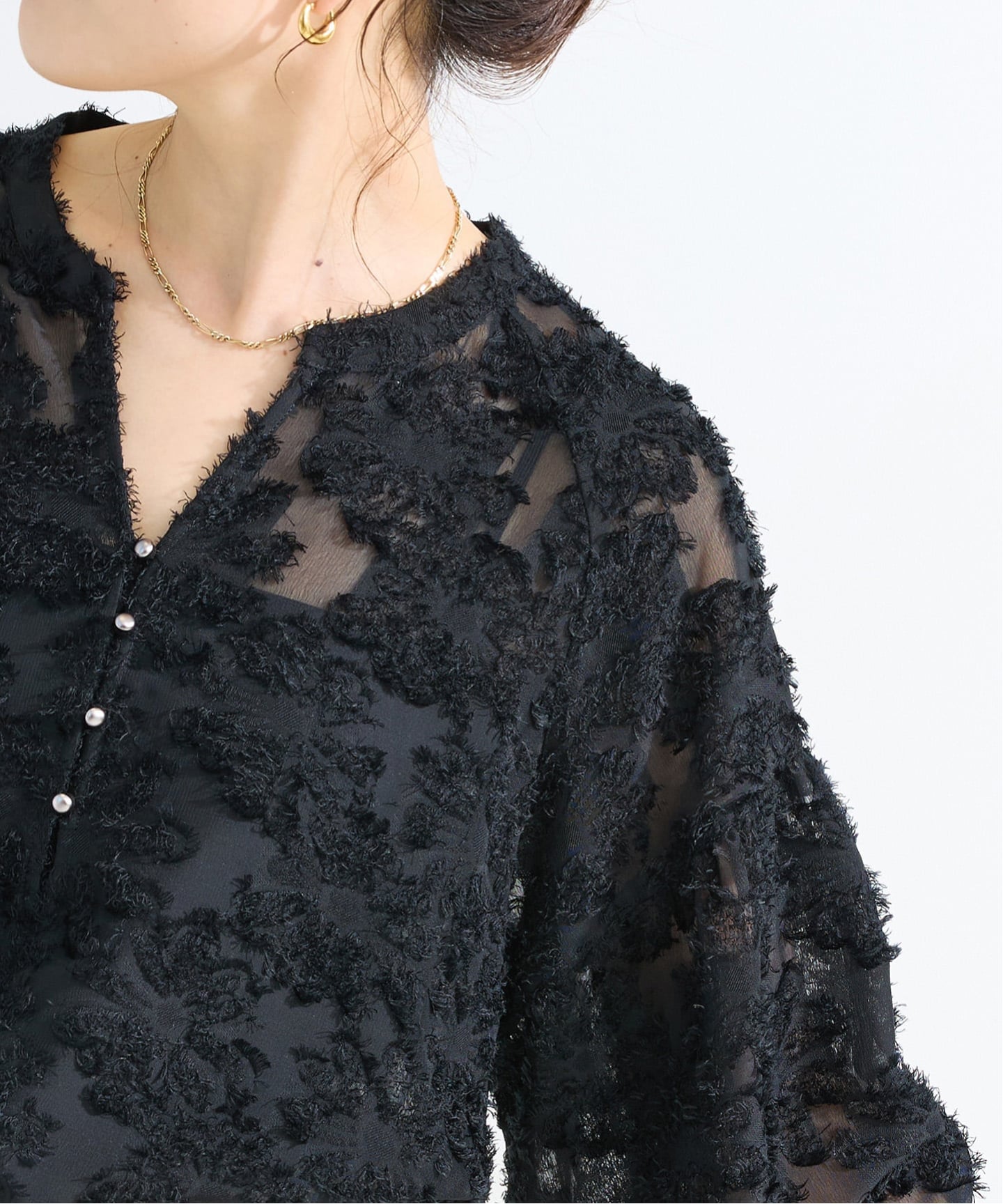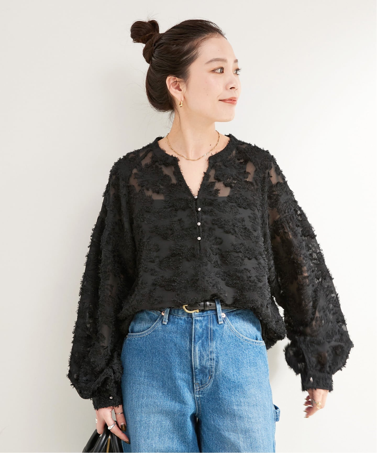ジャガードの立体的な柄と、パフスリーブのフォルムがクラシカルかつフェミニンなブラウス。