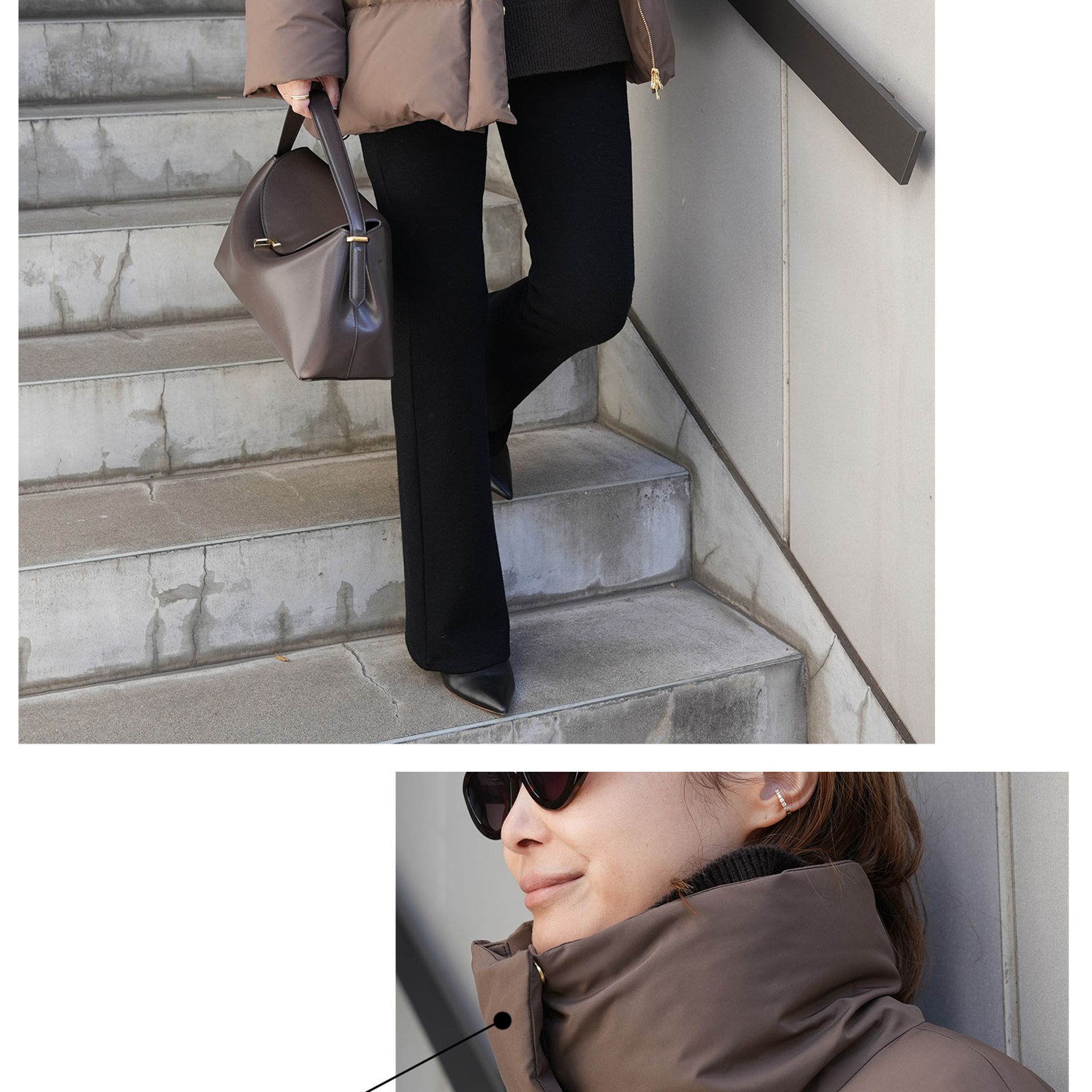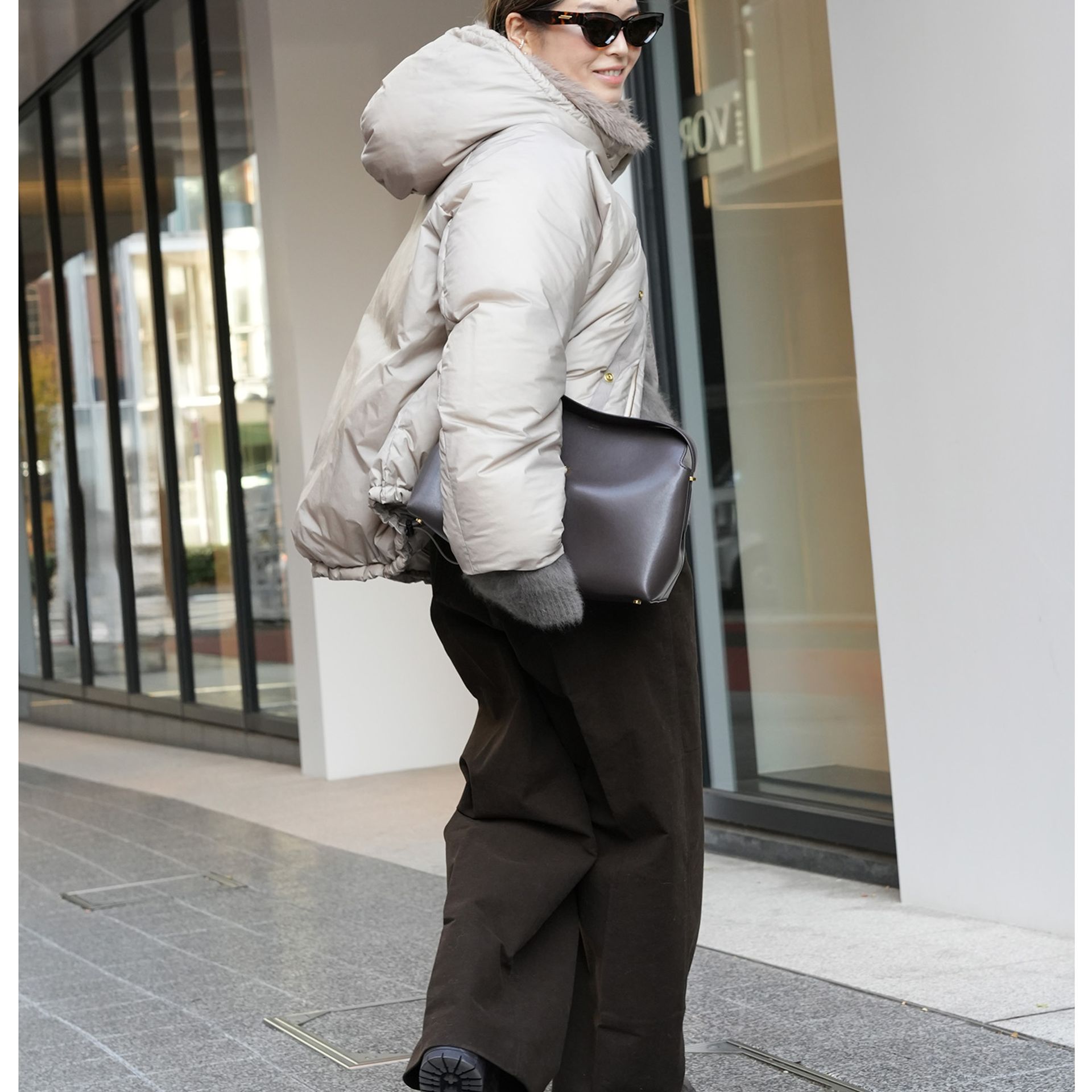 ニュアンスカラーのダウンには、モカブラウンを合わせて。