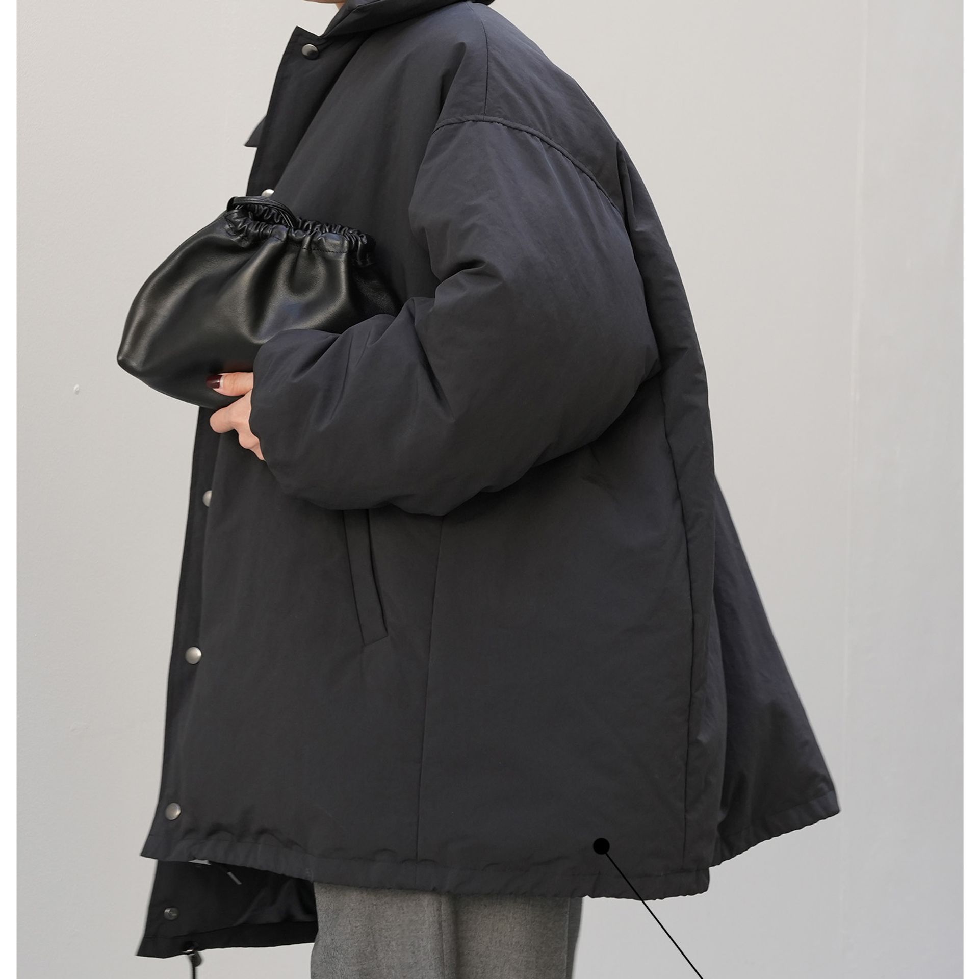 ファスナーを隠す前立てボタンや、マットな質感が纏うだけでモダンなムードを纏える一着。