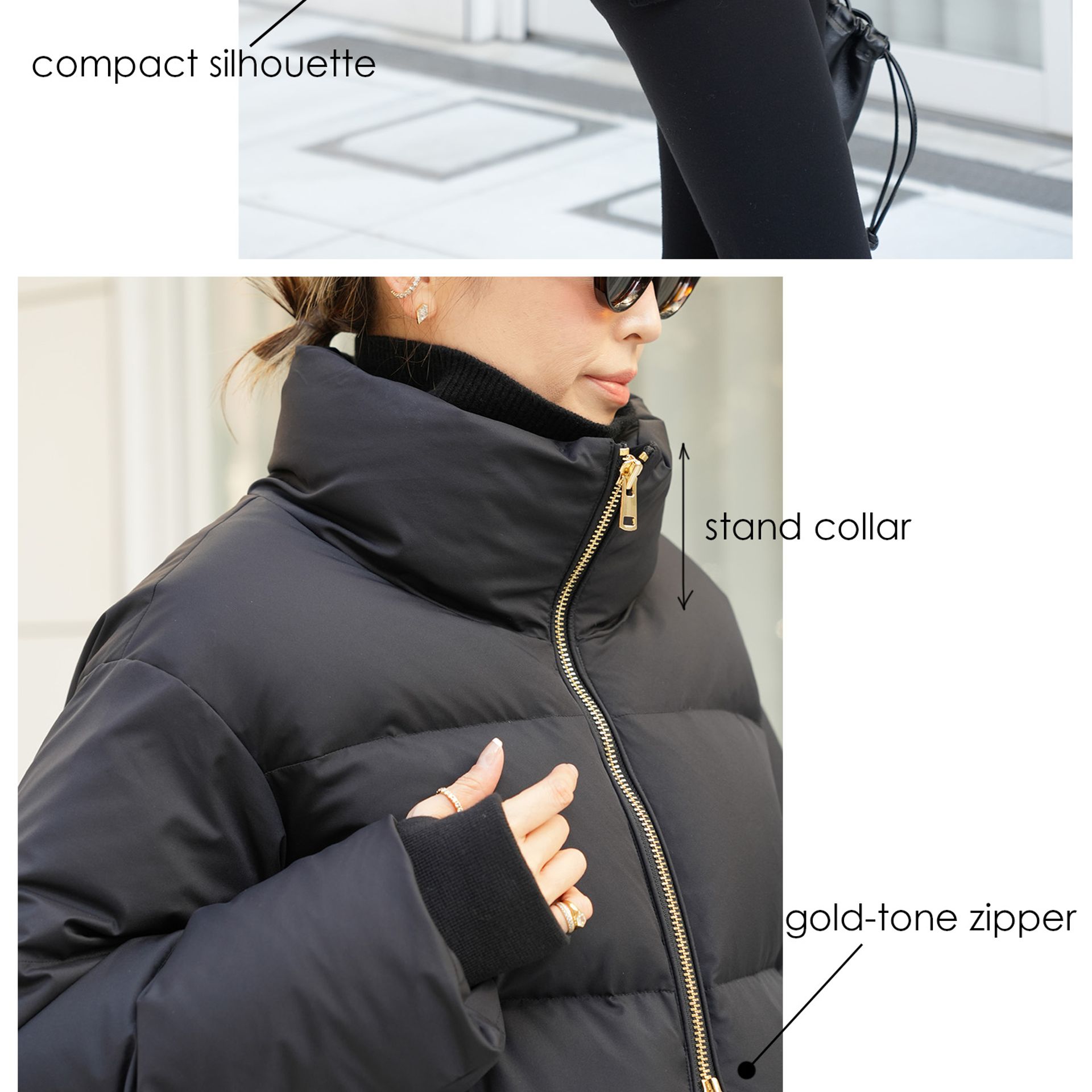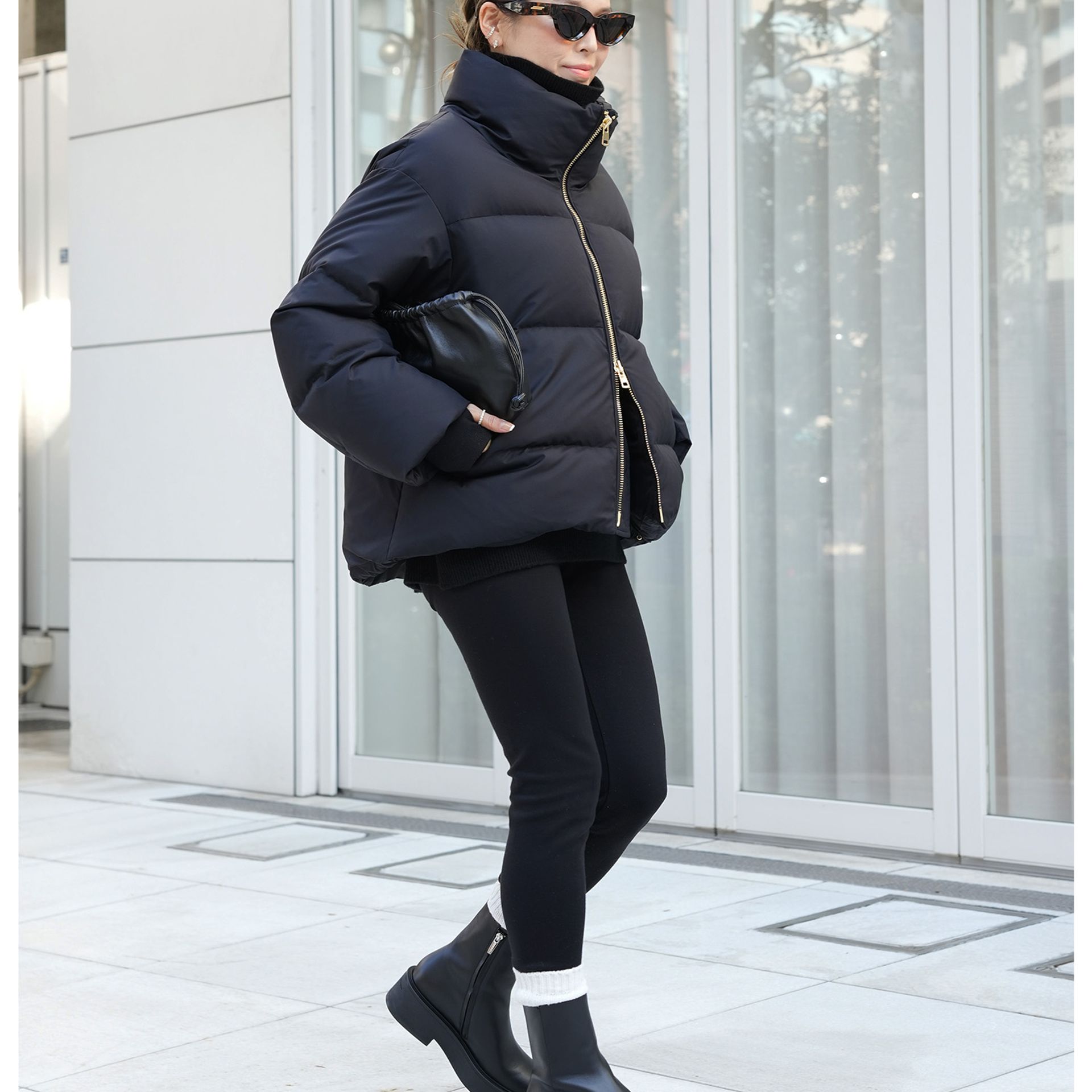 ダウンのゴールドファスナーをアクセントに、オールブラックのモダンなワントーンスタイル。