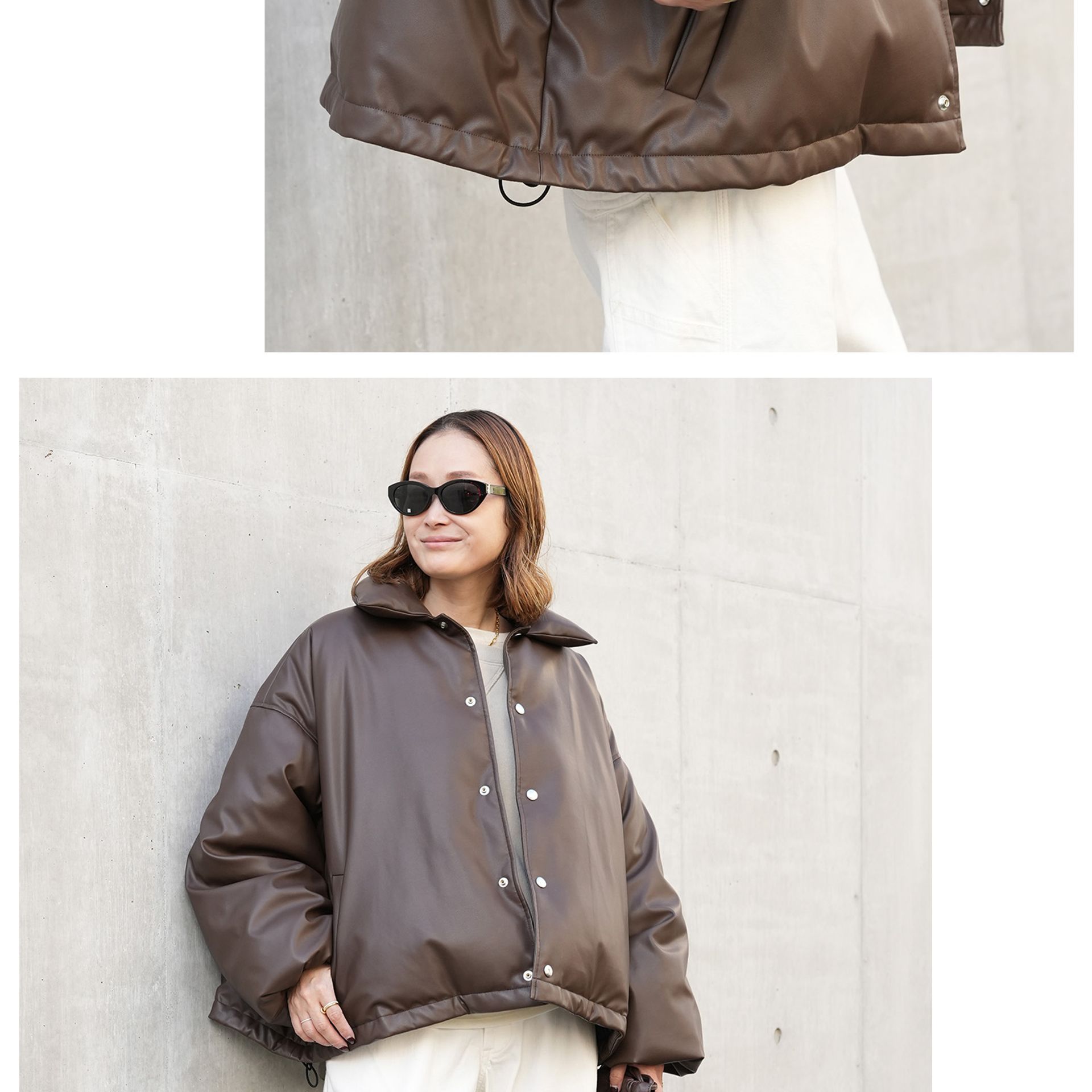 一見カジュアルなのにスタイリングに艶が出るのはレザーライクな質感ならでは。