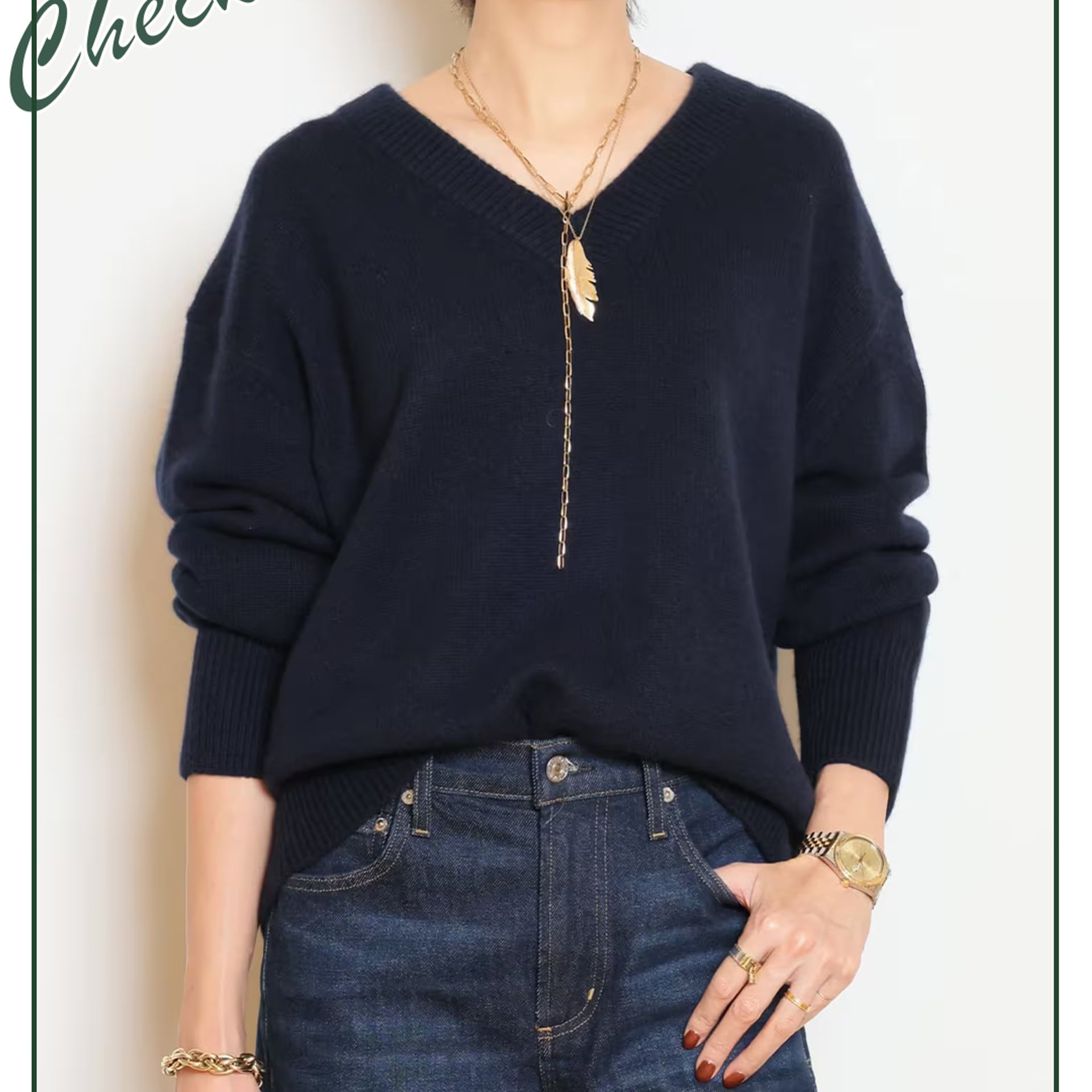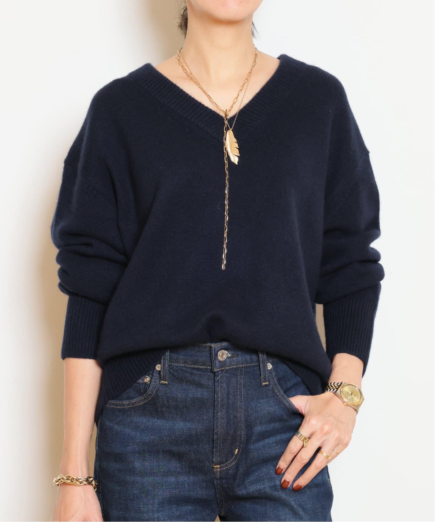 深すぎず絶妙なネックのあき具合。もっちりとしたカシミアの質感で着心地も気持ちいい。1枚で着るのはもちろん、白Tを中に入れてカジュアルにも楽しめるデザイン