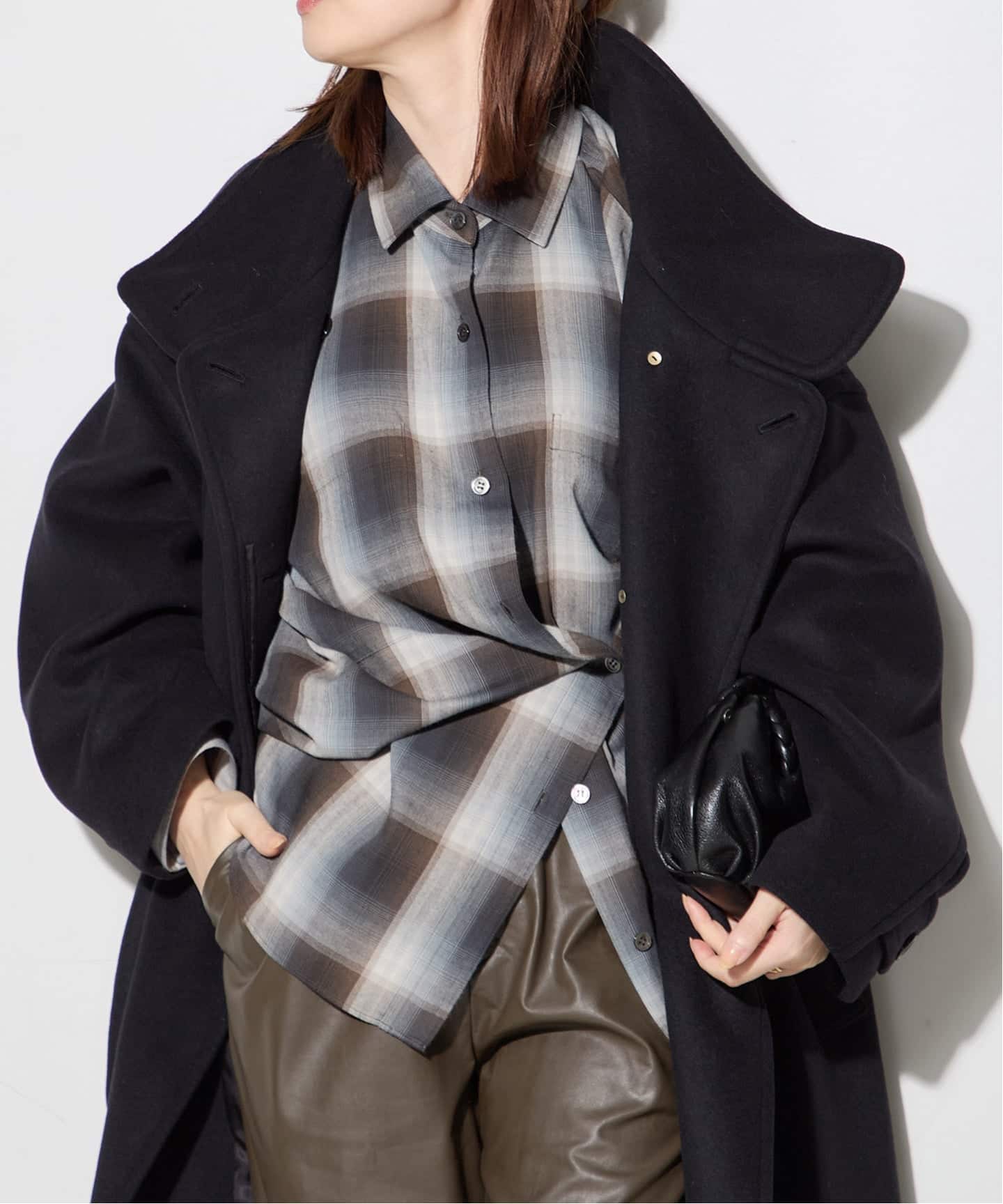 コートがロング丈なので、インナーはすっきりしたリブニットにするとバランス良く着れます!