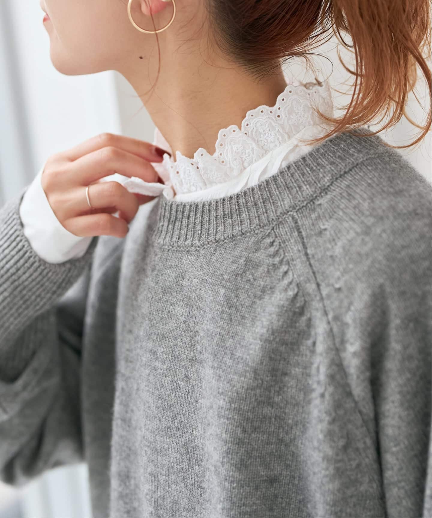 ニットとレースのドッキングで、シンプルな着こなしにアクセントを加えられるデザイン。デイリーから特別な日まで活躍。