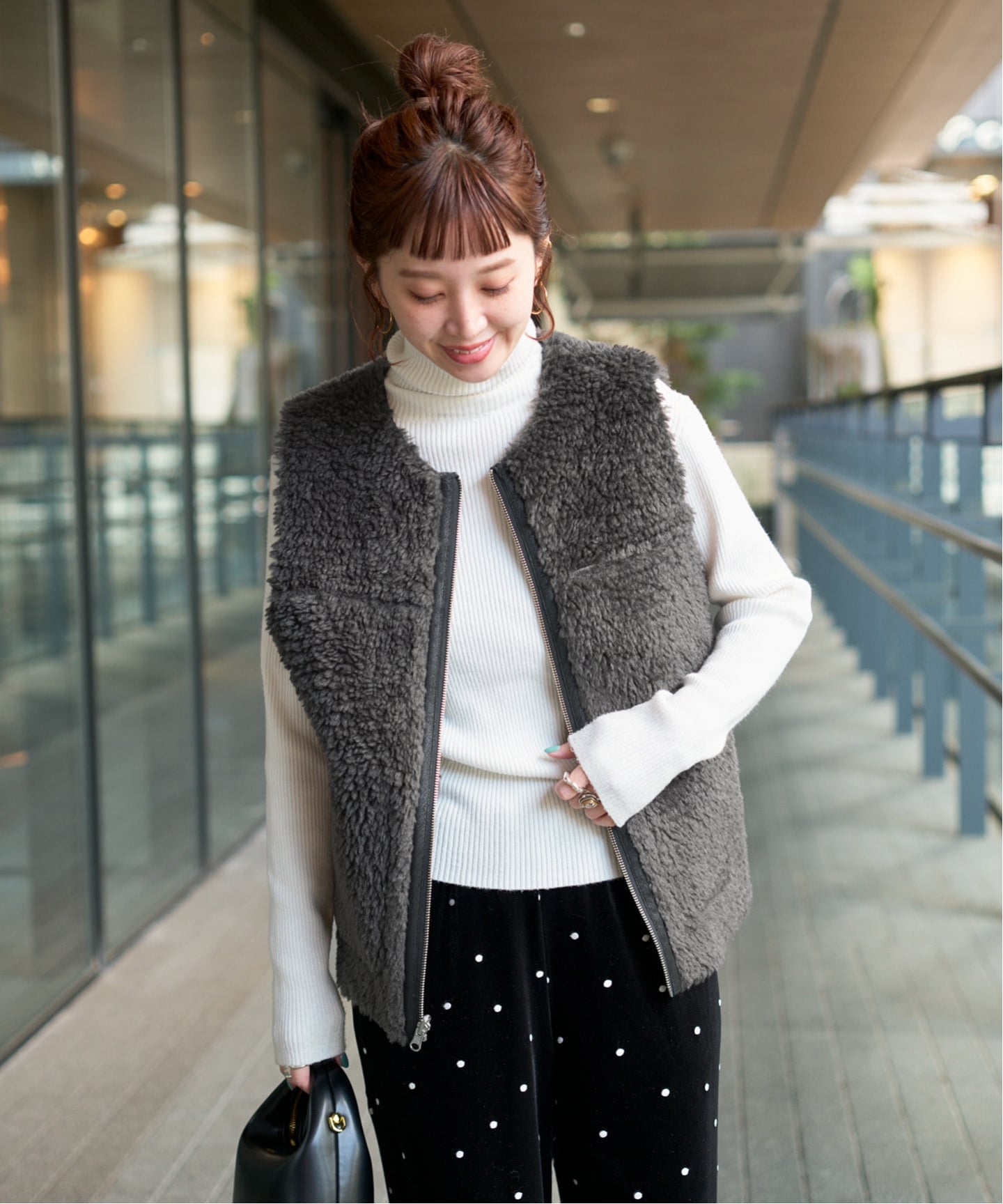 リバーシブル仕様でフェイクスエード×ボアを使用した、気分で表情を変えて着られるムートンライクベスト。