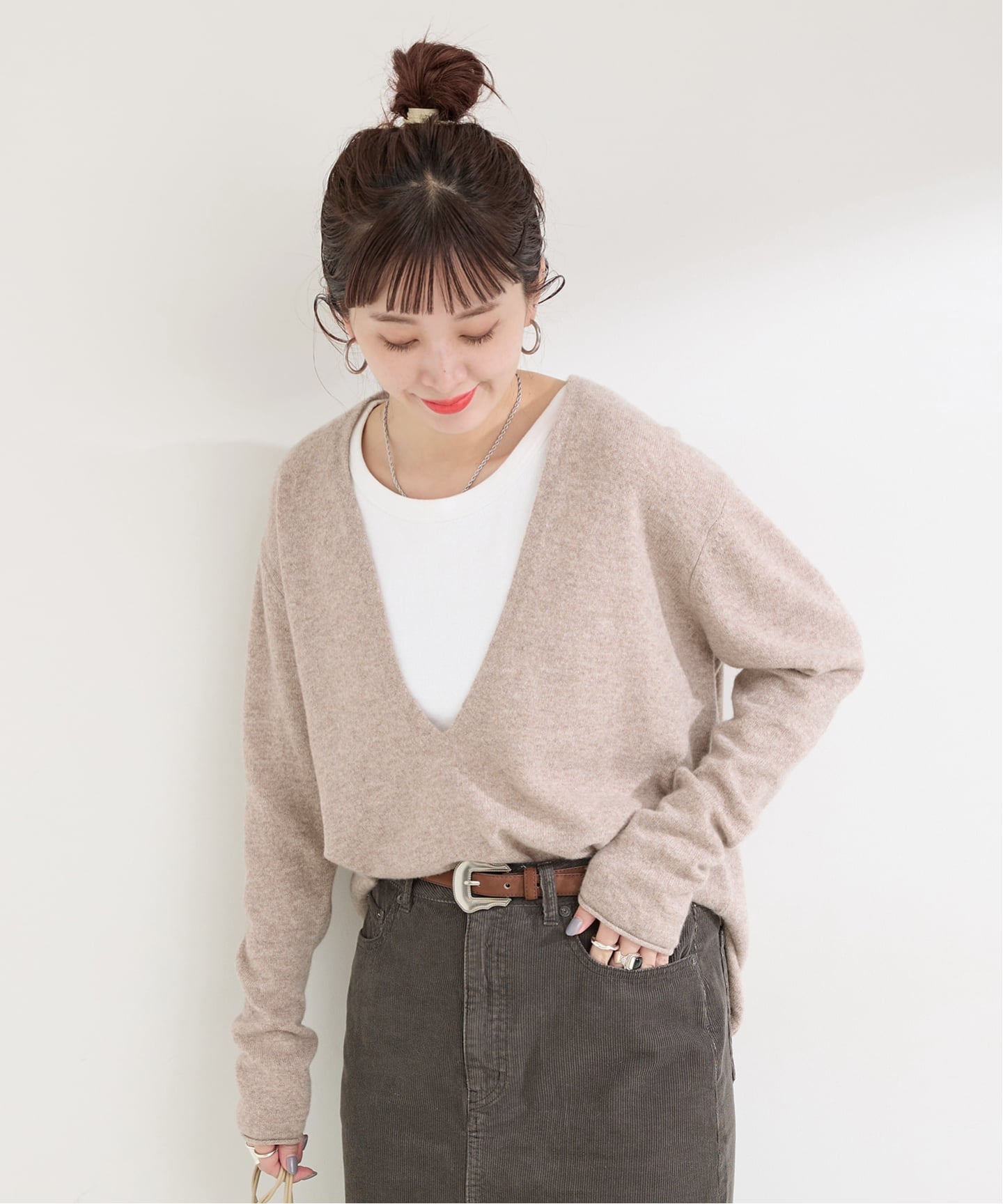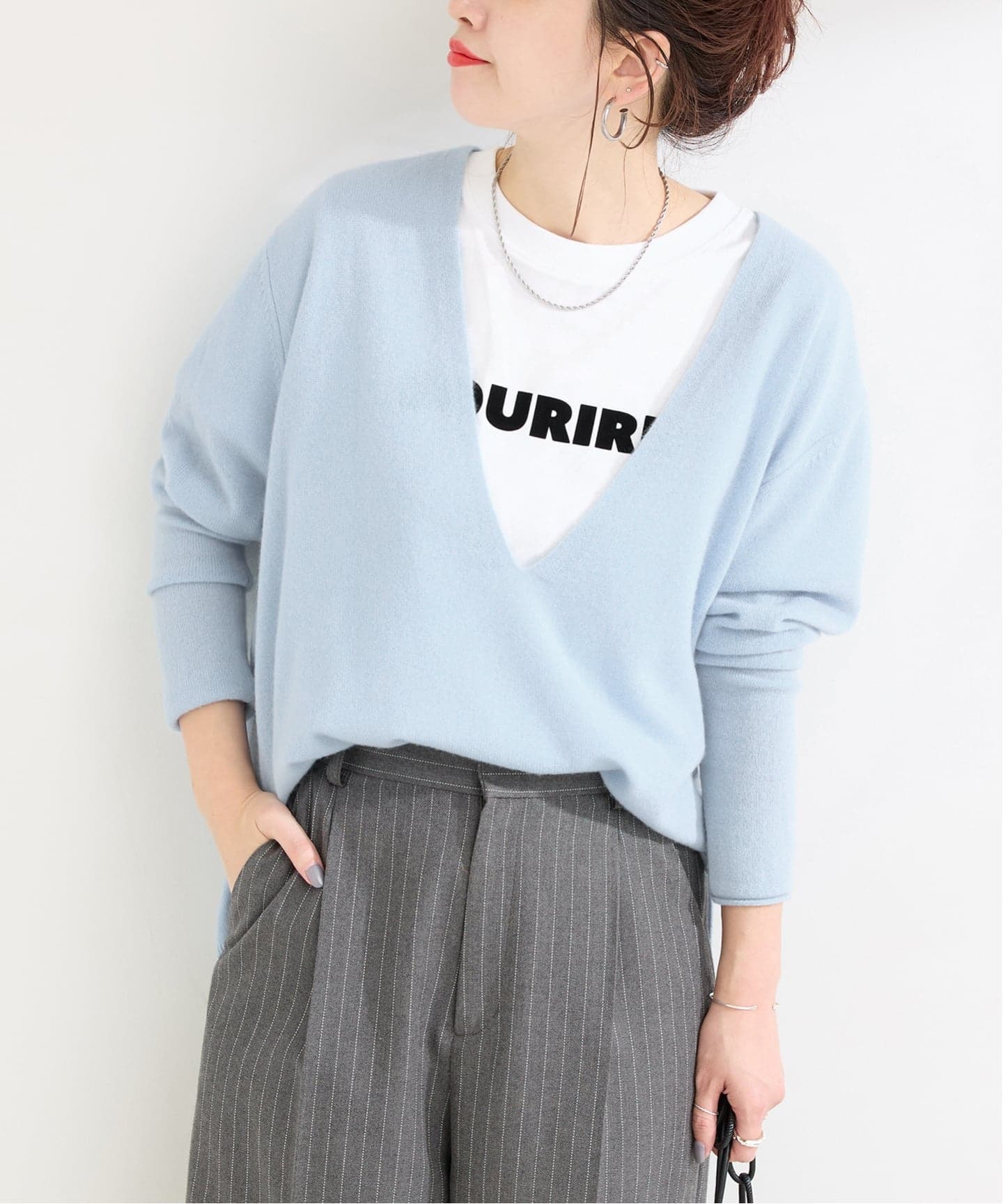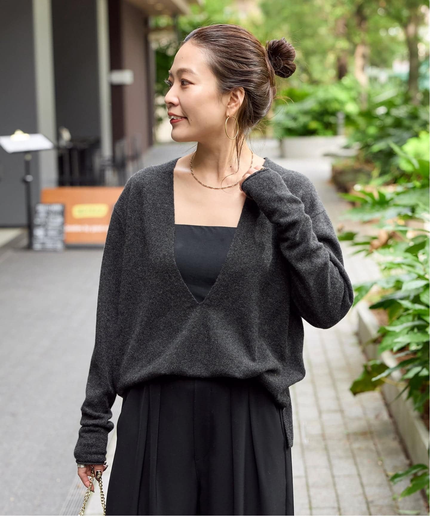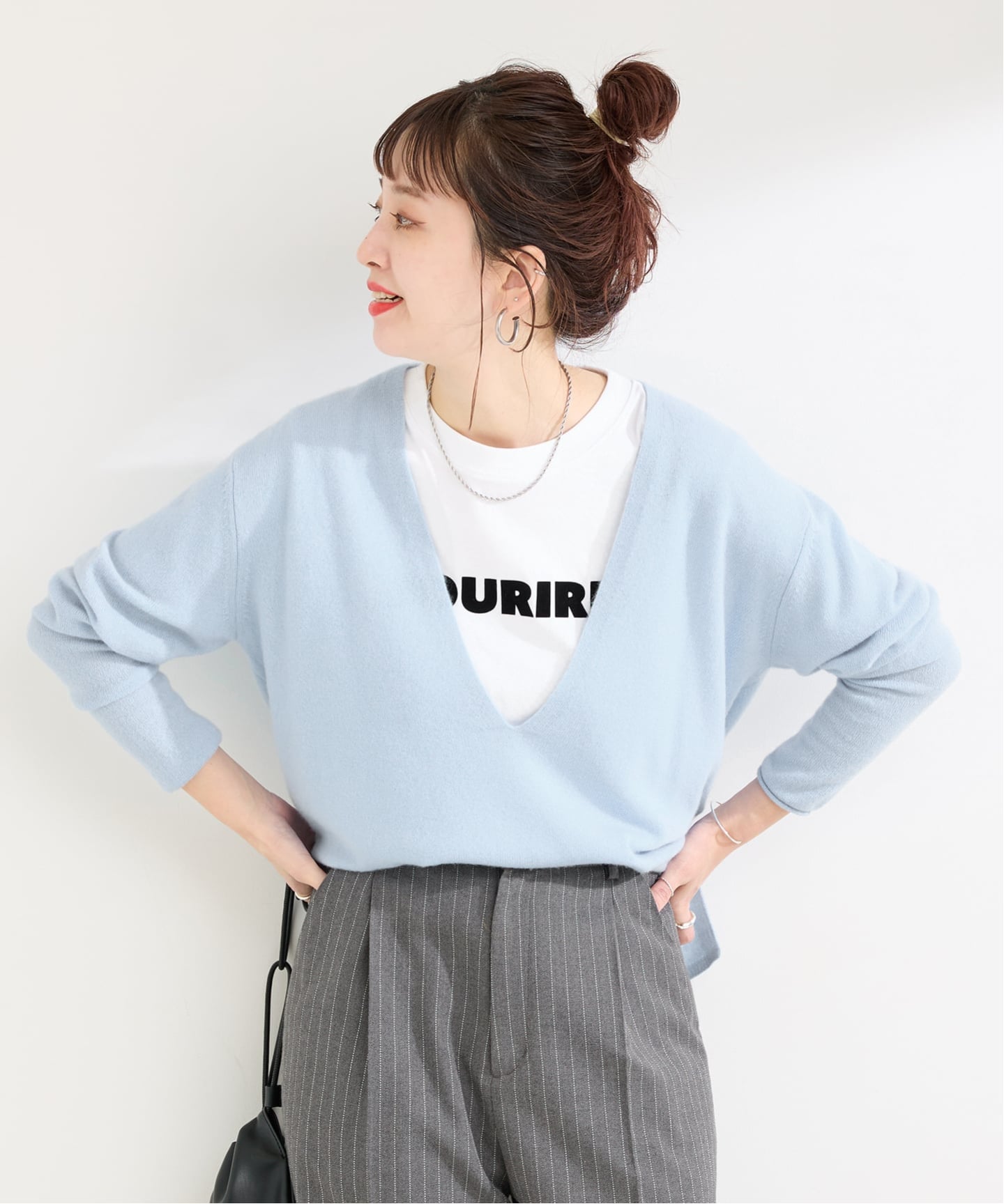 深いVネックで程よくデコルテを見せる上品さが魅力のカシミヤニット。