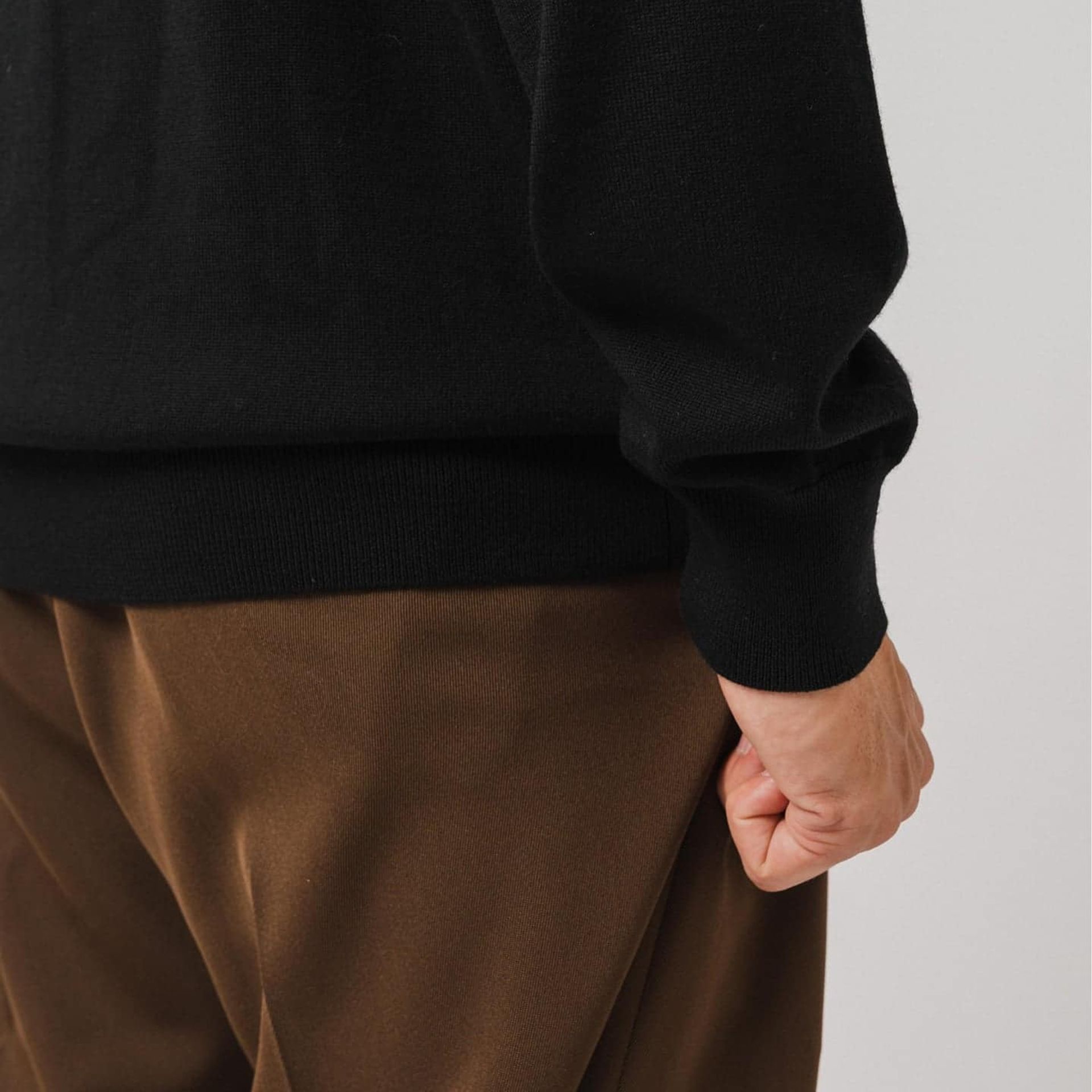 家庭での水洗いが可能で、アンチピリング性も高くジャケットやアウターのインナーでも着用しやすい程よいゆとりのあるサイズ感です。着用感は目の詰まったクリアな表面感、ソフトでしなやかな風合いから普段ニットが苦手な方からも称賛のお声を頂いています。