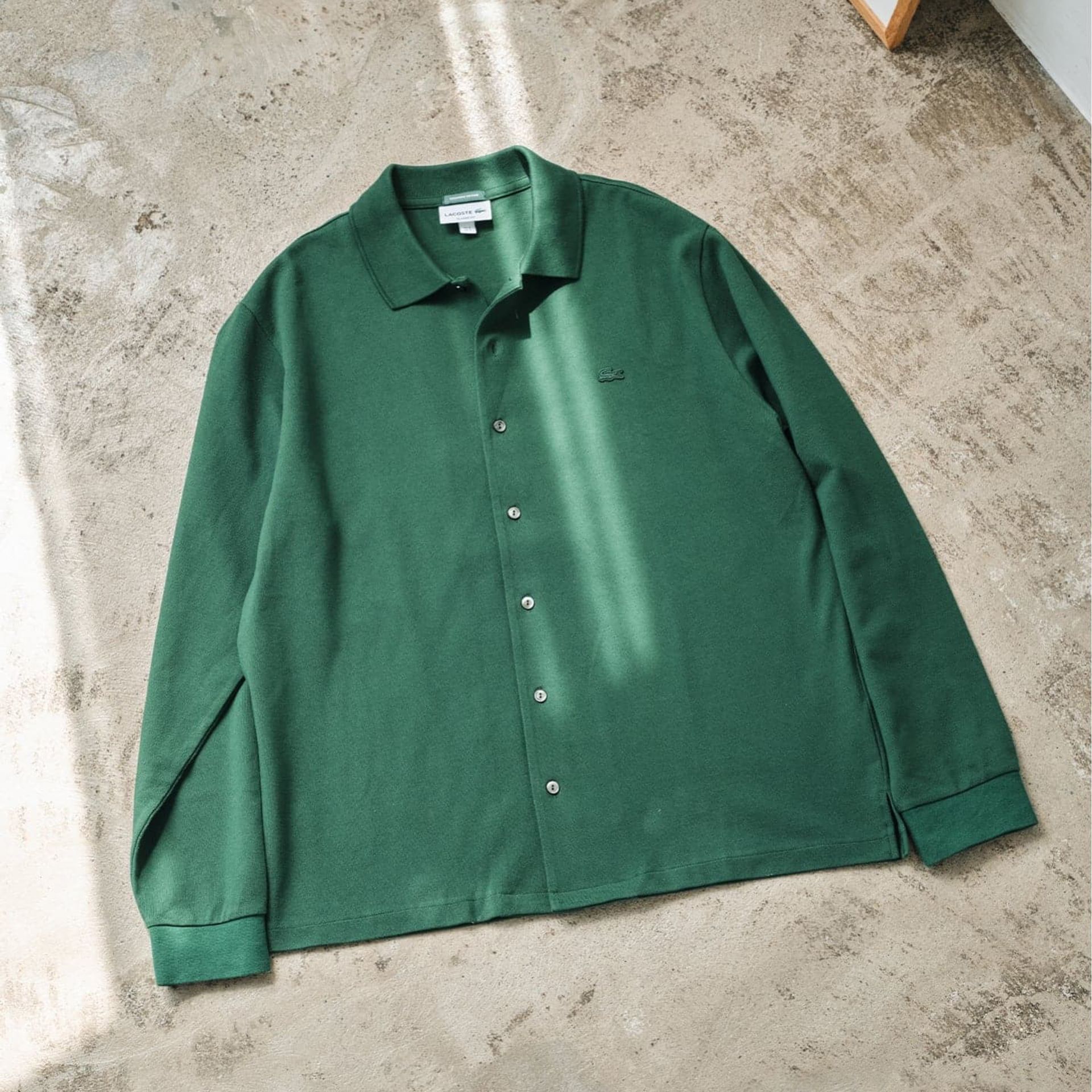 ヴィンテージLACOSTEを着想源に、現代的なフルオープン仕様へとアレンジすることで、1枚着・羽織り・インナーと幅広い着こなしに対応できる万能な一着に仕上げました。長袖ポロにありがちな重たさを感じさせないよう、サイジングやボタン数、袖のバランスまで細かく調整。シンプルで上品、ほどよい抜け感を備えた大人に似合うデザインです。