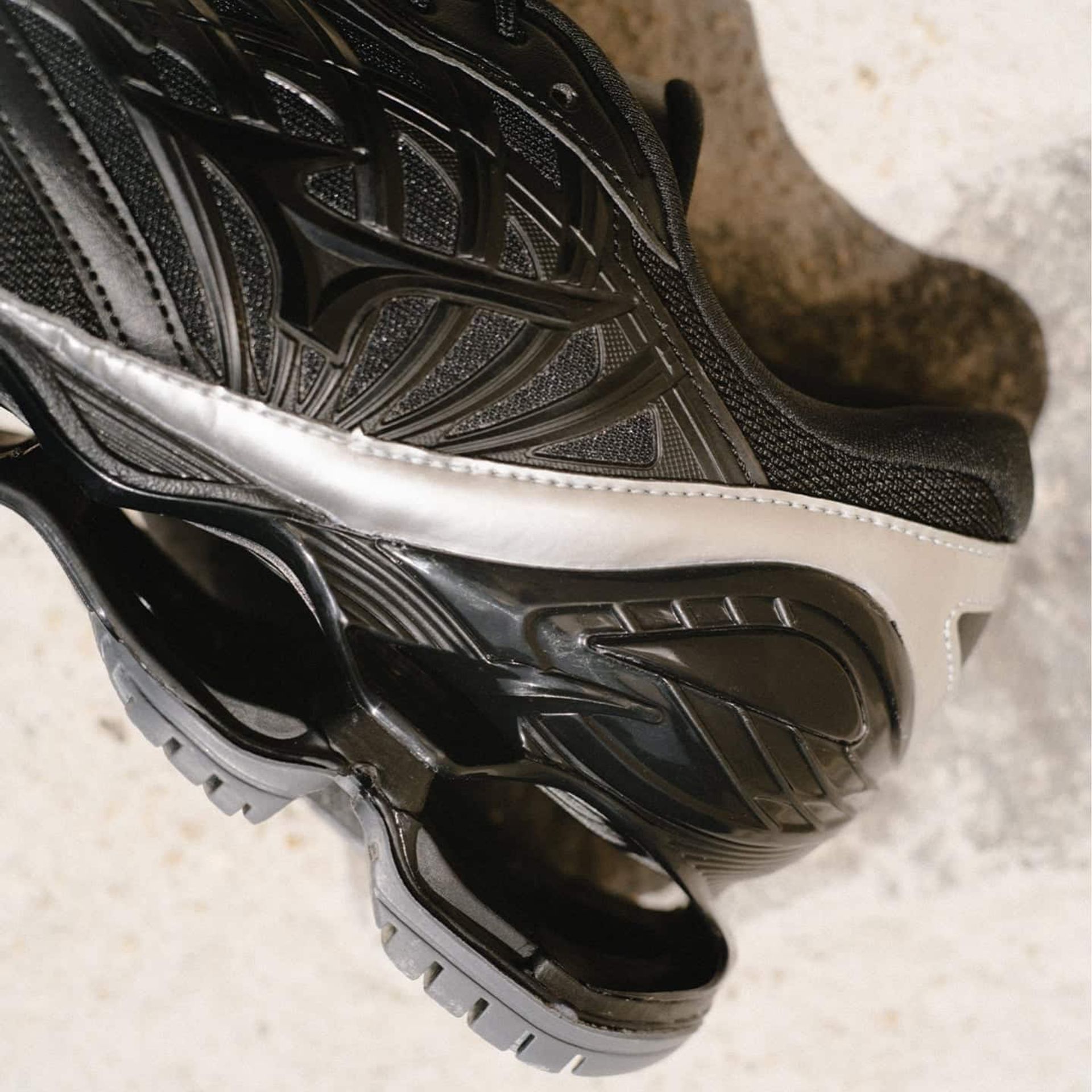 フランス映画のモノクローム世界を落とし込んだ配色、石畳をイメージしたインソール、バンジーコード仕様など、アート性と機能性を融合した特別デザインです。ハイテクソール「INFINITY WAVE」による唯一無二の存在感と、EDIFICE / IENA、ヘリンボーン フットウェアが手掛けた洗練されたスタイルが魅力。