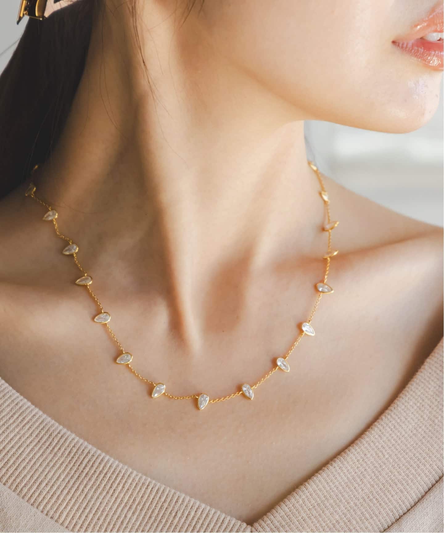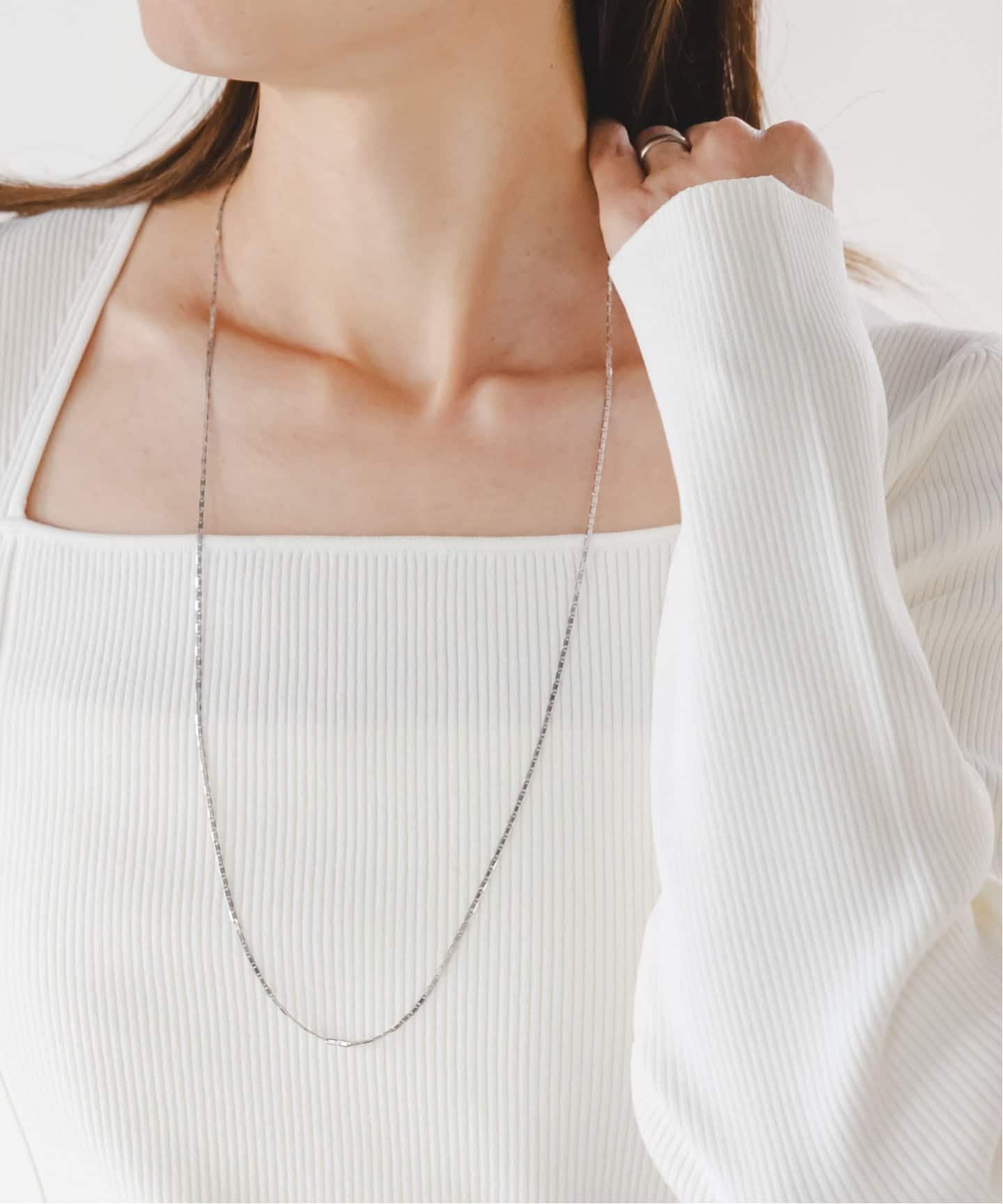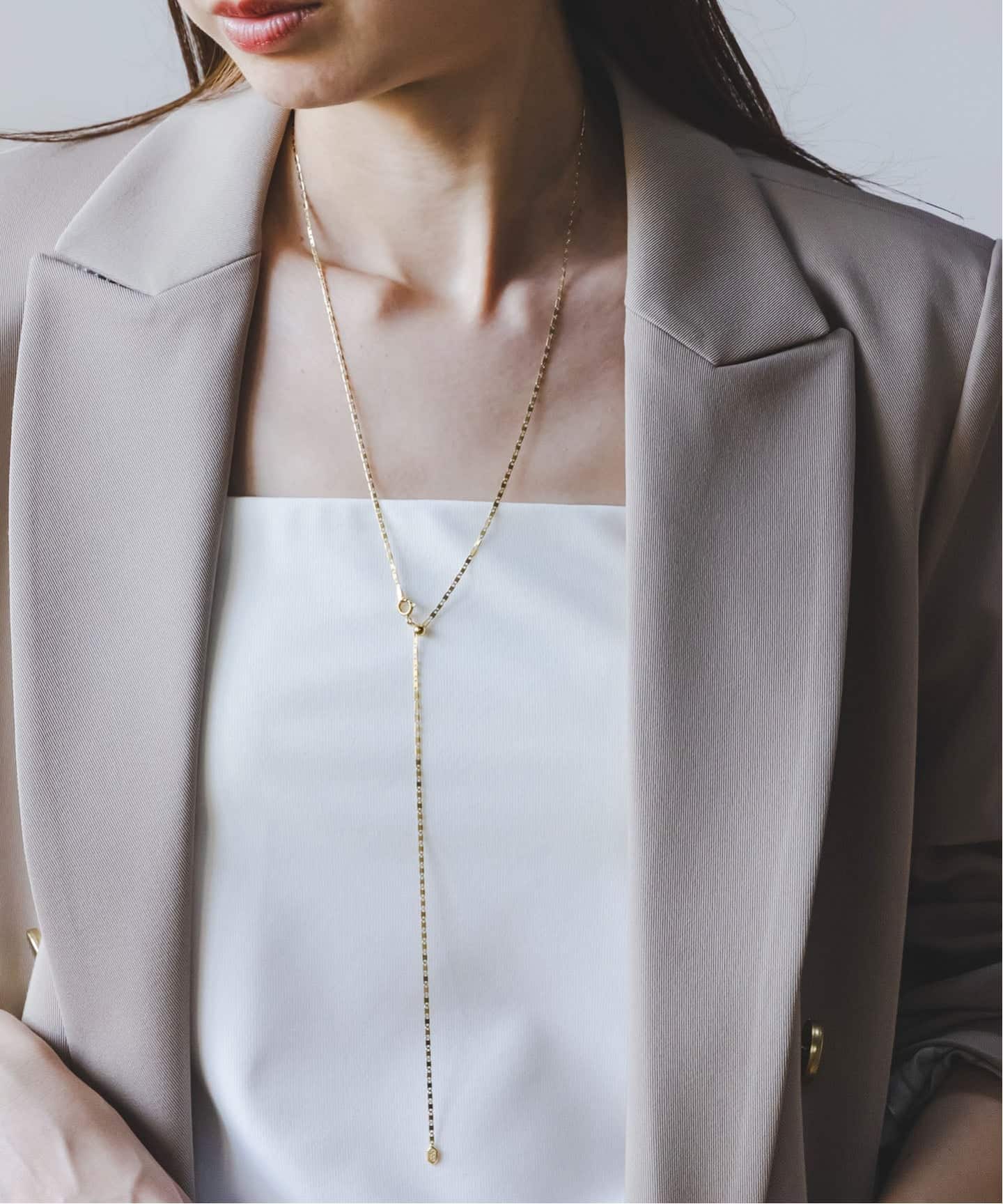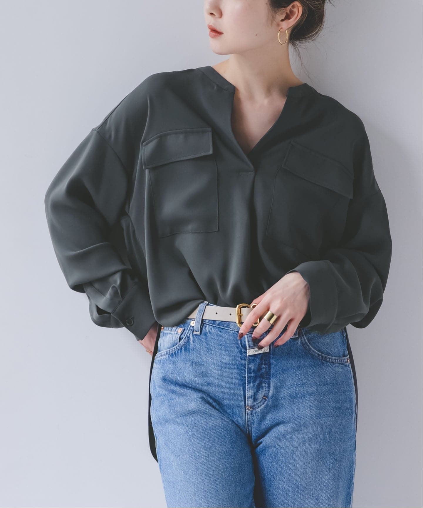 メンズライクなディテールを採用しながらもやや深めに開いたVネックで、すっきりと女性らしく着こなせるのが嬉しい。