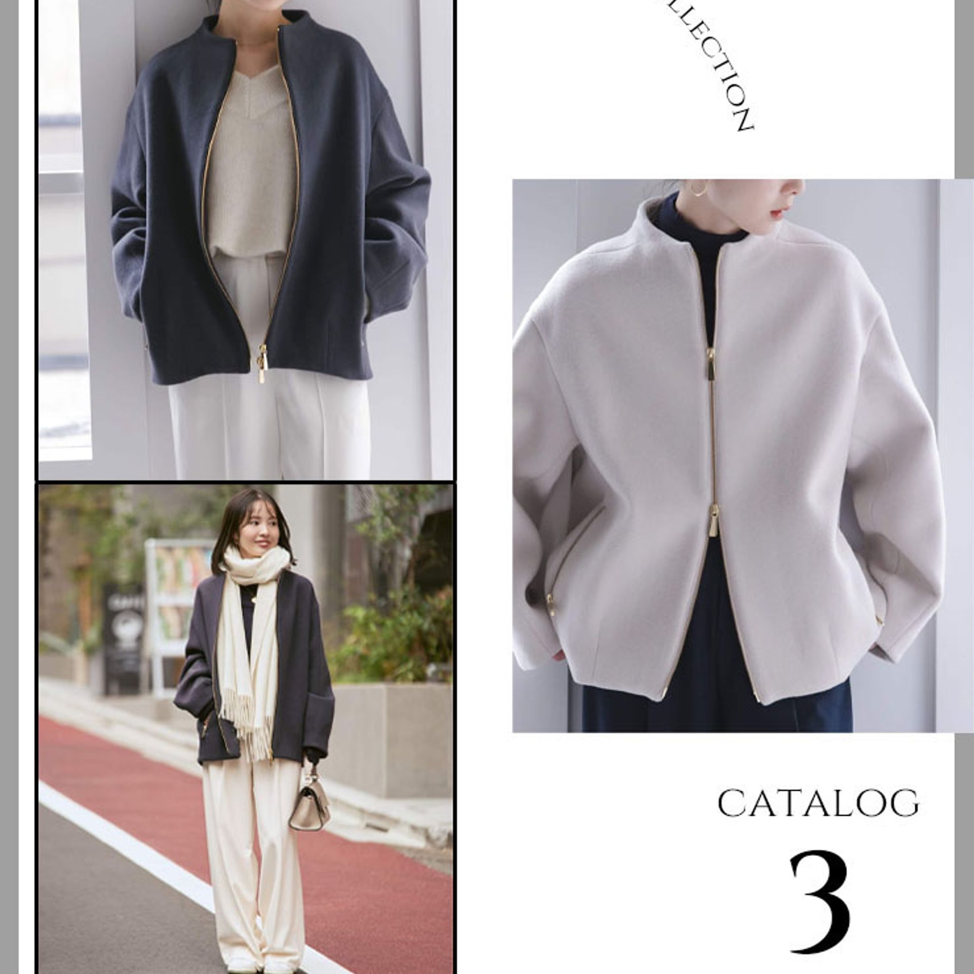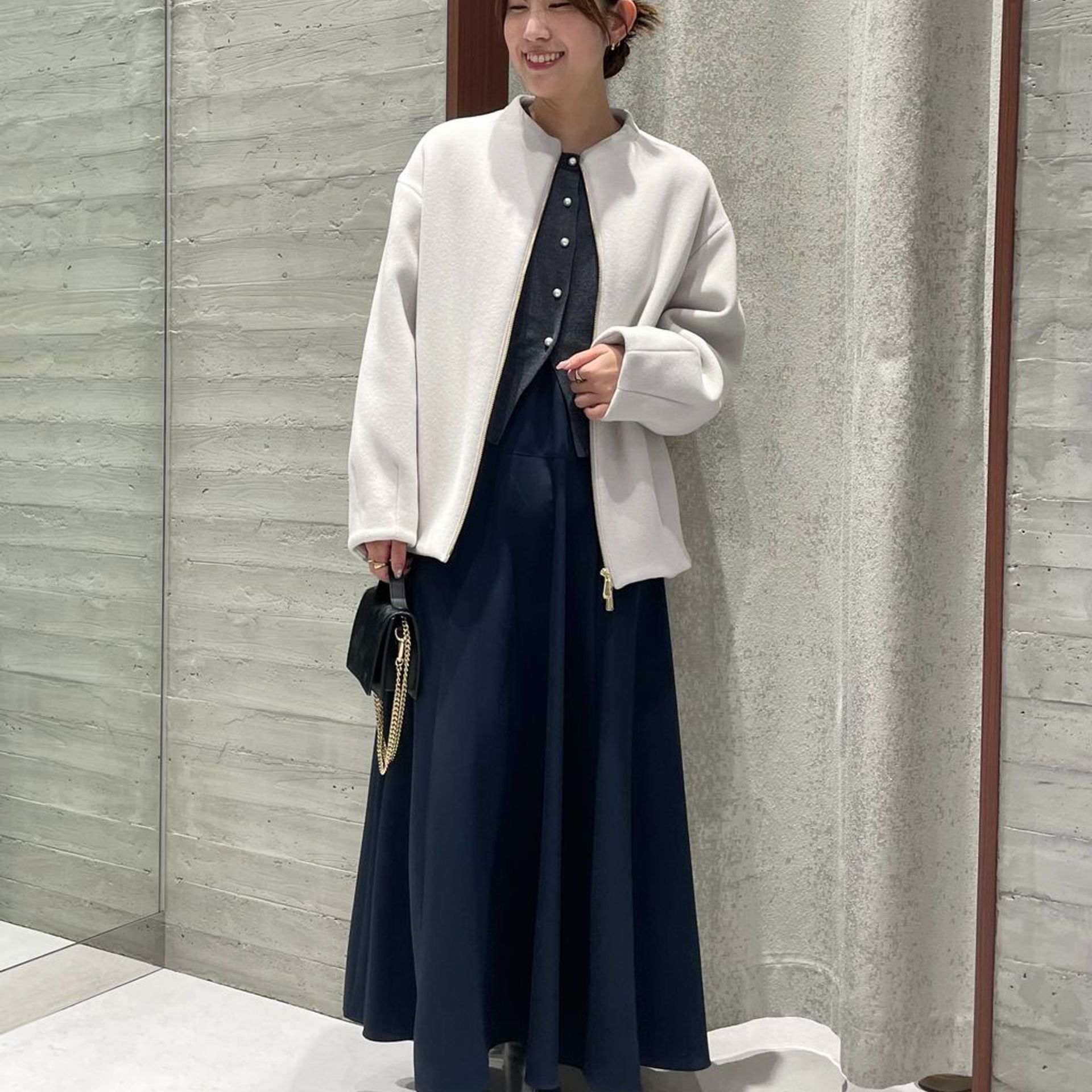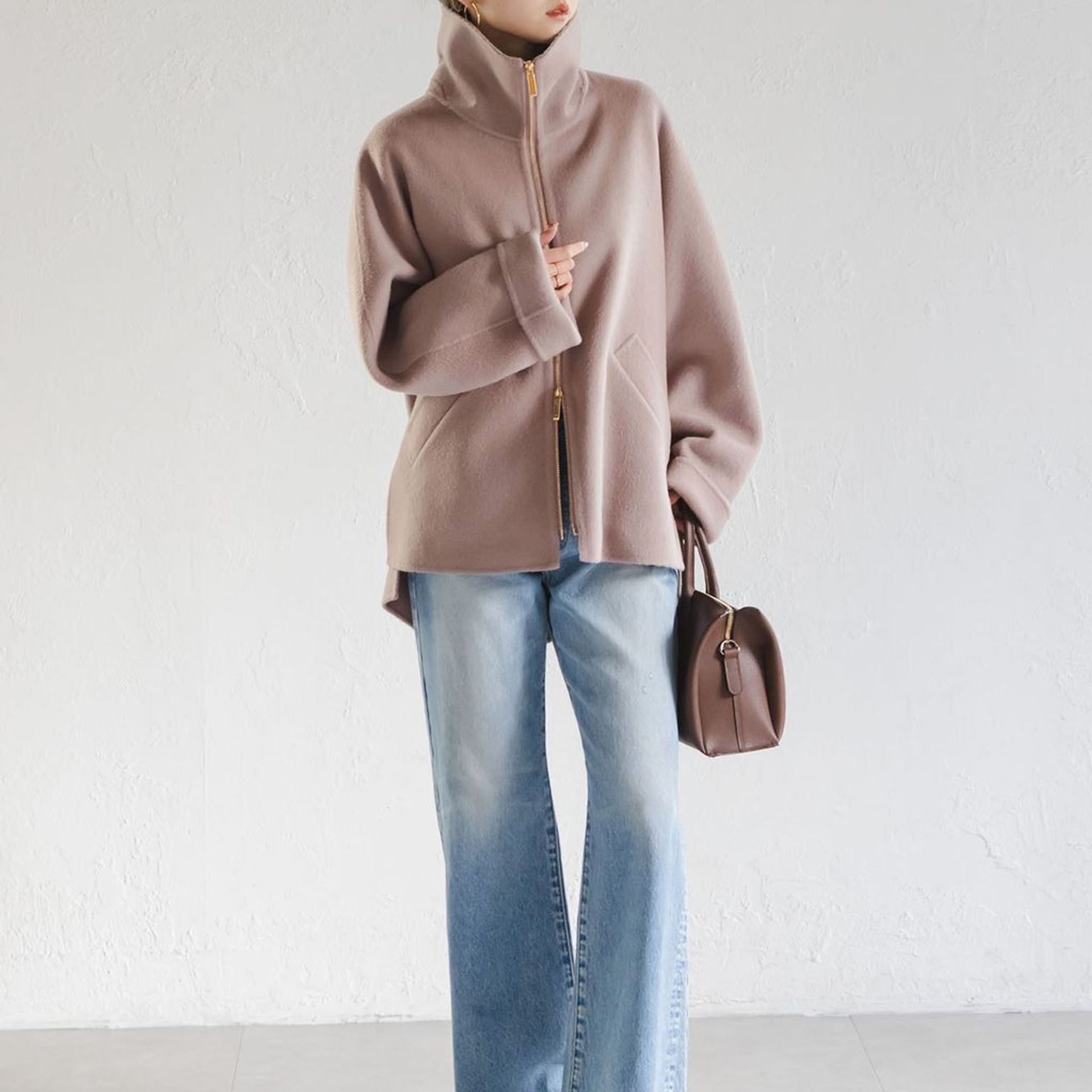 ダブルジップなので下を少し開けて、抜け感をプラスしたのもポイントです。