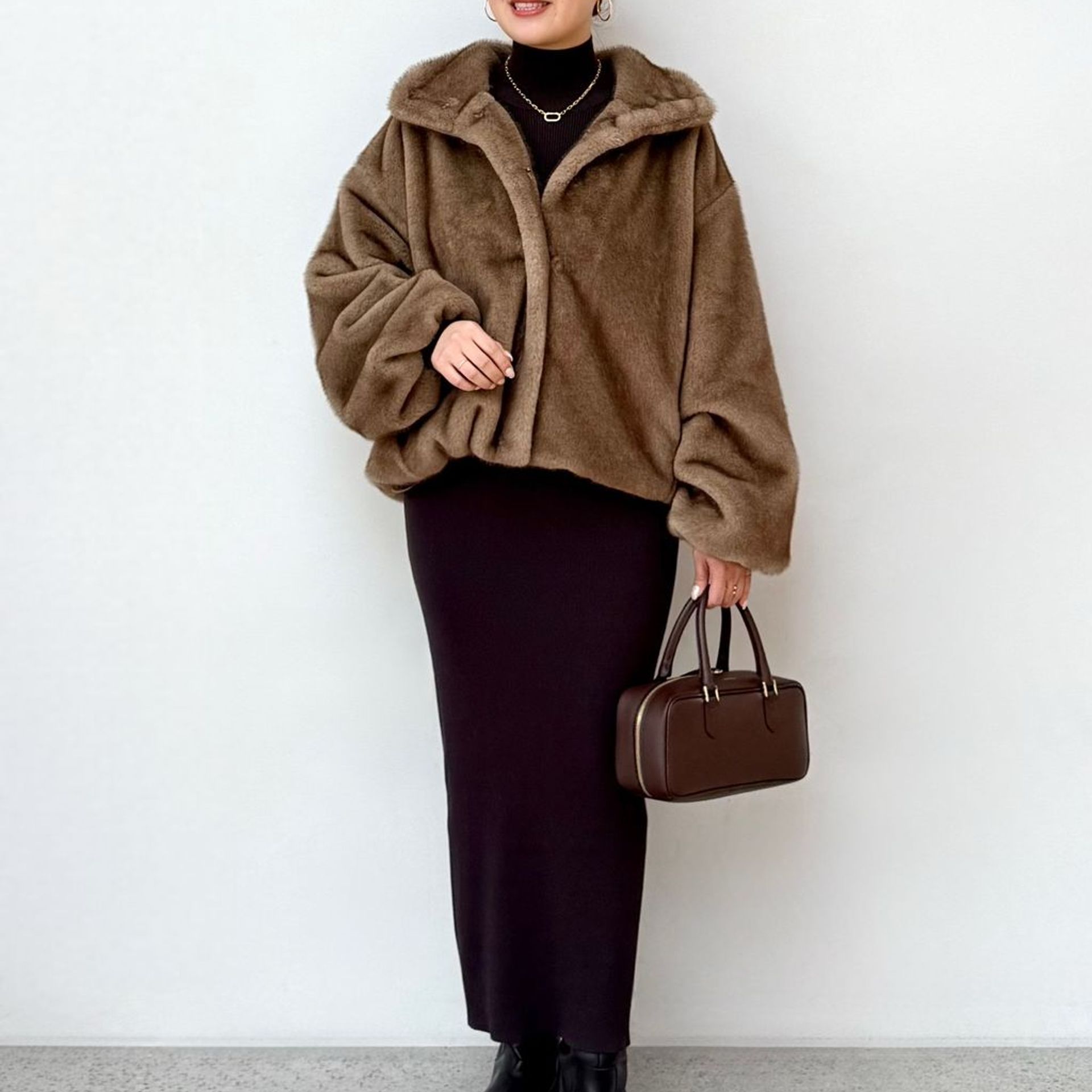 ホワイト×ブラウンで作る冬の王道フェミニンコーデ。