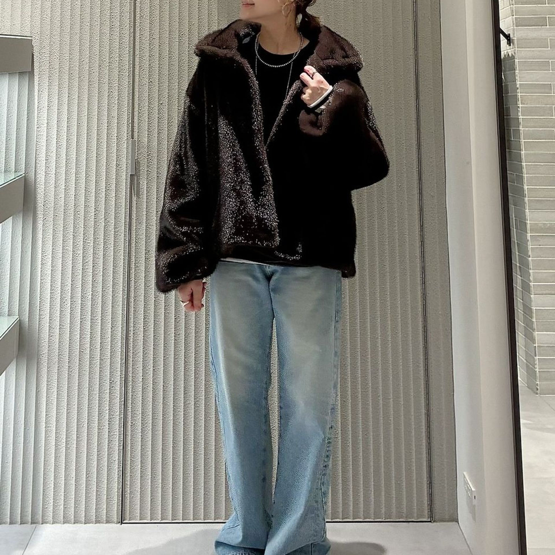高級感溢れるファーコートは、デニムと合わせて肩の力が抜けたリラックス感のあるスタイリングに。