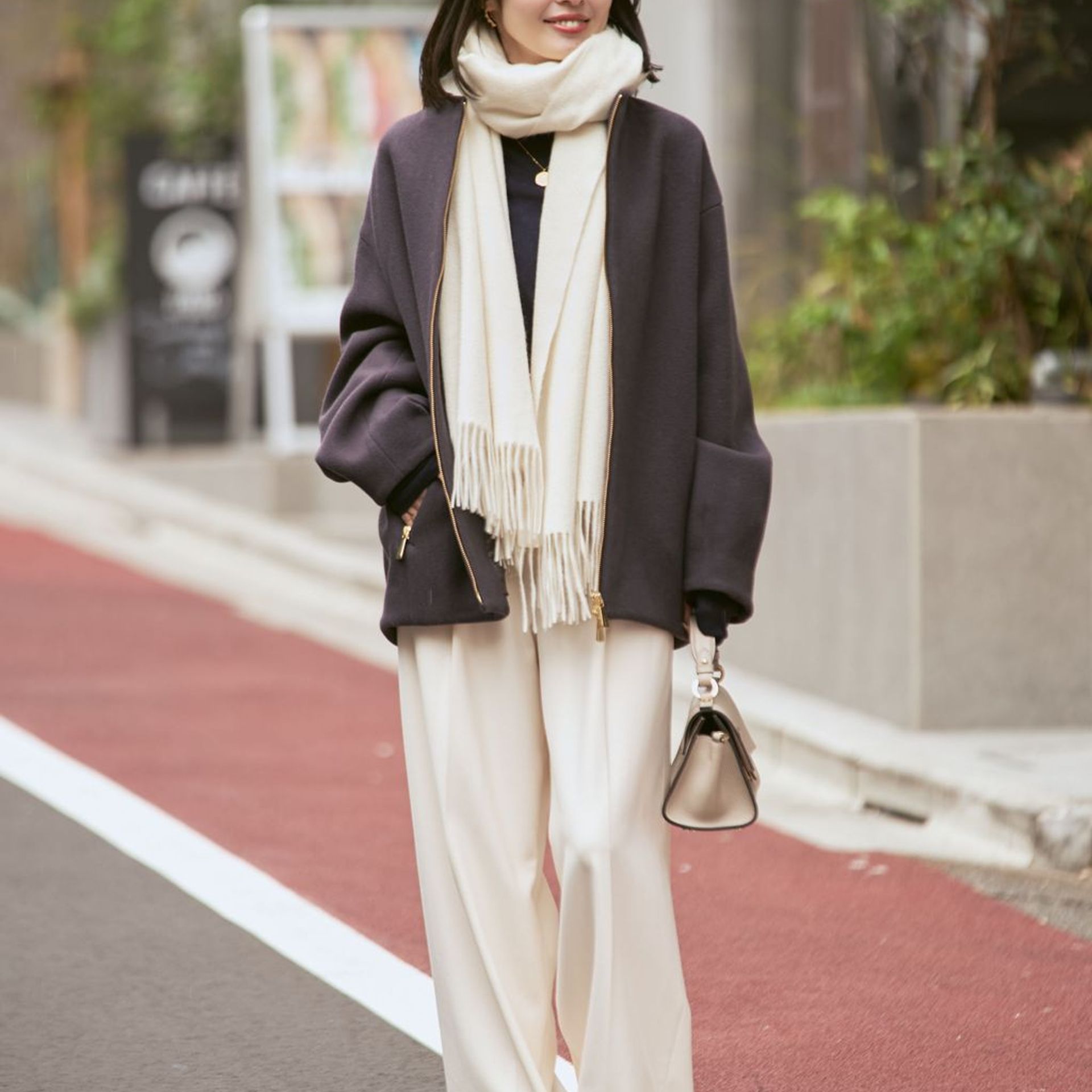 ボトムスが軽やかな風合いなので、オーバーサイズのアウターも重たく見えない◎